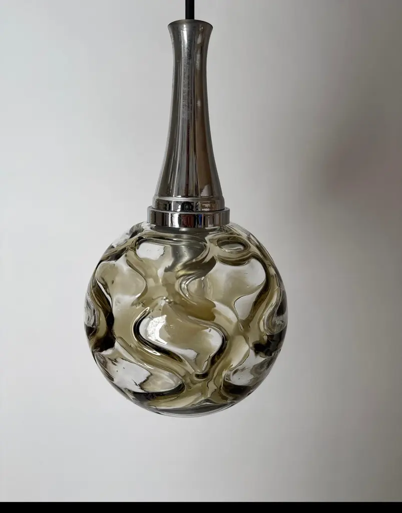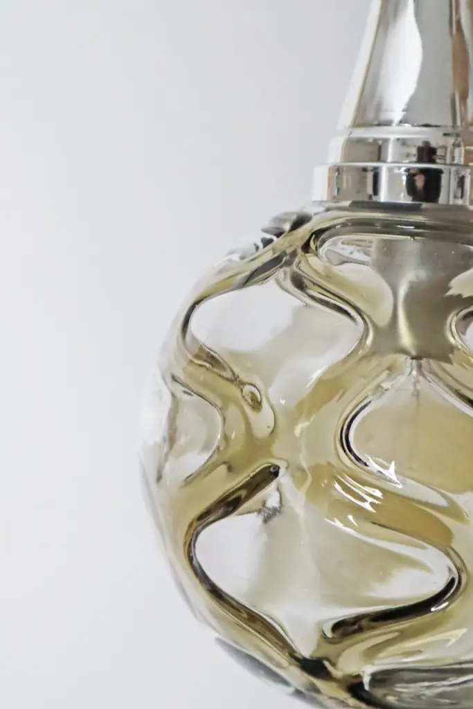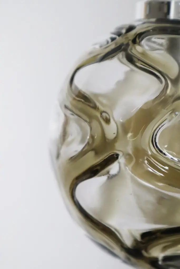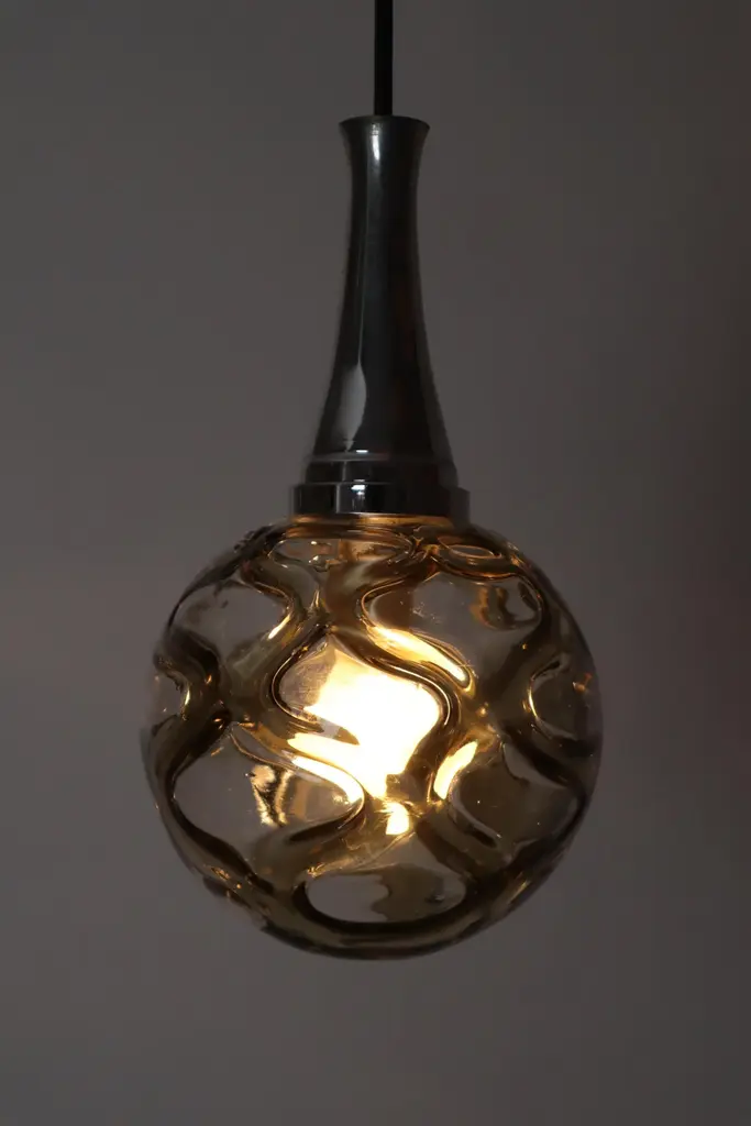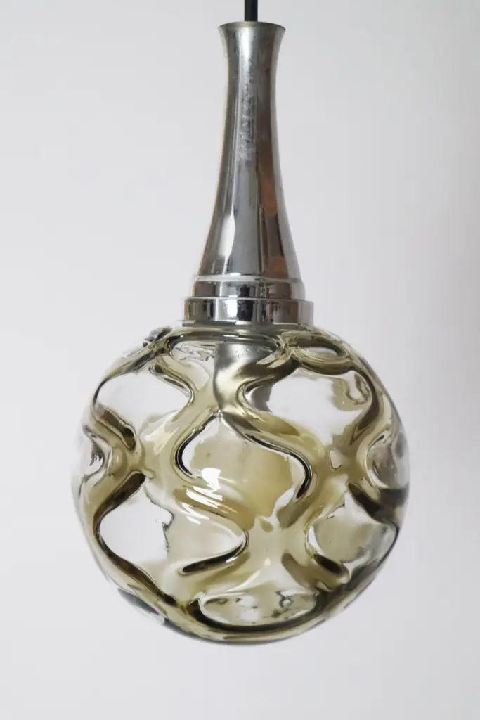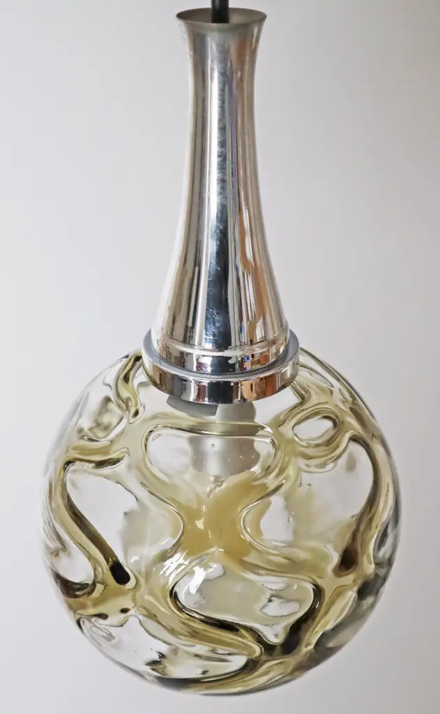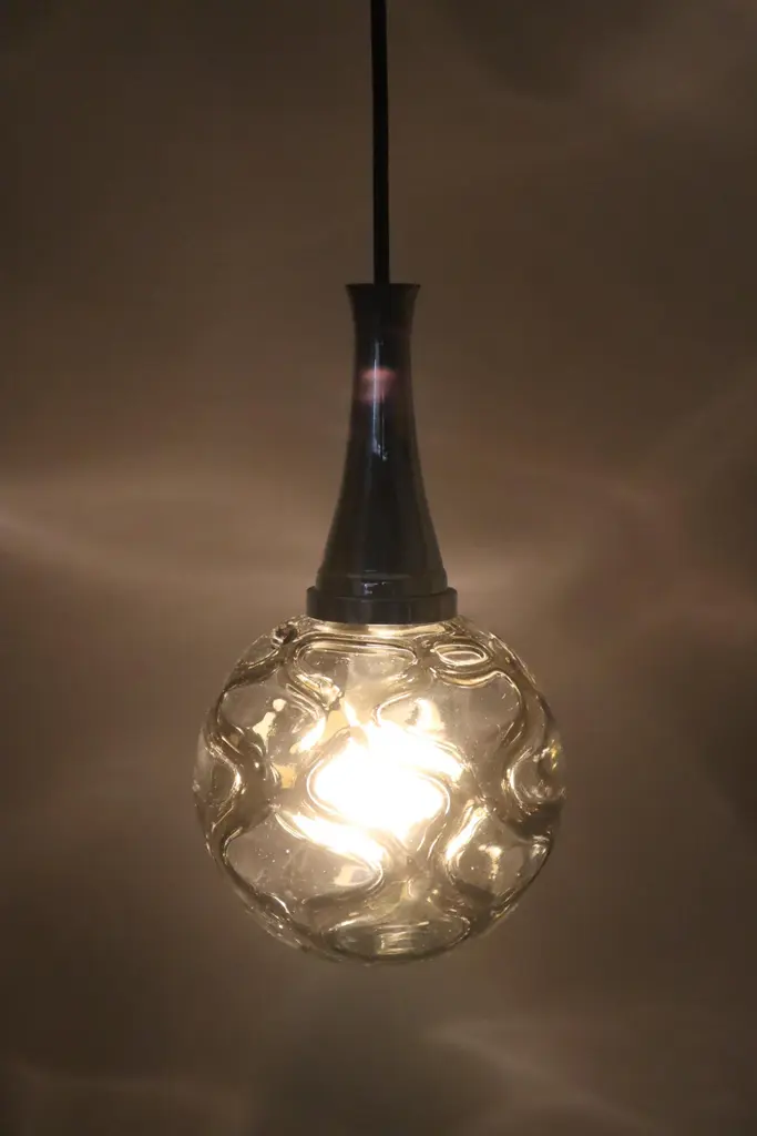 Beautiful handcrafted pendant lamp by Doria. This lamp is timelessly beautiful, the mouth-blown glass was made by master craftsmen, the decorations in a gray-green glass were applied by hand by the glass artist to the clear glass while it was still hot. The lamp has an E14 lamp socket. The light shines through the glass in a beautiful way if you use a clear glass bulb, it looks like water when the sun shines in, you will be amazed. Whether you take one lamp or several, ideal for example above the kitchen table or in the hallway, you will be amazed. Look forward to glass art from the 1960s in a masterly workmanship that is rarely found today. Perfect for your exclusive home.