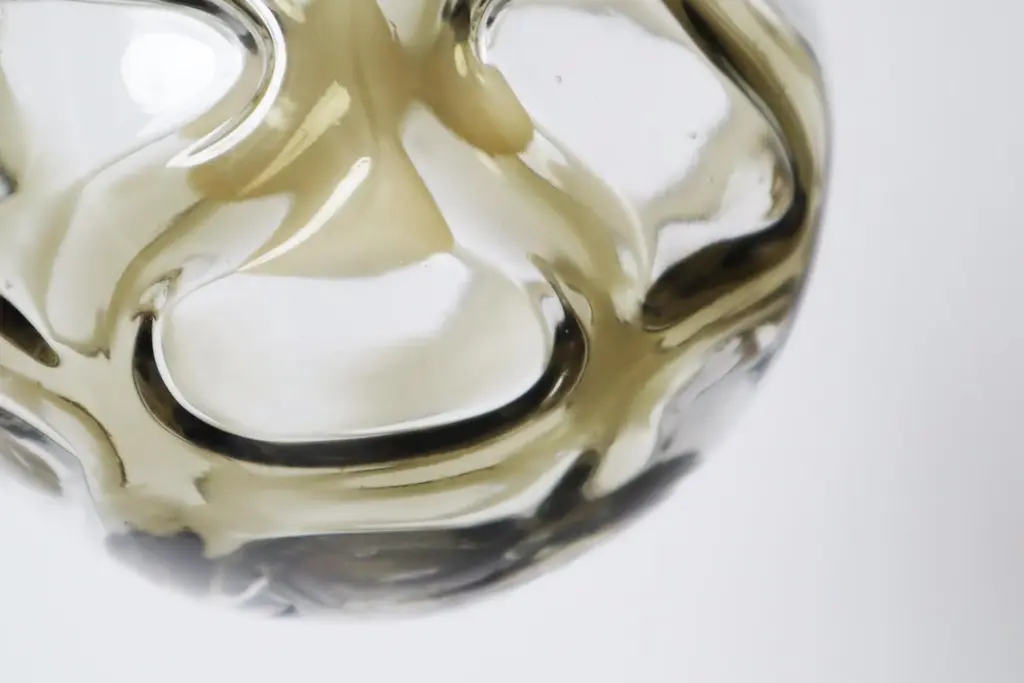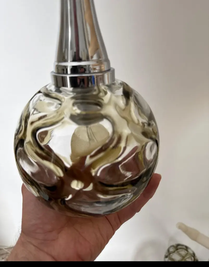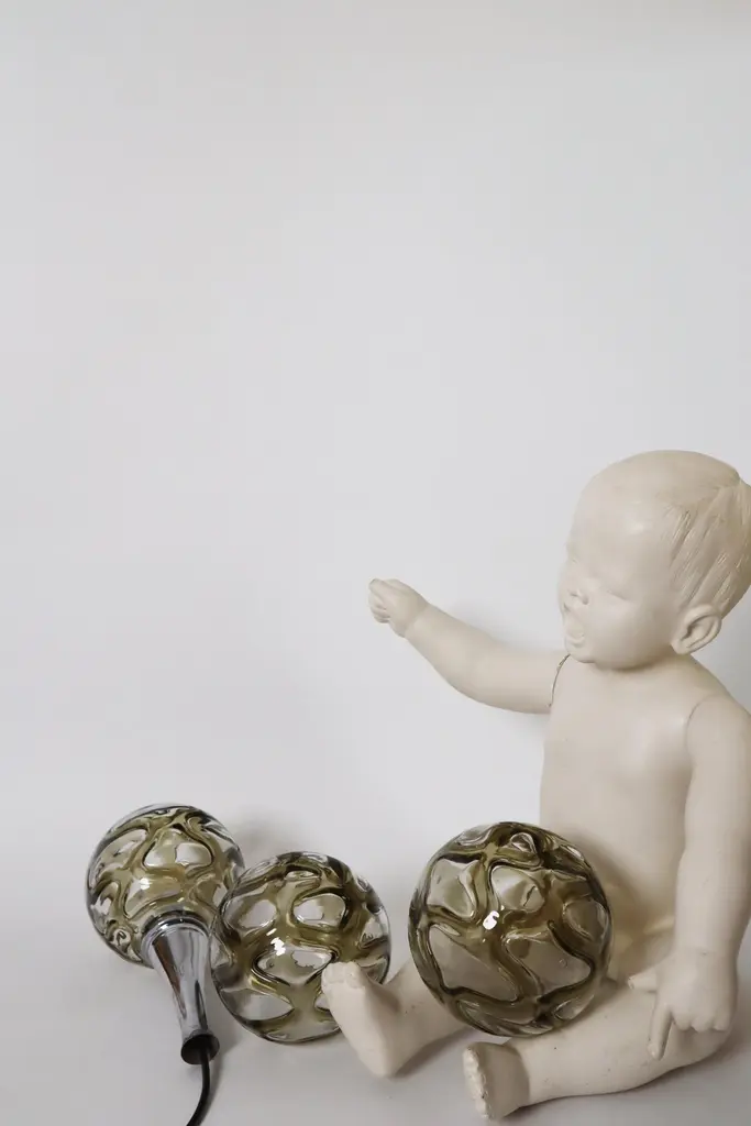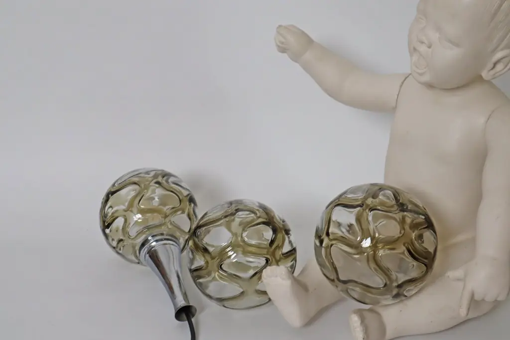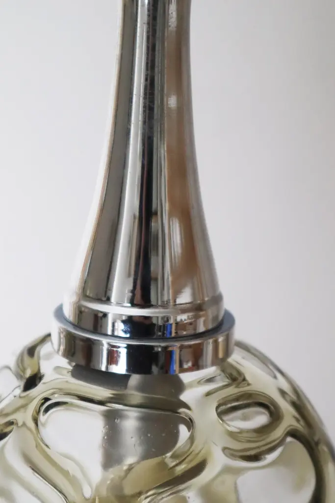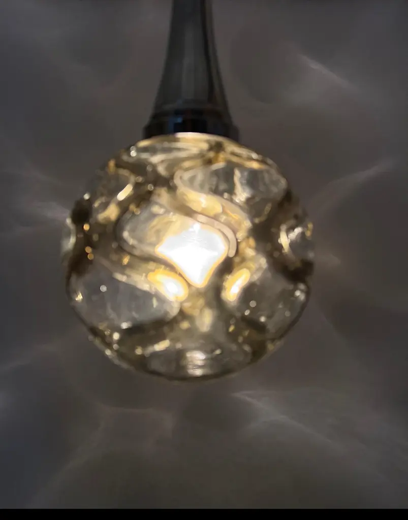 Beautiful handcrafted pendant lamp by Doria. This lamp is timelessly beautiful, the mouth-blown glass was made by master craftsmen, the decorations in a gray-green glass were applied by hand by the glass artist to the clear glass while it was still hot. The lamp has an E14 lamp socket. The light shines through the glass in a beautiful way if you use a clear glass bulb, it looks like water when the sun shines in, you will be amazed. Whether you take one lamp or several, ideal for example above the kitchen table or in the hallway, you will be amazed. Look forward to glass art from the 1960s in a masterly workmanship that is rarely found today. Perfect for your exclusive home.