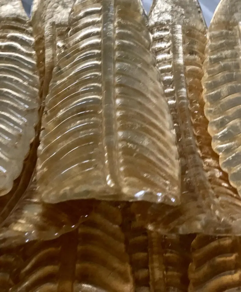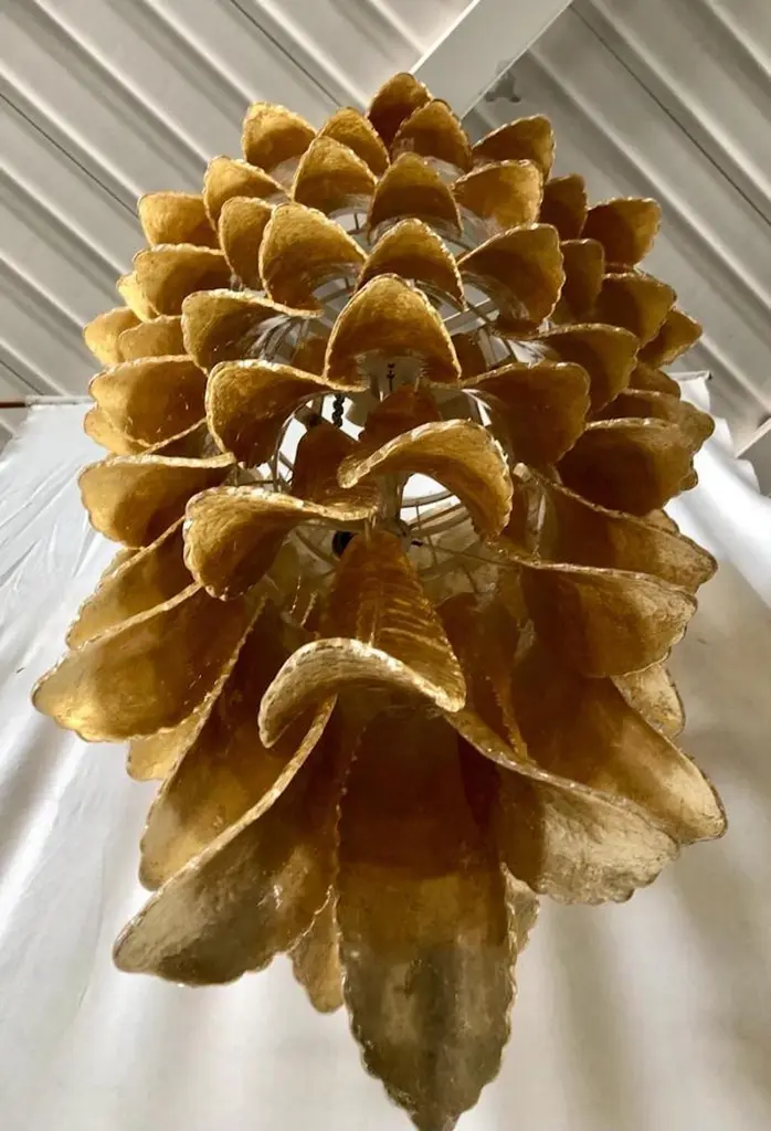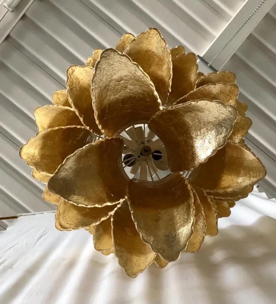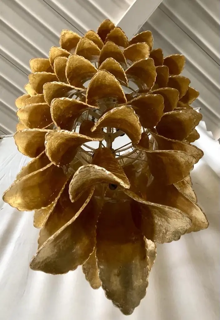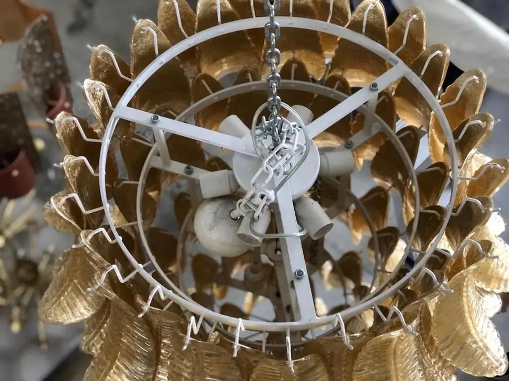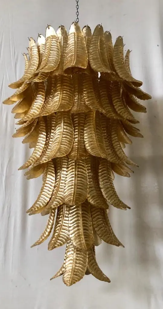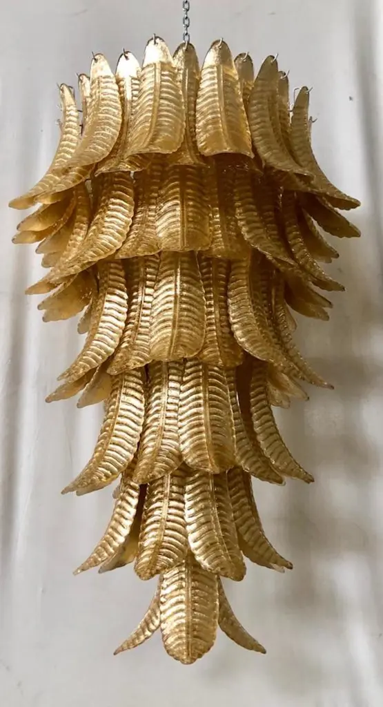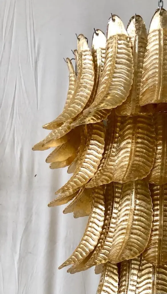A riot of leaves, with an elegant gold leaf color. Refinement and class as in the Murano style, unique pieces that always remain precious.Gold iron structure with Murano glass leaves all around, in a single color. The leaf has a curved structure and an elongated shape. The leaves alternate one on top of the other. The chandelier thus takes the shape of a cascade of leaves, which start from the top and then become smaller and smaller towards the bottom. There are six concentric circles that alternate from top to bottom along the gold iron structure. The structure of the first circle is very narrow, so as to reach the sixth circle which is increasingly smaller and have a chandelier that is very elongated towards the bottom. The very beautiful and particular leaves, unique in their kind, have a very original and elegant color. When turned on, the chandelier is very bright as it is equipped with numerous light bulbs.Wear consistent with age and use. Each item offered by the HannauRoma warehouse is checked by our team of craftsmen. We guarantee a very high quality standard, ask our design specialists for detailed information.