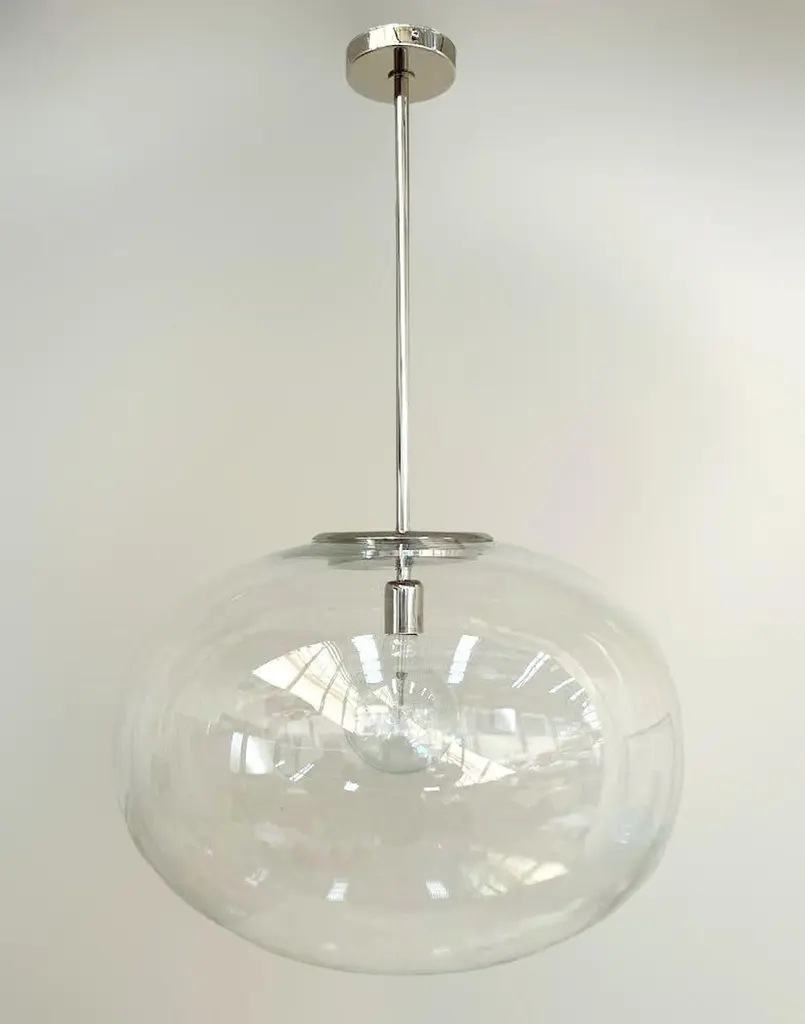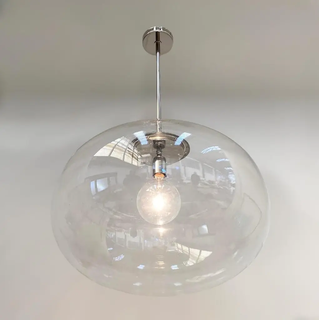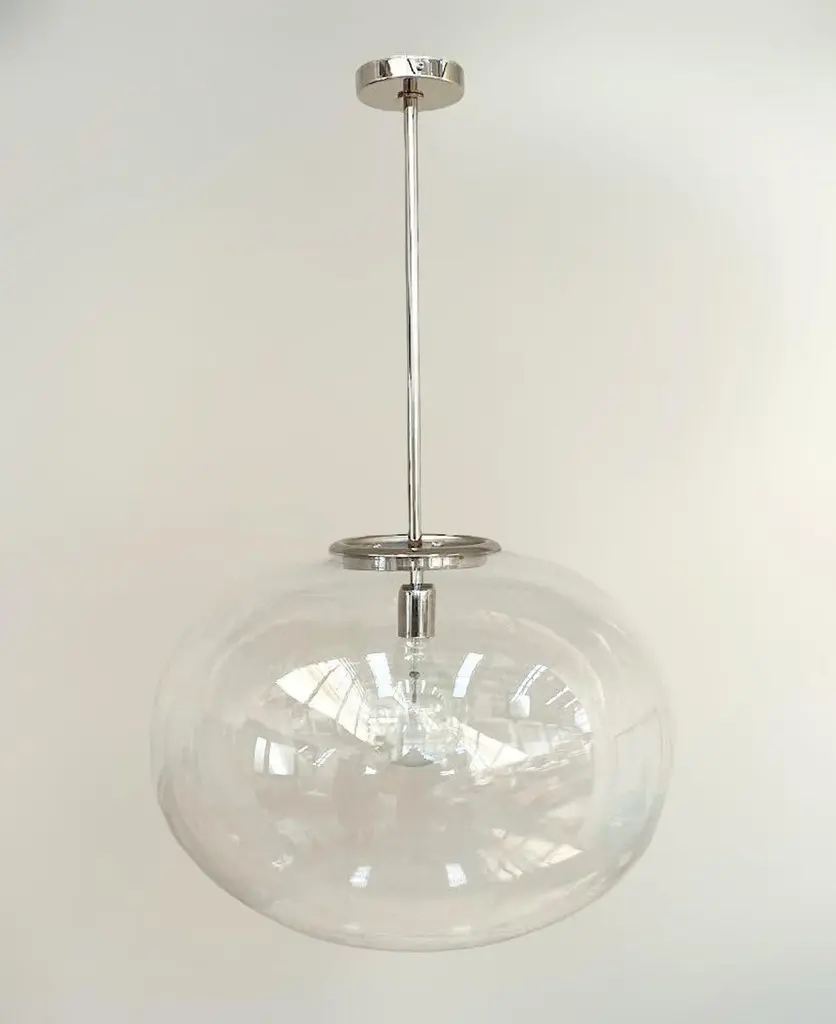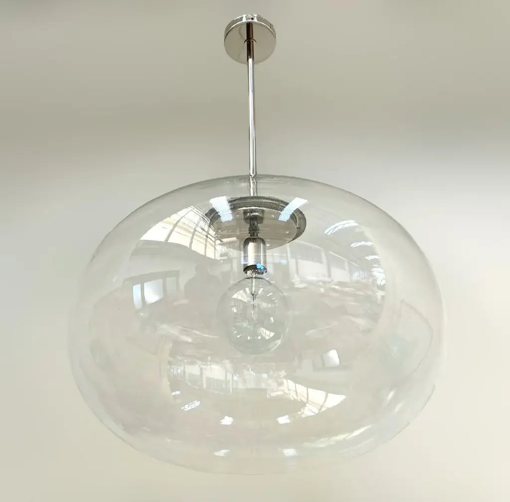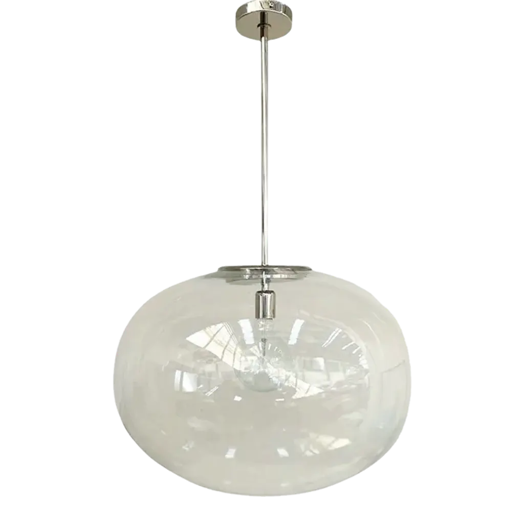 Italian pendant with a large clear Murano pebble glass shade mounted on brass frame / designed by Fabio Bergomi for Fabio Ltd / Made in ItalyMeasures: Diameter 23.5 inches, height 35.5 inches including rod and canopy1 light / E26 or E27 type / max 60WOrder only / this item ships from ItalyOrder reference #: FABIOLTD C786 CLEARThe listed price applies to the following finishes : Bronzed, Polished Chrome, Satin Chrome, Polished Nickel, Satin Nickel, Polished Black Nickel, Satin Black Nickel, Polished Copper, Satin CopperOther finishes are available : Unlacquered Natural Brass, Unlacquered Polished Brass, Lacquered Polished Brass, Lacquered Satin Brass