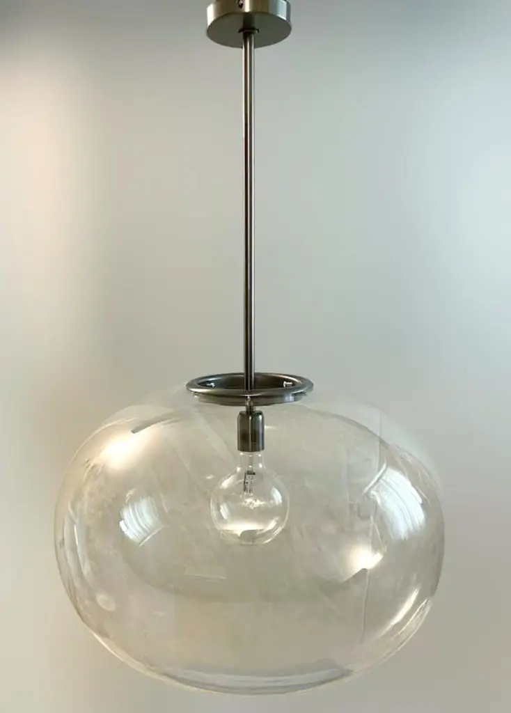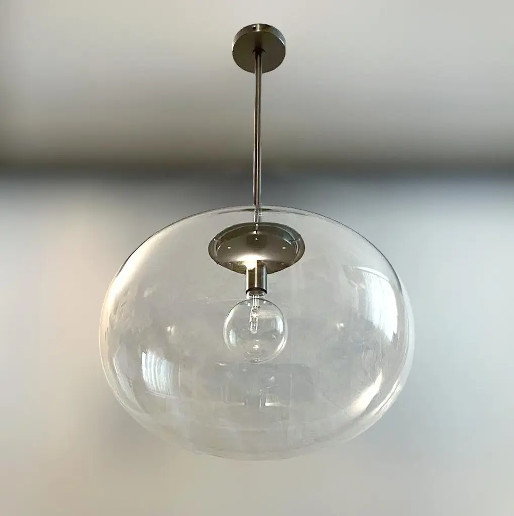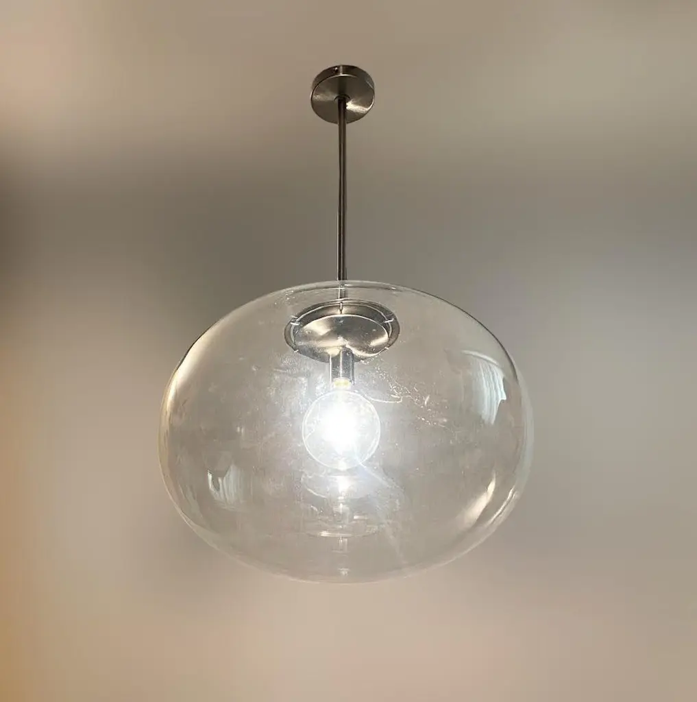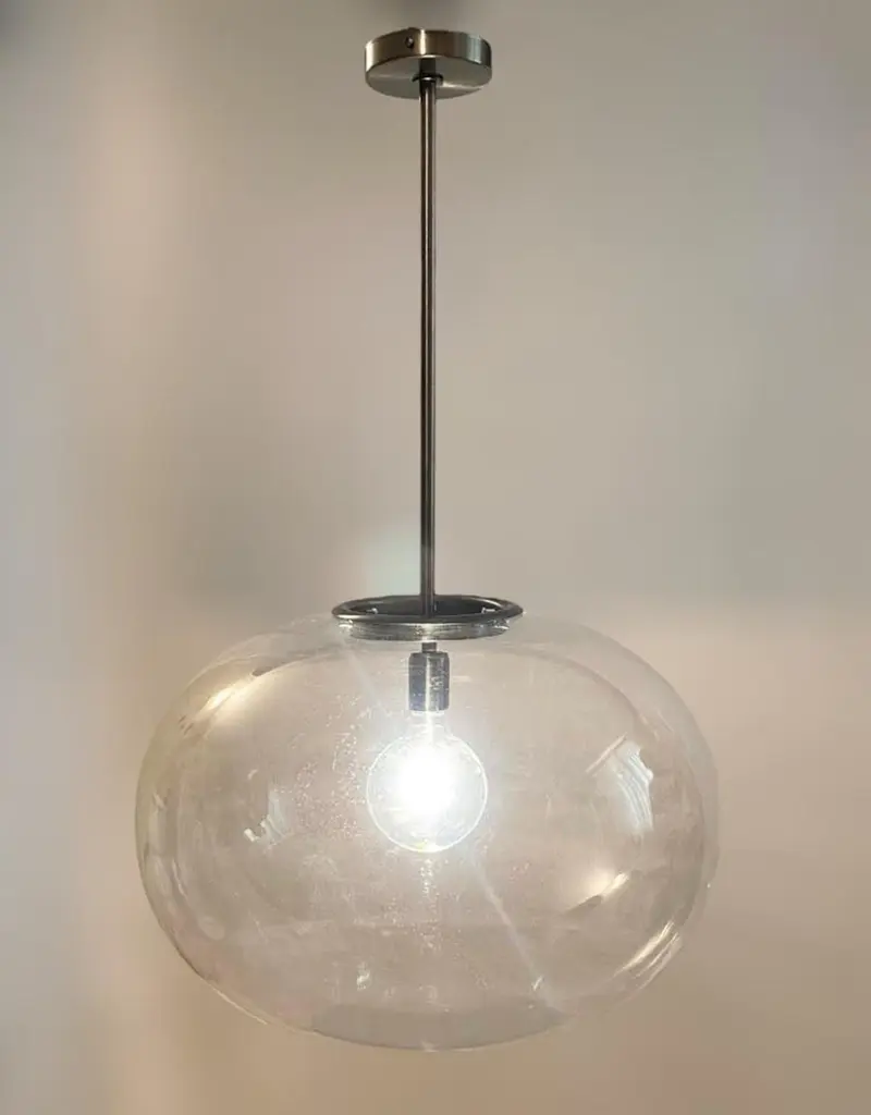 Italian pendant with a large clear Murano pebble glass shade mounted on brass frame / designed by Fabio Bergomi for Fabio Ltd / Made in ItalyMeasures: Diameter 23.5 inches, height 35.5 inches including rod and canopy1 light / E26 or E27 type / max 60WOrder only / this item ships from ItalyOrder reference #: FABIOLTD C785 CLEARThe listed price applies to the following finishes : Bronzed, Polished Chrome, Satin Chrome, Polished Nickel, Satin Nickel, Polished Black Nickel, Satin Black Nickel, Polished Copper, Satin CopperOther finishes are available : Unlacquered Natural Brass, Unlacquered Polished Brass, Lacquered Polished Brass, Lacquered Satin Brass