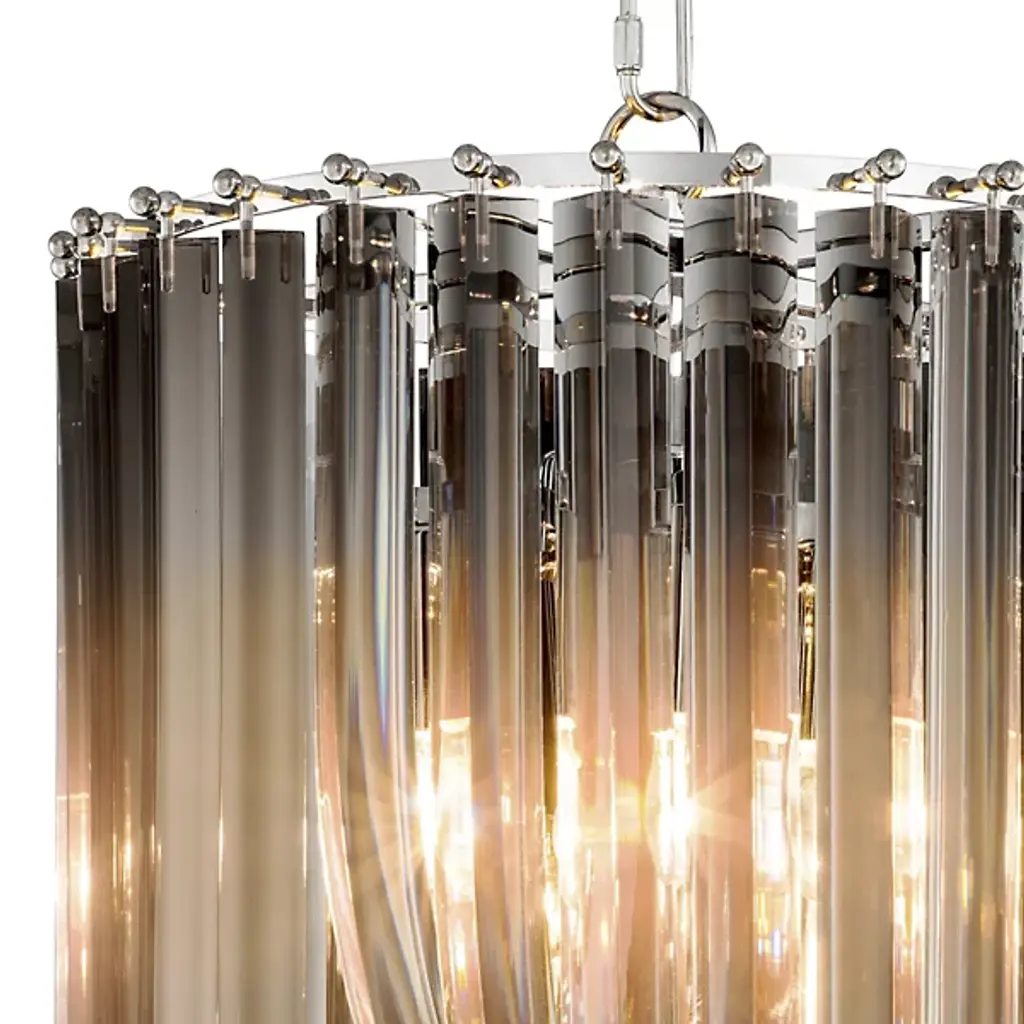 A tasteful twist on indoor illumination. The Murano Pendant from Eichholtz descends along a single chain to a round metal hub which incorporates a series of outward-radiating, evenly-spaced rods set around single-socket lamping. These rods support each end of an acrylic diffuser bar, each one slightly larger than its neighbors, and bent into a “U” shape that each rotates out around the lamping into a textured dome shape softening bright glare into a pleasing glow.