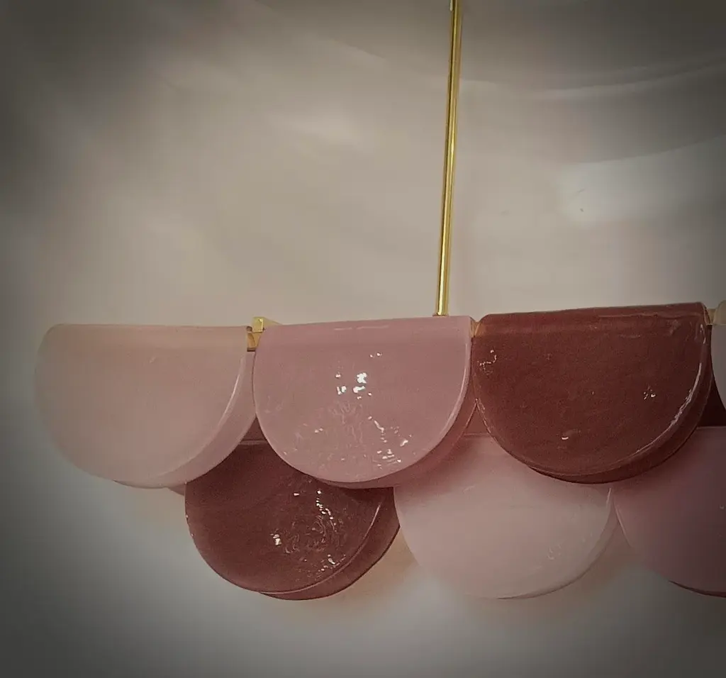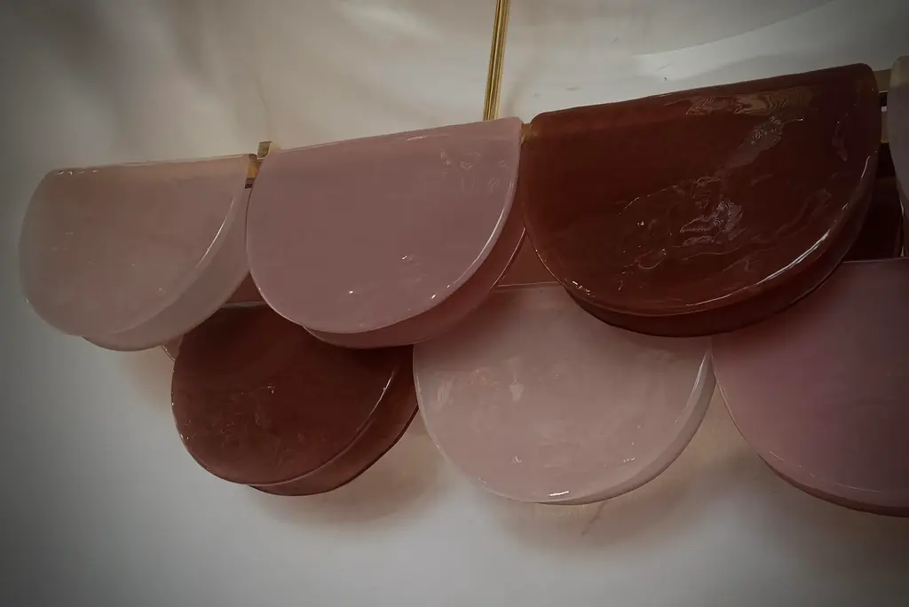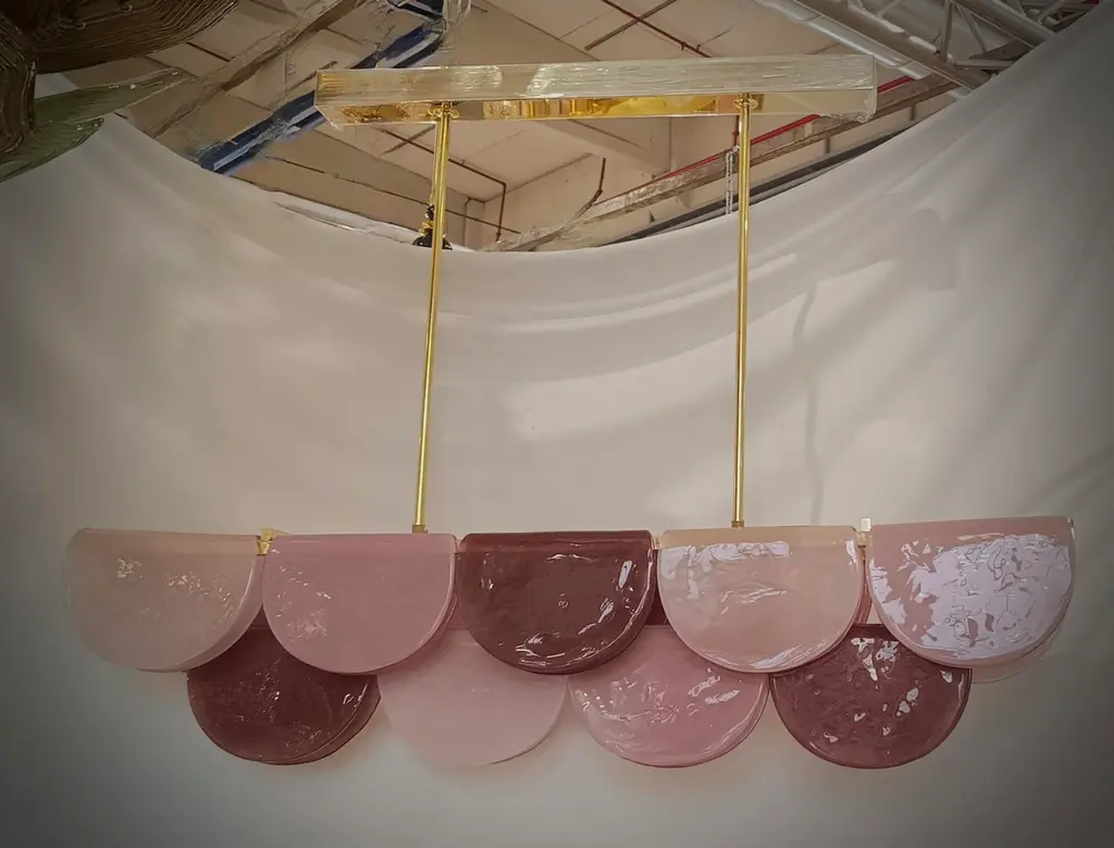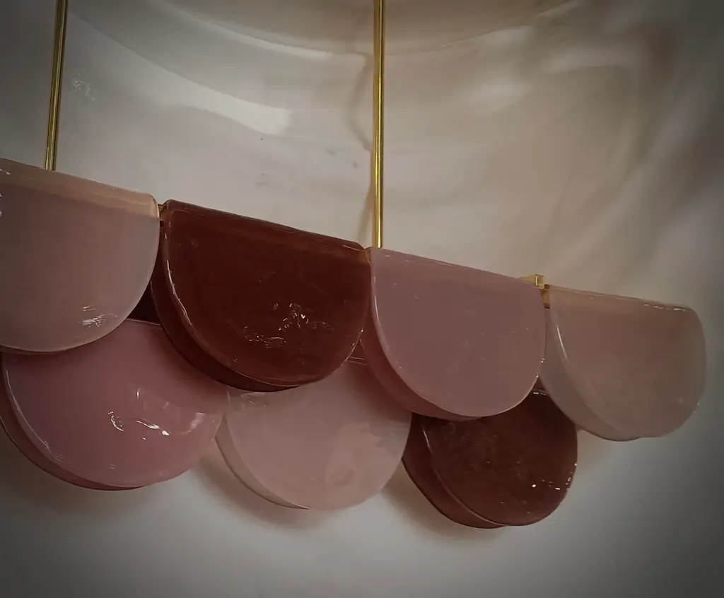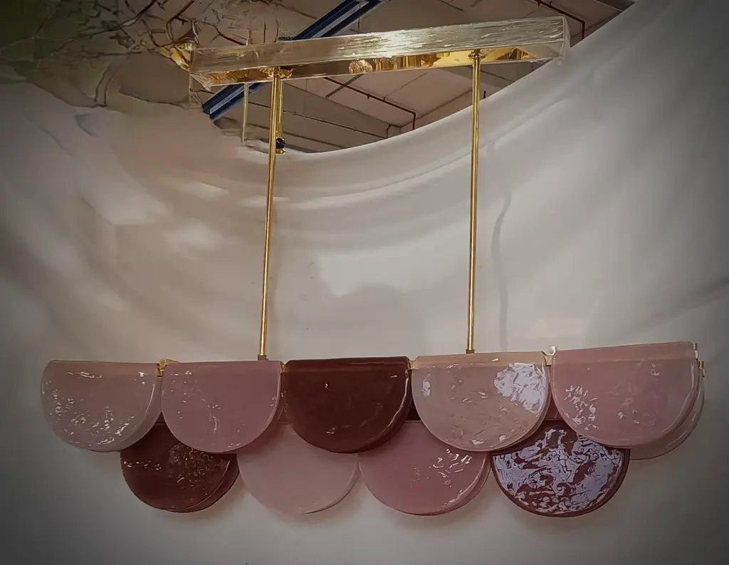 Murano chandelier with an elongated design with a brass structure and unique glass with pink tones. All in Murano glass with a brass structure. The glasses are treated with a special procedure that gives them a lively surface. As you can see from the photos, its color is a beautiful shade of pink that goes from light to dark. The chandelier is made up of three parallel brass strips on which LED strips are attached, half-moon glasses are placed on top. It is a beauty to see it lit because it releases all its elegance. Refinement and style as is in the Murano style, unique pieces that always remain precious. Wear consistent with age and use. Each item is checked. European Plug (up to 250V).The wiring of this item may be original and might need replacement, if not specified otherwise.