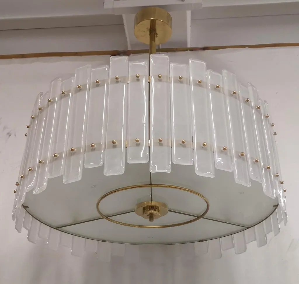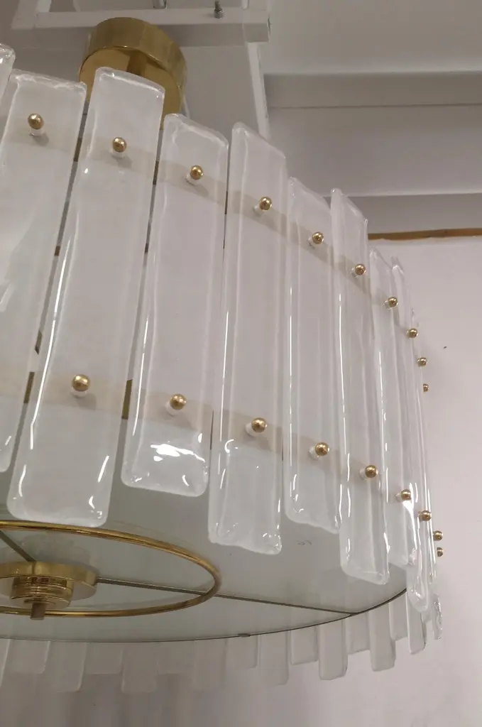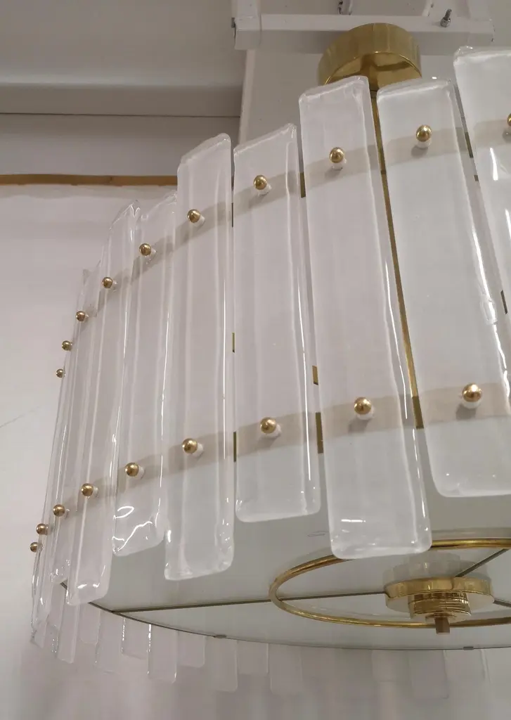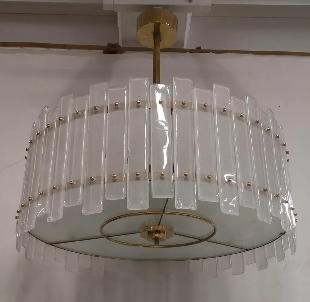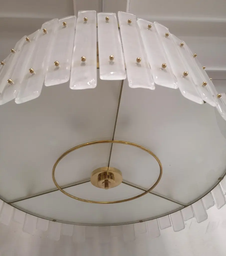 Superb chandelier / ceiling light of amazing sand blasted color; a perfect round loaded with sandblasted glass plates.Its structure is round and made of iron colored in gold, with specially cut and colored plates positioned all around the perimeter, fixed with brass pin. The glass plates are alternate between a long and a short one. There are also brass finishes. Below, to close the drum there is a round glass also sandblasted and stopped with brass finishes. Above it is attached to the ceiling by a brass tube with a nice canopy. The shape is that of a flattened drum. A sort of very elegant ceiling light. Excellent construction, both in proportion, size and in the combination of the size of the plates, with the final touch of polished brass for the finishes. The object is very beautiful and elegant. It also looks very well lit, as you can see from the photos.
