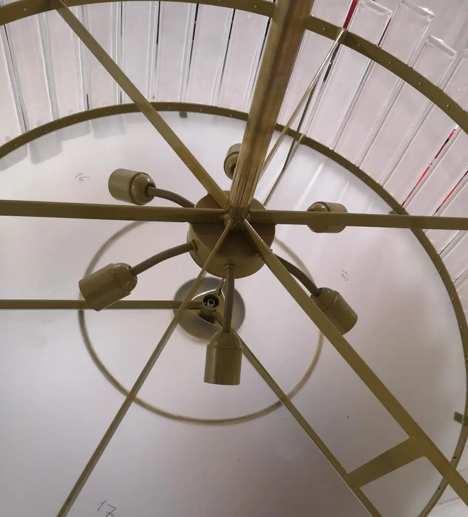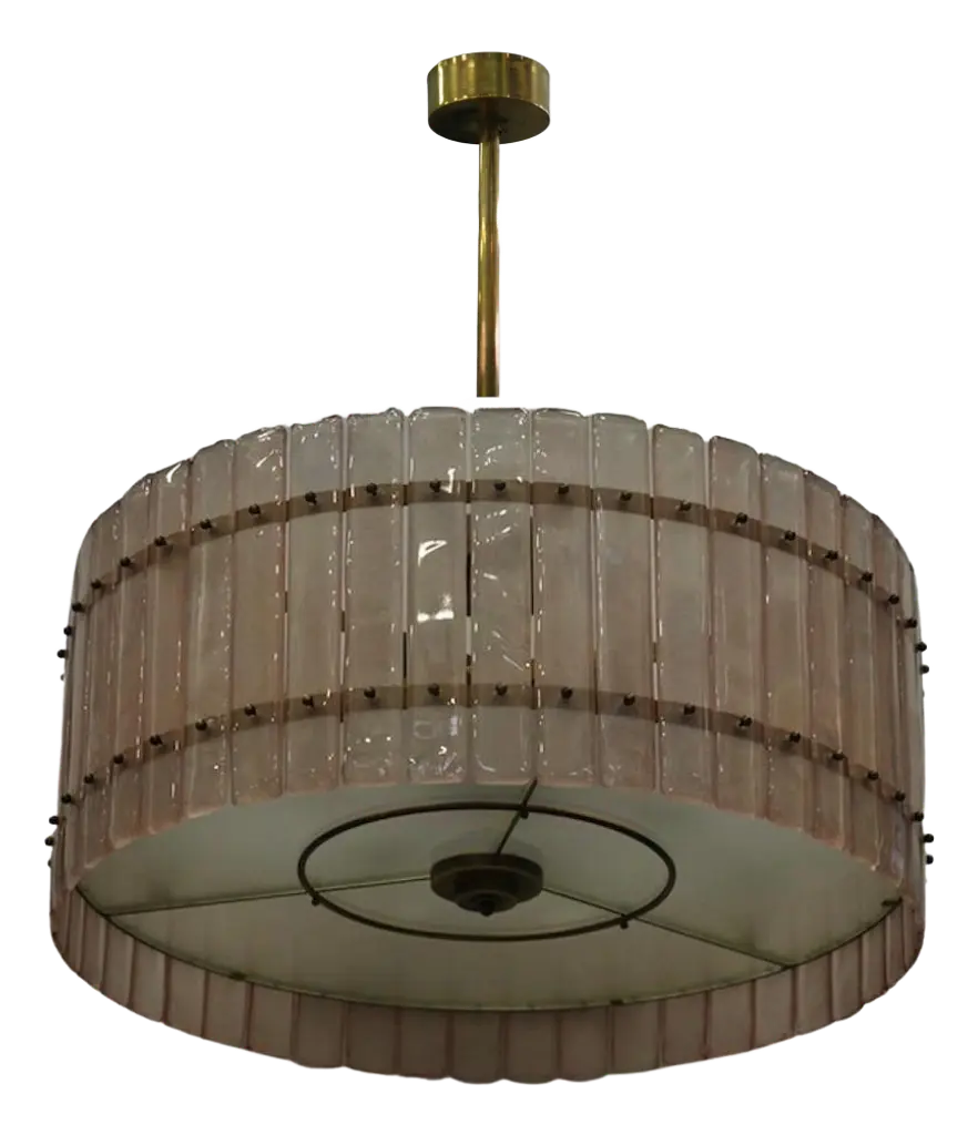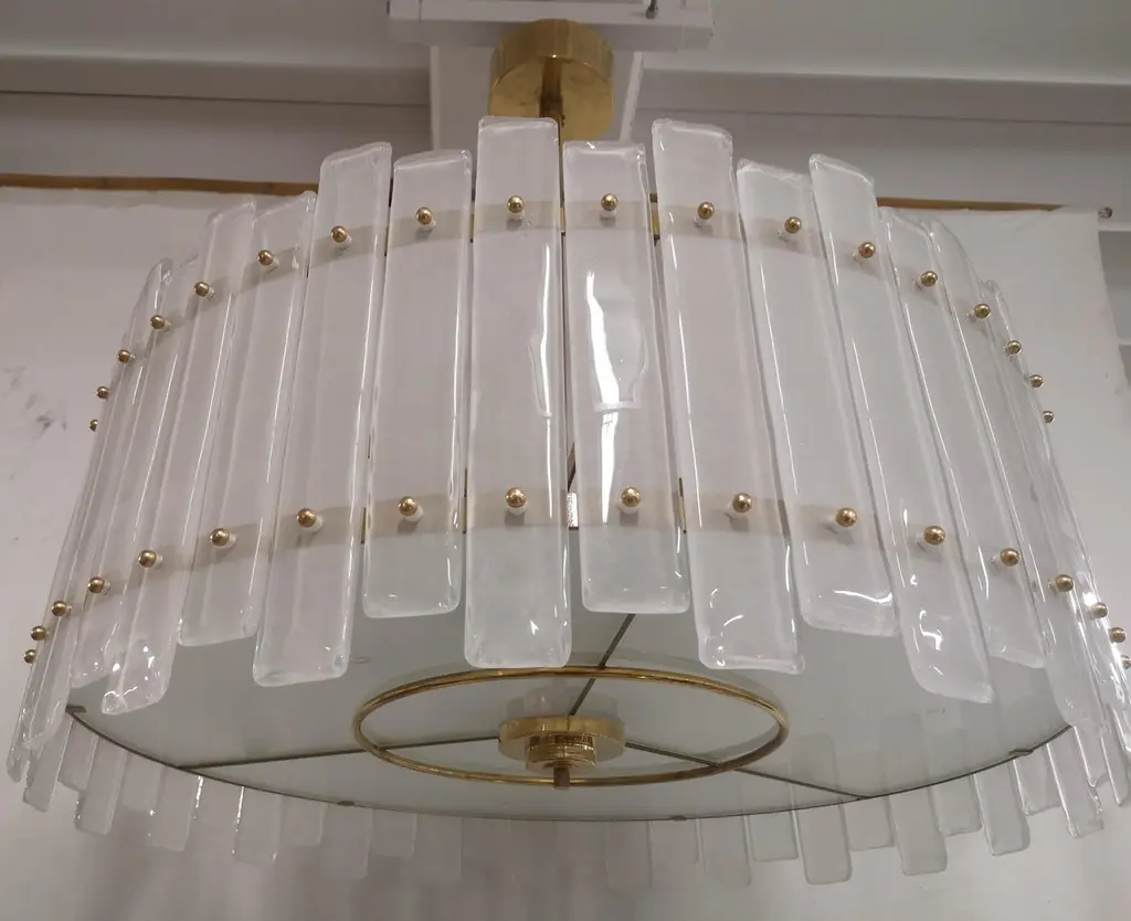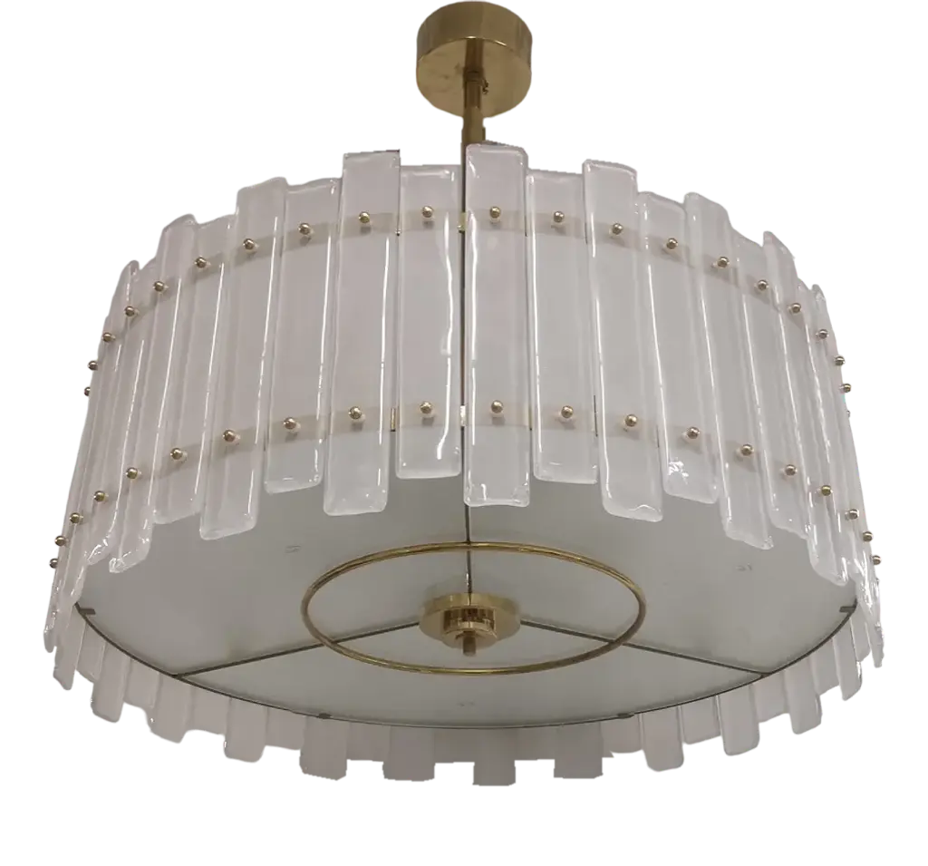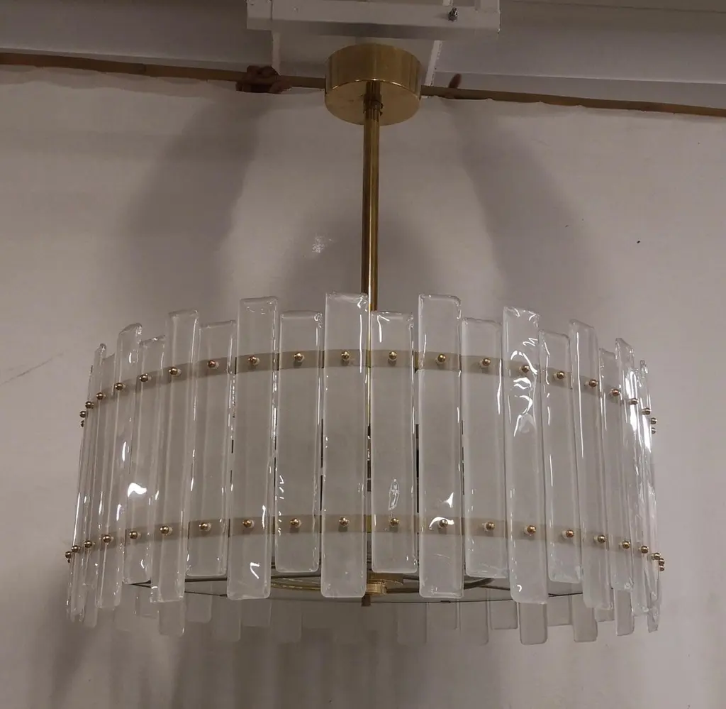 Superb chandelier / ceiling light of amazing sand blasted color; a perfect round loaded with sandblasted glass plates.Its structure is round and made of iron colored in gold, with specially cut and colored plates positioned all around the perimeter, fixed with brass pin. The glass plates are alternate between a long and a short one. There are also brass finishes. Below, to close the drum there is a round glass also sandblasted and stopped with brass finishes. Above it is attached to the ceiling by a brass tube with a nice canopy. The shape is that of a flattened drum. A sort of very elegant ceiling light. Excellent construction, both in proportion, size and in the combination of the size of the plates, with the final touch of polished brass for the finishes. The object is very beautiful and elegant. It also looks very well lit, as you can see from the photos.
