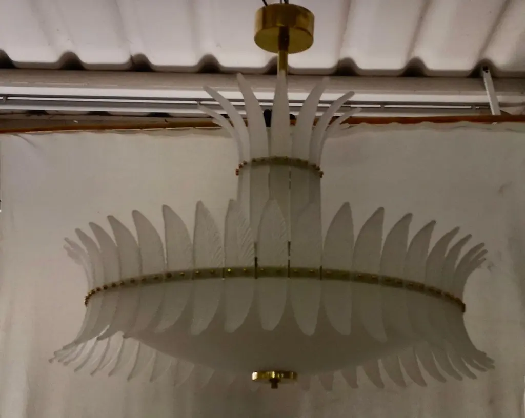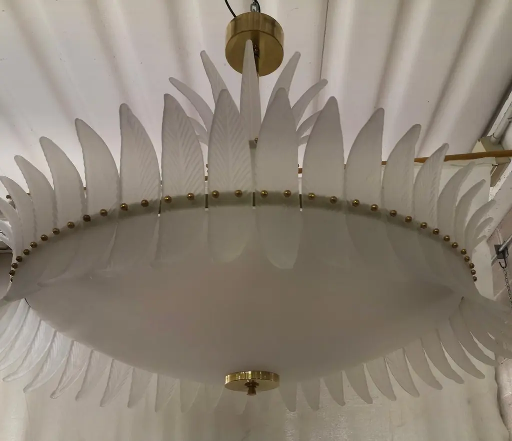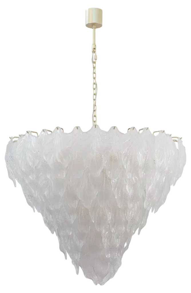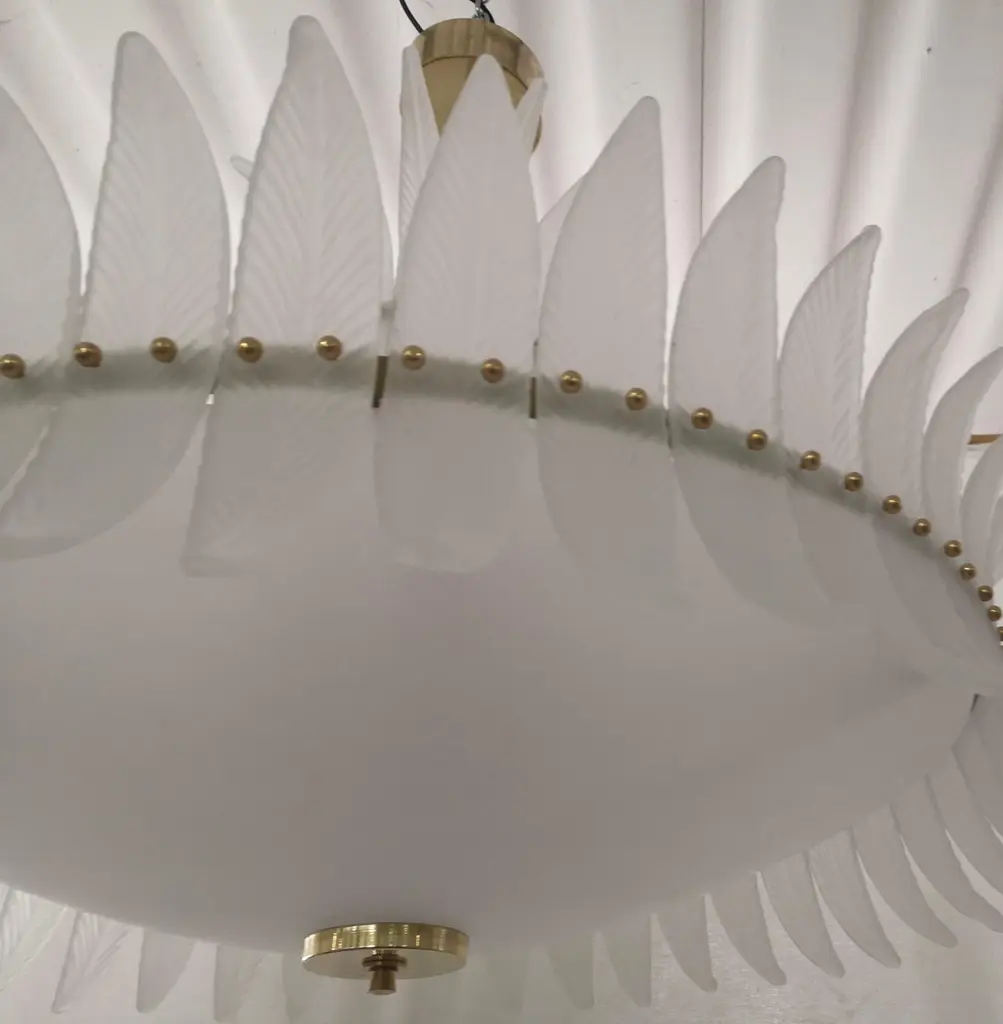 Riot of leaves, from an elegant sandblasted color. Very nice, rich and original design.Gold iron and brass structure with all around the leaves in Murano glass, of sandblasted color. The leaf has a curved structure and an elongated shape. The leaves in transparent sandblasted color. Thus, the chandelier takes the form of a cascade of leaves; starting from the top it is as if they were two chandeliers one inside the other; a smaller one at the top inserted into a larger chandelier at the bottom. There are two concentric circles; starting with the smallest one from the top and arriving at the largest second at the bottom. The chandelier on is very bright, internally it has 9 lights. Refinement and style as it is in the style of Murano, one-of-a-kind pieces that always remain precious.