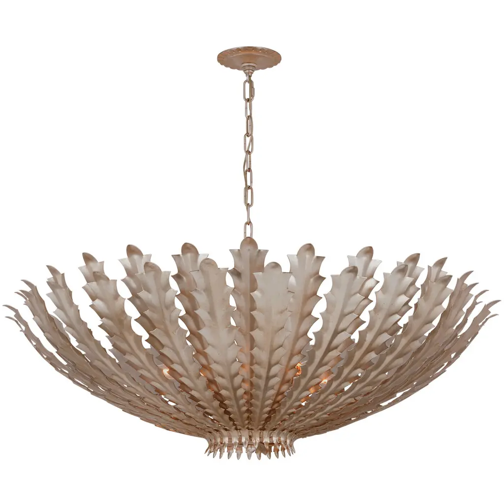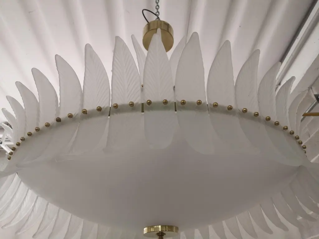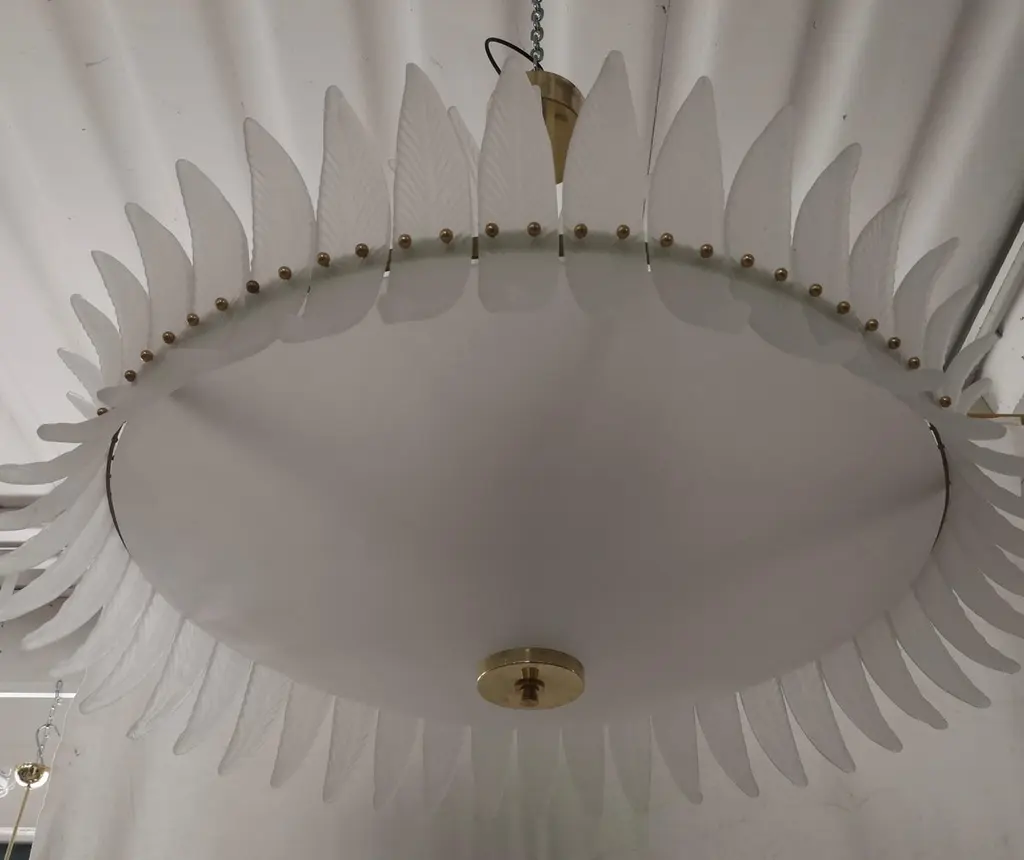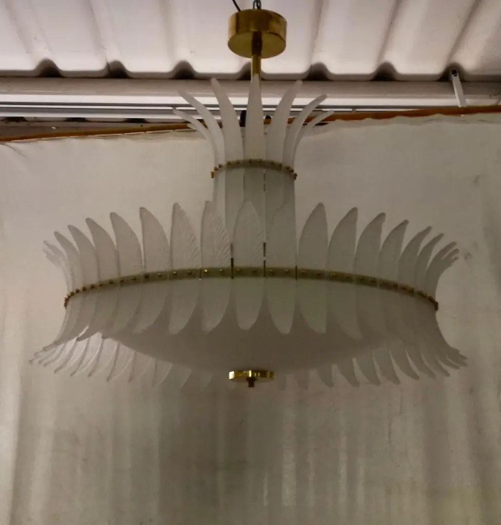 Riot of leaves, from an elegant sandblasted color. Very nice, rich and original design.Gold iron and brass structure with all around the leaves in Murano glass, of sandblasted color. The leaf has a curved structure and an elongated shape. The leaves in transparent sandblasted color. Thus, the chandelier takes the form of a cascade of leaves; starting from the top it is as if they were two chandeliers one inside the other; a smaller one at the top inserted into a larger chandelier at the bottom. There are two concentric circles; starting with the smallest one from the top and arriving at the largest second at the bottom. The chandelier on is very bright, internally it has 9 lights. Refinement and style as it is in the style of Murano, one-of-a-kind pieces that always remain precious.
