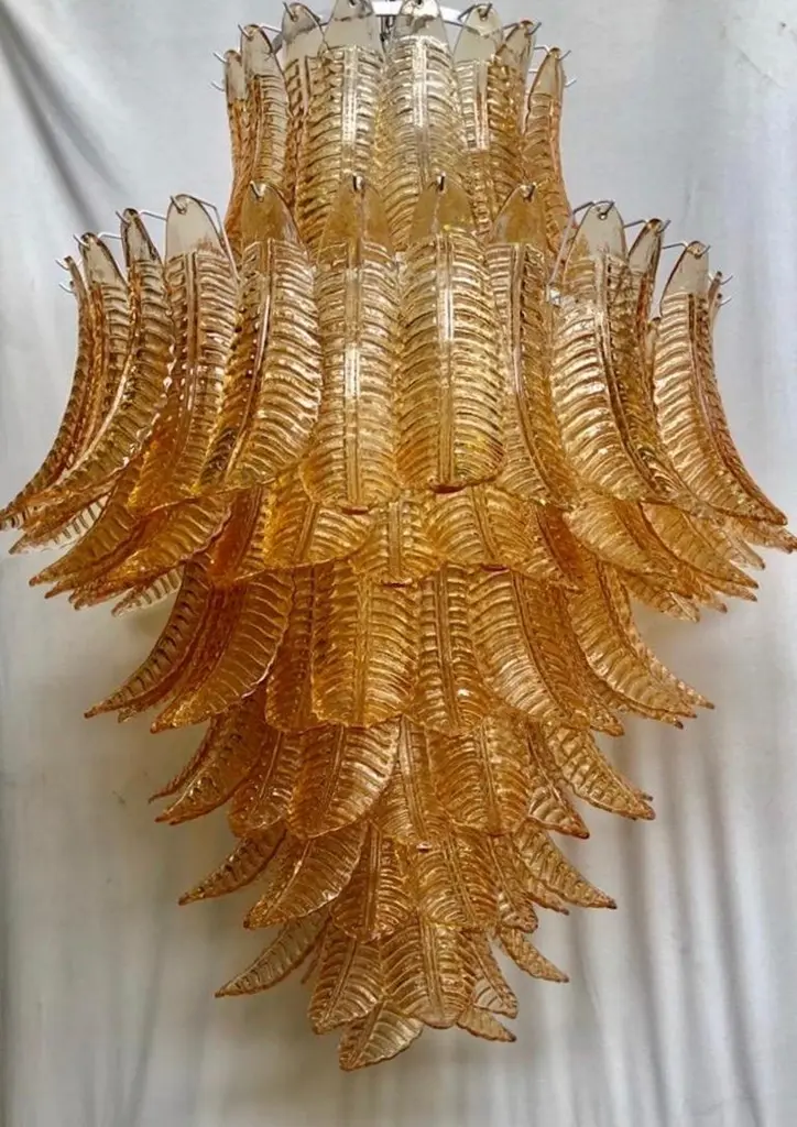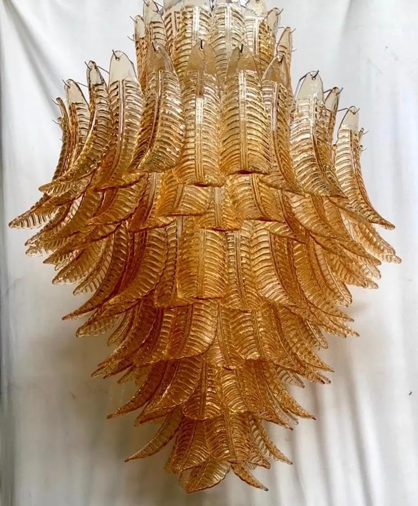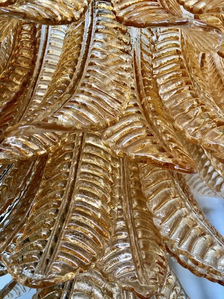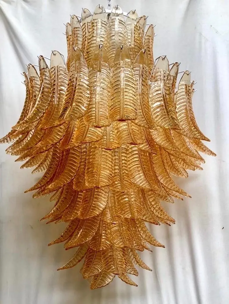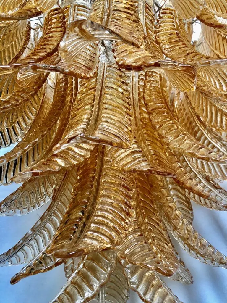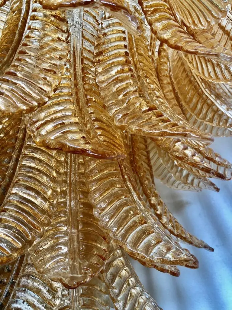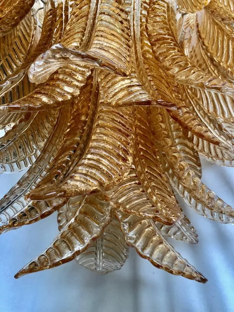 Riot of leaves, from an elegant burnt orange color. Refinement and class as in the Murano style, one-of-a-kind pieces that always remain precious.White iron structure with all around the leaves in Murano glass, of burnt orange color. The leaf has a curved structure, and an elongated shape. Thus, the chandelier takes the form of a cascade of leaves, starting from the top and then getting smaller and smaller towards the bottom. There are seven concentric circles that alternate from top to bottom along the white iron structure. Very beautiful and particular leaves, one of a kind, have a very original and elegant color. When turned on, the chandelier is very bright as it has many bulbs with large sockets, it will illuminate your room perfectly.