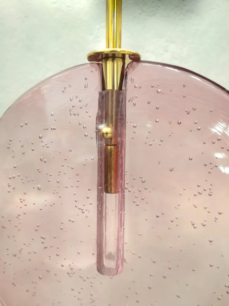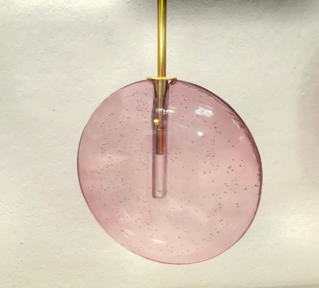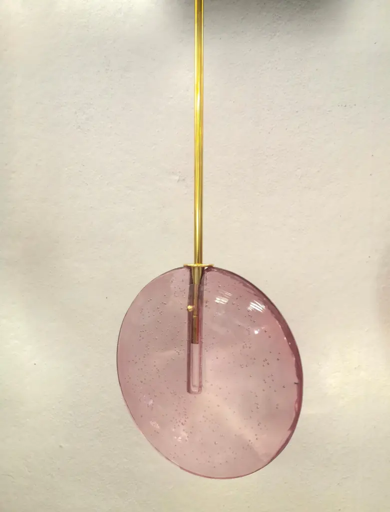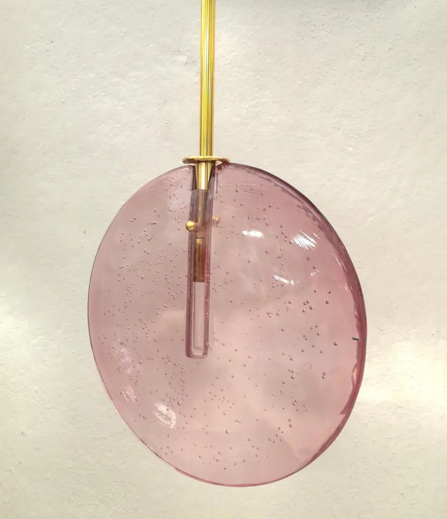 Very special Murano glass lanterns, stylish and elegant, their design truly unique in their kind. Beautiful coloring.The lantern is composed of a brass stem where a system for a G9 bulb has been inserted; this implant for the G9 bulb is inserted inside a large Murano glass medallion and fixed with two small brass screws. The medallion is in glass paste with a particular processing with bubbles inside the same glass. Refinement and style as it is in the style of Murano, one-of-a-kind pieces that always remain precious. When turned on, the chandelier is very bright having a bulb with a G9 socket, it will perfectly illuminate your home. The chandelier is easily removable and transportable, the replacement of the bulb takes a few minutes.