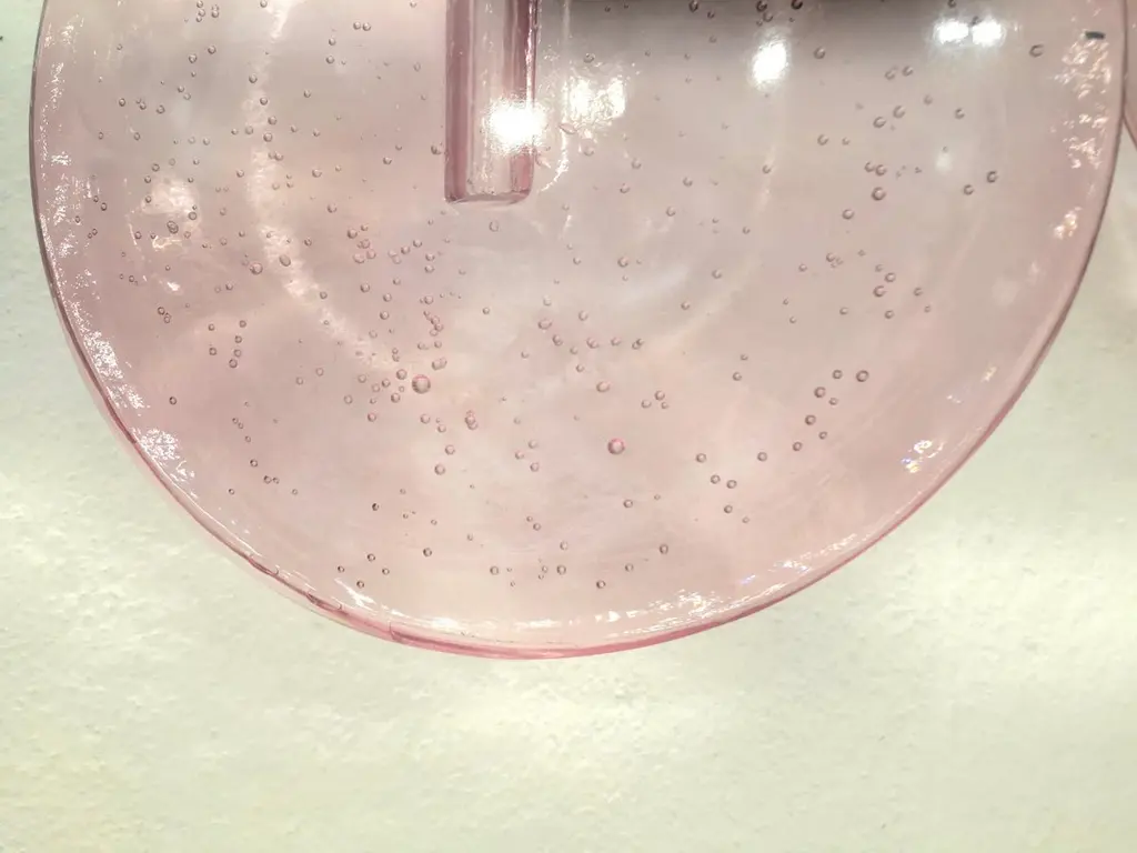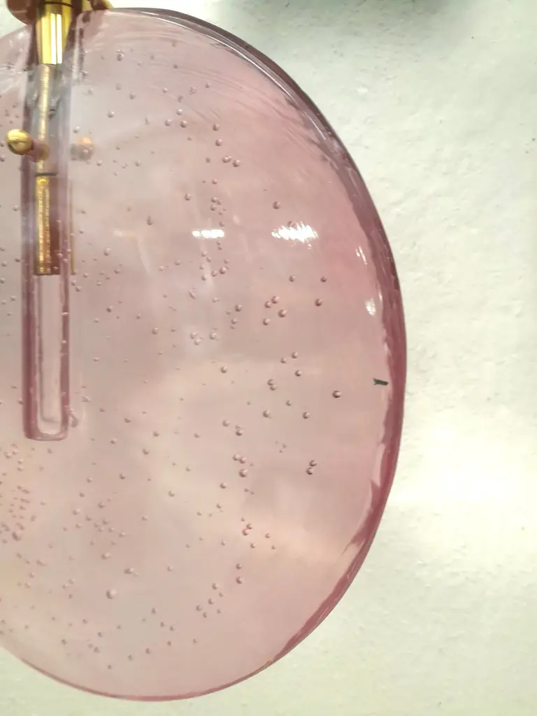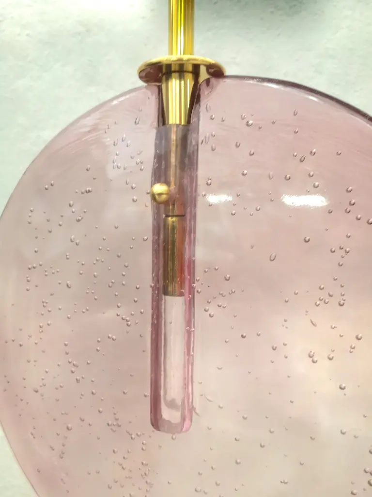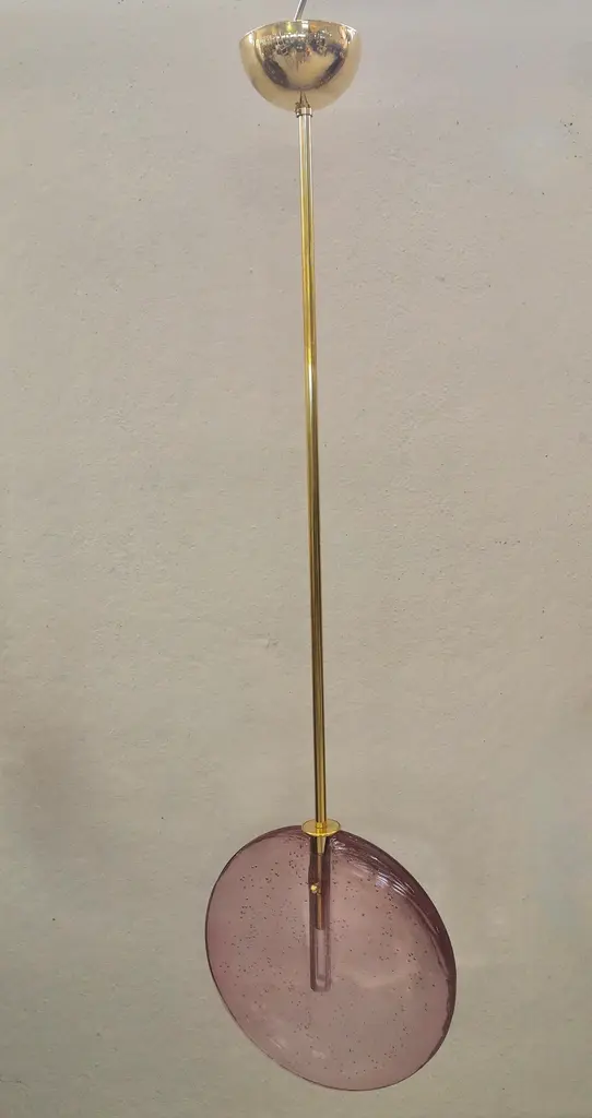 Very special Murano glass lanterns, stylish and elegant, their design truly unique in their kind. Beautiful coloring.The lantern is composed of a brass stem where a system for a G9 bulb has been inserted; this implant for the G9 bulb is inserted inside a large Murano glass medallion and fixed with two small brass screws. The medallion is in glass paste with a particular processing with bubbles inside the same glass. Refinement and style as it is in the style of Murano, one-of-a-kind pieces that always remain precious. When turned on, the chandelier is very bright having a bulb with a G9 socket, it will perfectly illuminate your home. The chandelier is easily removable and transportable, the replacement of the bulb takes a few minutes.
