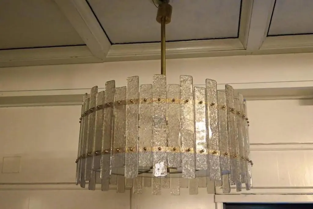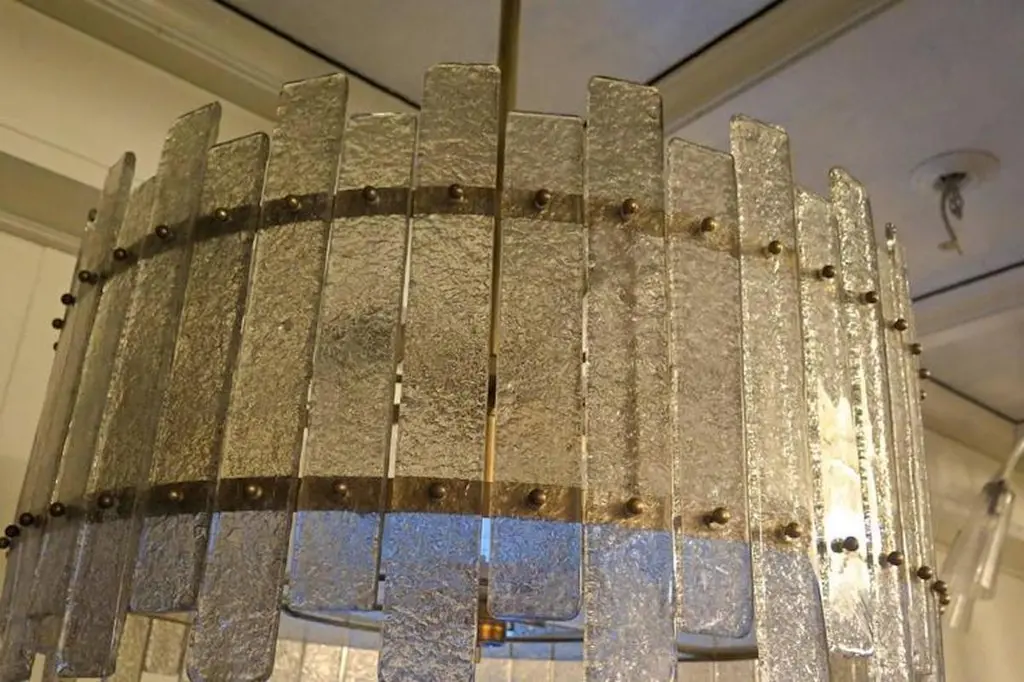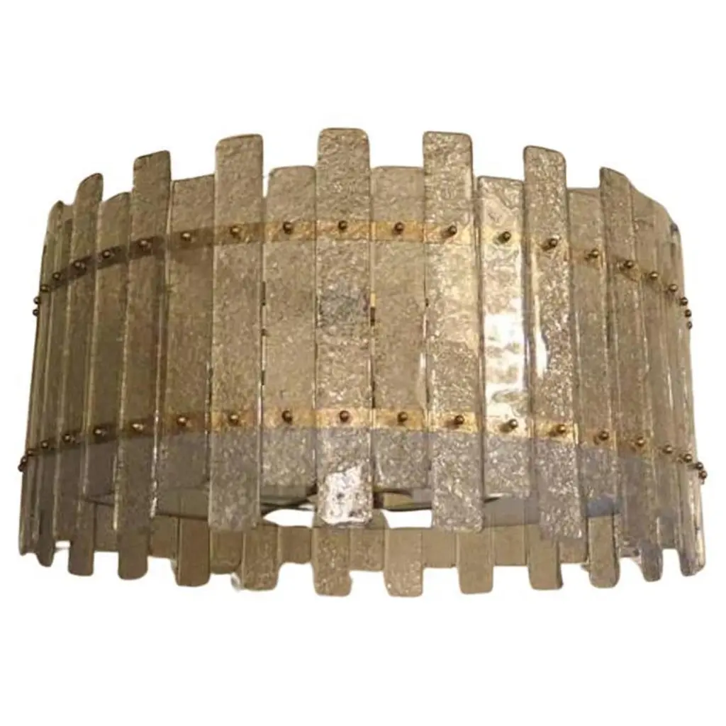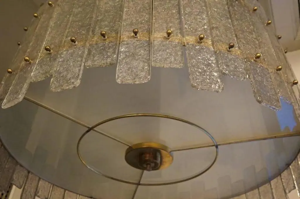 A stunning chandelier/ceiling light in a striking transparent ice color; a perfect circle of ice-colored glass panes.Its round frame is made of gold-colored iron, with specially cut panes positioned along the entire perimeter of the structure, secured with brass pins. At the bottom, completing the drum-shaped structure, is a round glass pane, also sandblasted and secured with brass trim. The chandelier is attached to the ceiling via a brass tube with a beautiful ceiling rose. Its shape is that of a flattened drum. A very elegant type of ceiling light. Excellent construction, both in proportions, dimensions, and the matching of the pane sizes, with a final touch of polished brass finishing. The piece is very beautiful and elegant. It also appears to be very well lit, as you can see from the photos.Wear consistent with age and use. Each item offered by the HannauRoma warehouse is inspected by our team of craftsmen. We guarantee a very high quality standard; please ask our design specialists for detailed information.