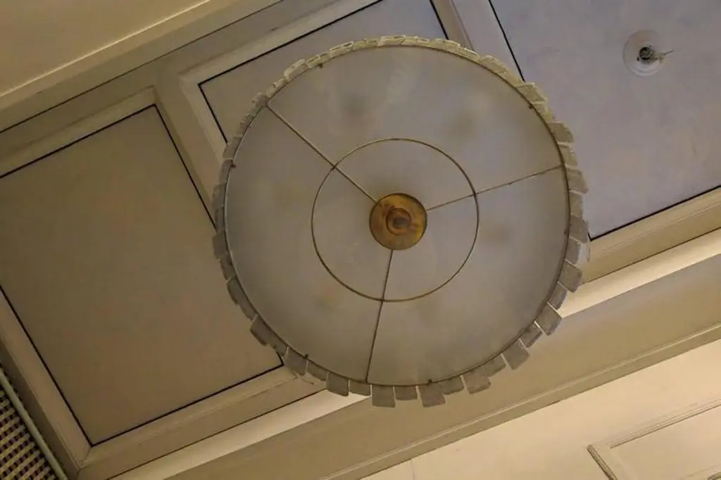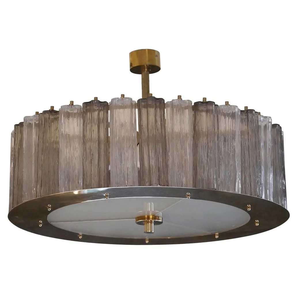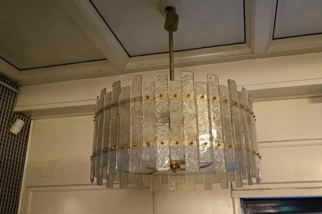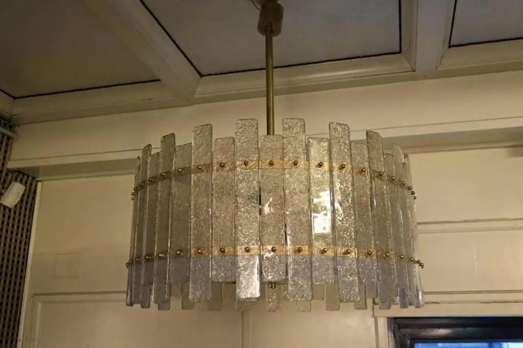 A stunning chandelier/ceiling light in a striking transparent ice color; a perfect circle of ice-colored glass panes.Its round frame is made of gold-colored iron, with specially cut panes positioned along the entire perimeter of the structure, secured with brass pins. At the bottom, completing the drum-shaped structure, is a round glass pane, also sandblasted and secured with brass trim. The chandelier is attached to the ceiling via a brass tube with a beautiful ceiling rose. Its shape is that of a flattened drum. A very elegant type of ceiling light. Excellent construction, both in proportions, dimensions, and the matching of the pane sizes, with a final touch of polished brass finishing. The piece is very beautiful and elegant. It also appears to be very well lit, as you can see from the photos.Wear consistent with age and use. Each item offered by the HannauRoma warehouse is inspected by our team of craftsmen. We guarantee a very high quality standard; please ask our design specialists for detailed information.