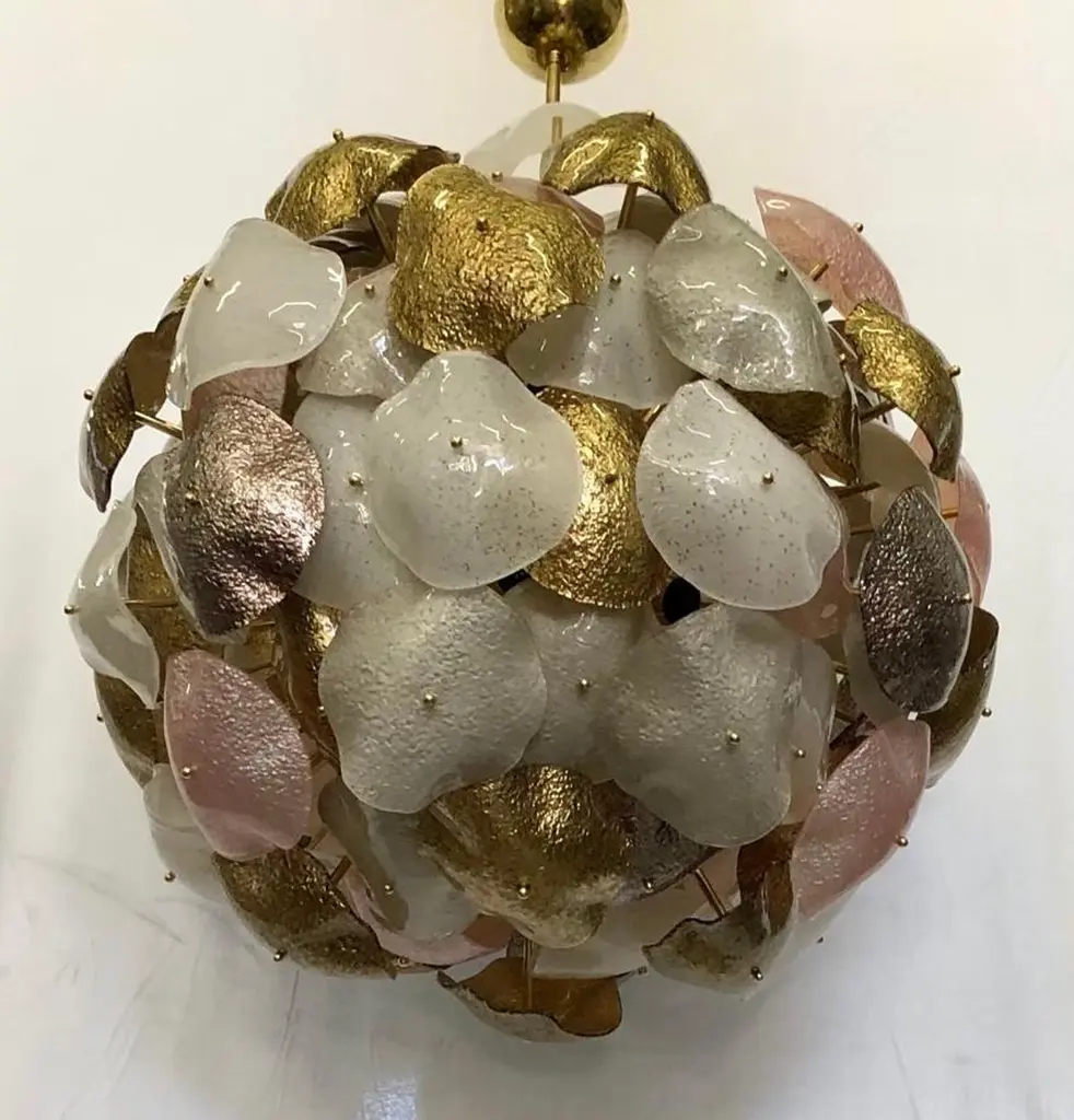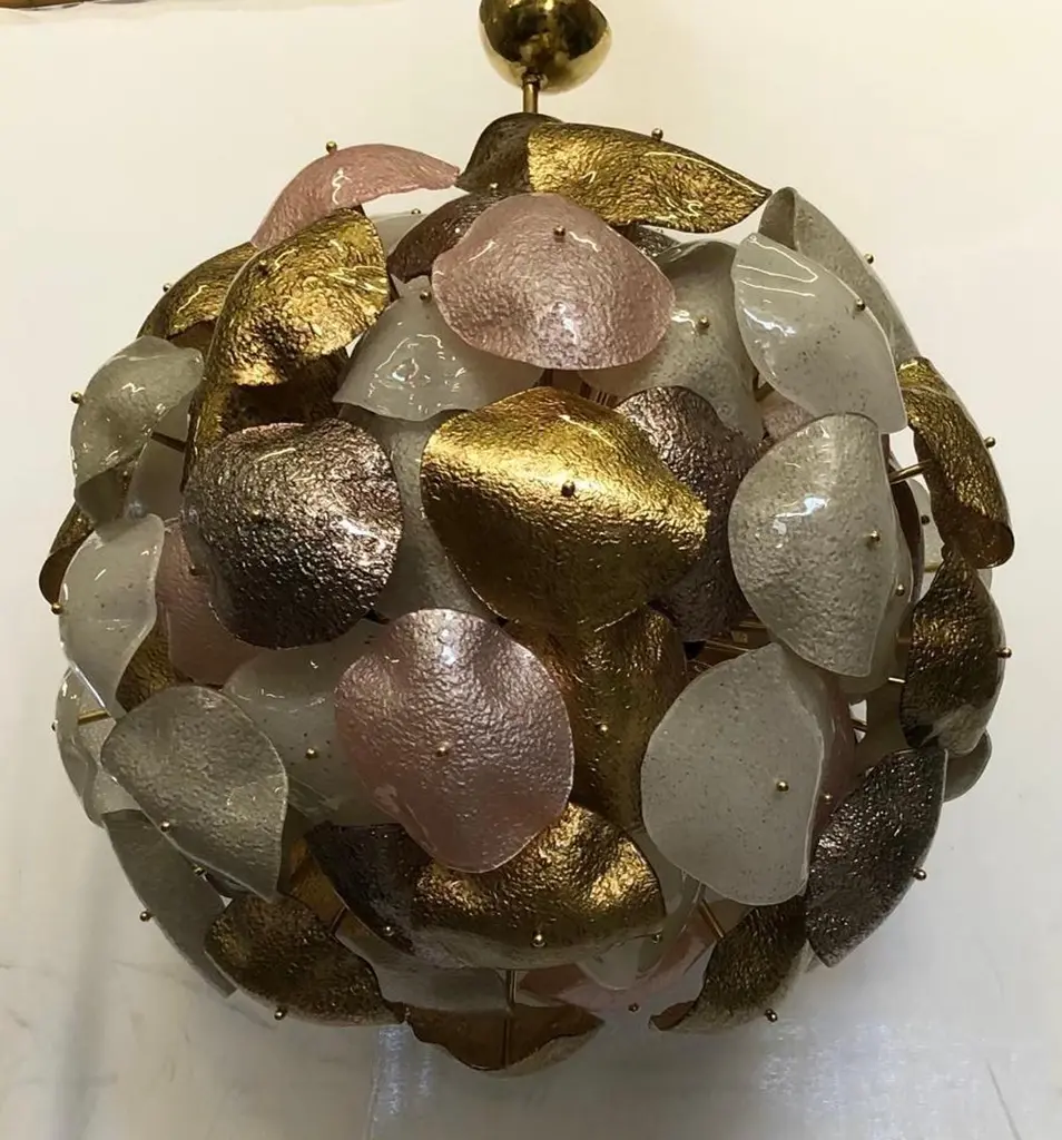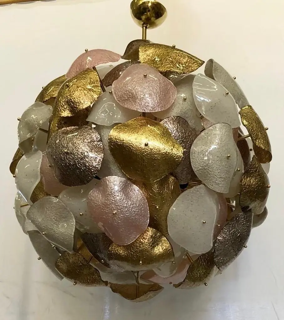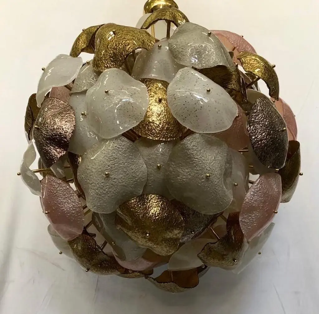 Excellent Murano chandelier, particular for its structure and the shape of its glass; five different unique and very special colors. You can see the color from the foto.The chandelier is composed of a series of rods that come out, and to which the glasses are then attached. The glasses are of five different colors: gold, bronze, white and pink. The chandelier is hung from the ceiling by means of a brass rod with a canopy at the end, which hides the hook. Internally there are 20 light. Note the particular shape of the glass cups, unique and particular of their kind. Very beautiful and rich chandelier, a beautiful splash of color in the room.Wear consistent with age and use. Every item the warehouse HannauRoma offers is checked by our team of craftsmen. We guarantee a very high-quality standard, ask our design specialists for detailed information.
