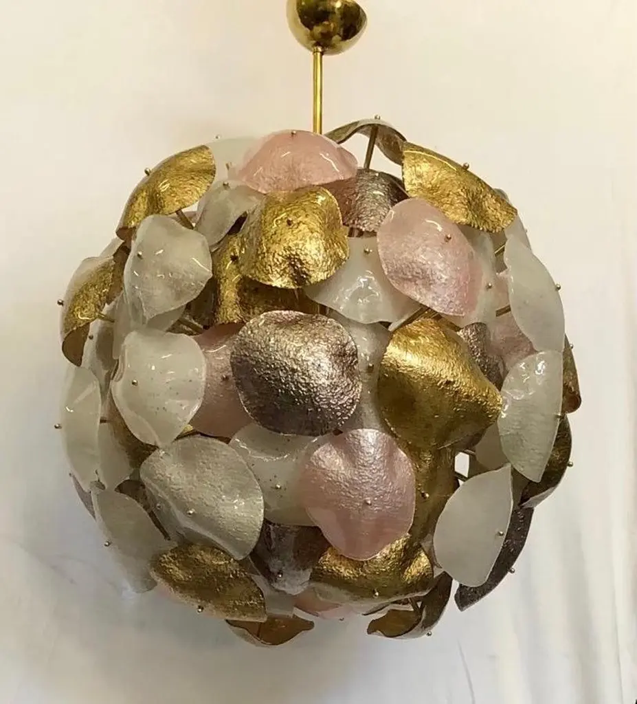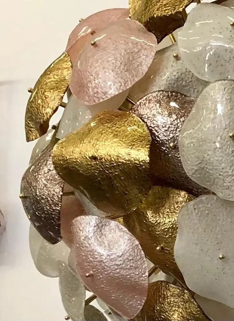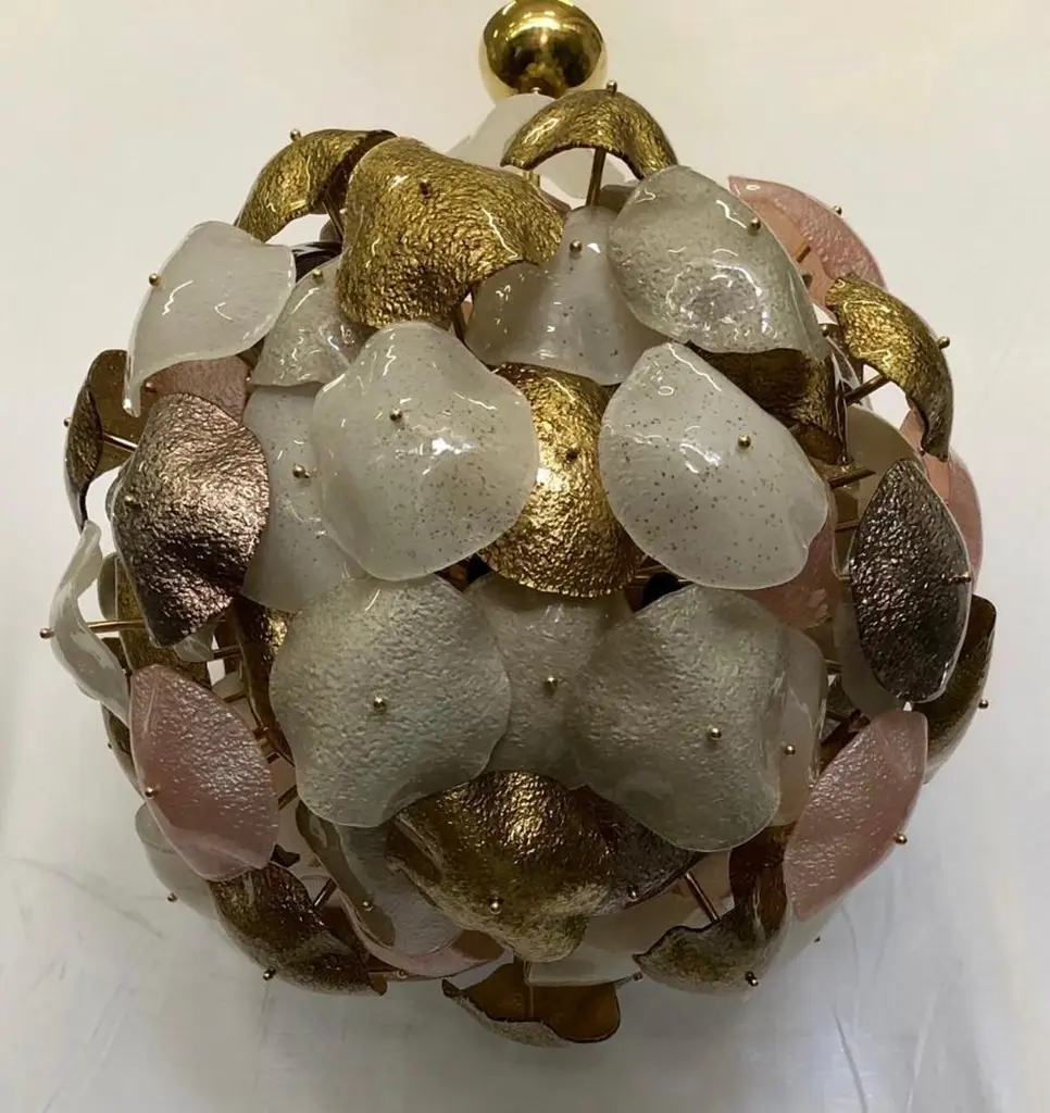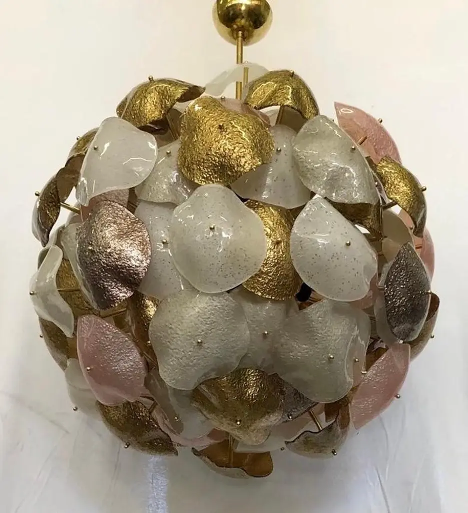 Excellent Murano chandelier, particular for its structure and the shape of its glass; five different unique and very special colors. You can see the color from the foto.The chandelier is composed of a series of rods that come out, and to which the glasses are then attached. The glasses are of five different colors: gold, bronze, white and pink. The chandelier is hung from the ceiling by means of a brass rod with a canopy at the end, which hides the hook. Internally there are 20 light. Note the particular shape of the glass cups, unique and particular of their kind. Very beautiful and rich chandelier, a beautiful splash of color in the room.Wear consistent with age and use. Every item the warehouse HannauRoma offers is checked by our team of craftsmen. We guarantee a very high-quality standard, ask our design specialists for detailed information.