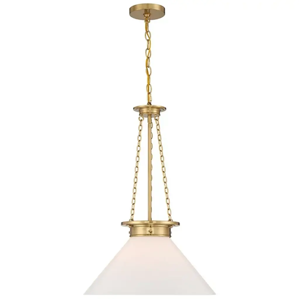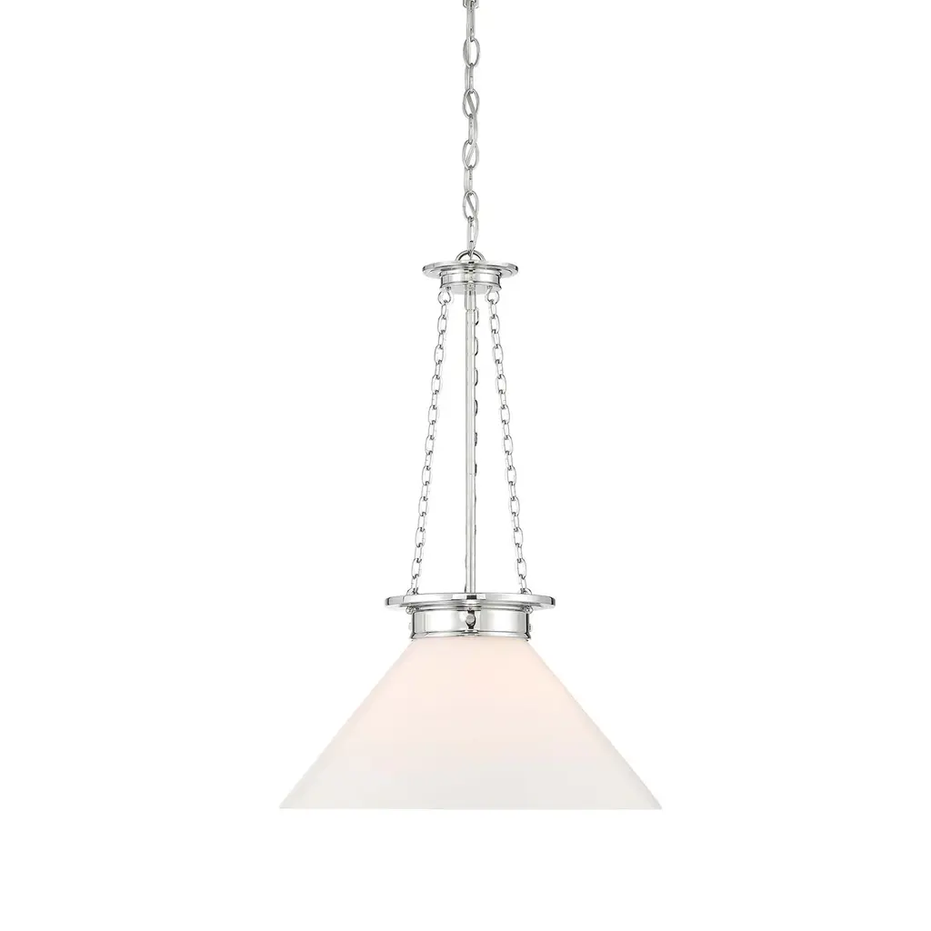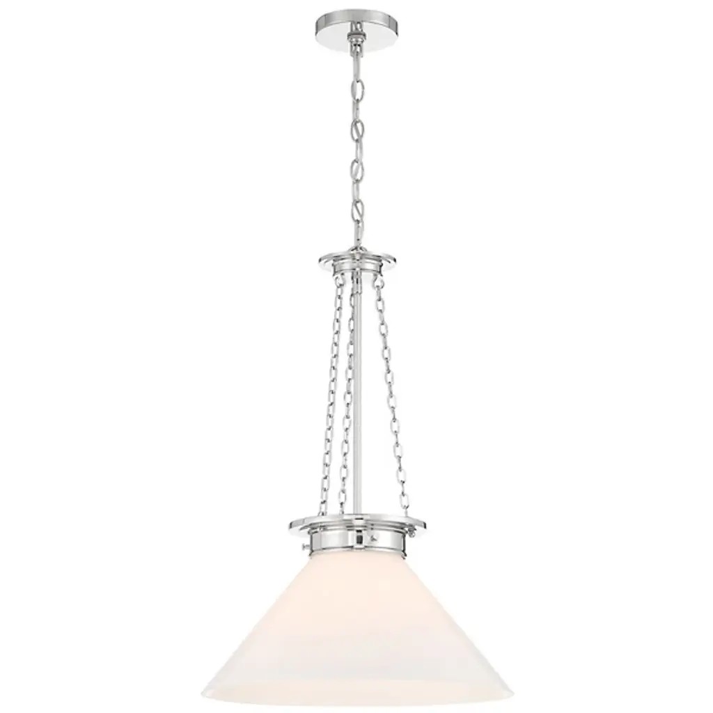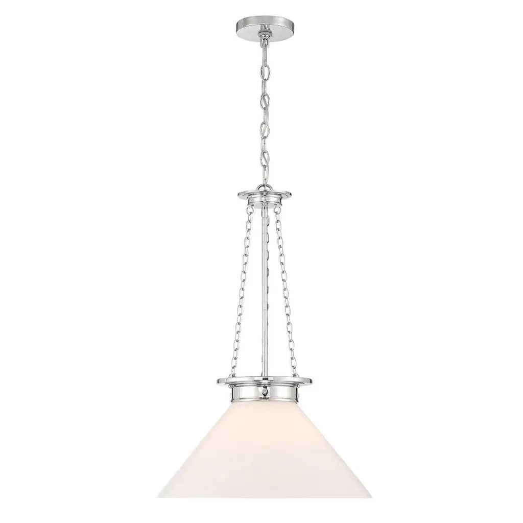 The Myers Pendant from Savoy House offers a bright, vintage-inspired lighting solution suitable for diverse interior settings. Its key feature is a white-cased glass shade, notable for its rich, lustrous appearance that enhances the fixture's versatility. The pendant's design is further elevated by slim decorative chains, which not only add visual interest but also reinforce the vintage aesthetic. This combination of a classic glass shade and delicate chain detailing creates a timeless yet eye-catching fixture that brings both illumination and nostalgic charm to various spaces.