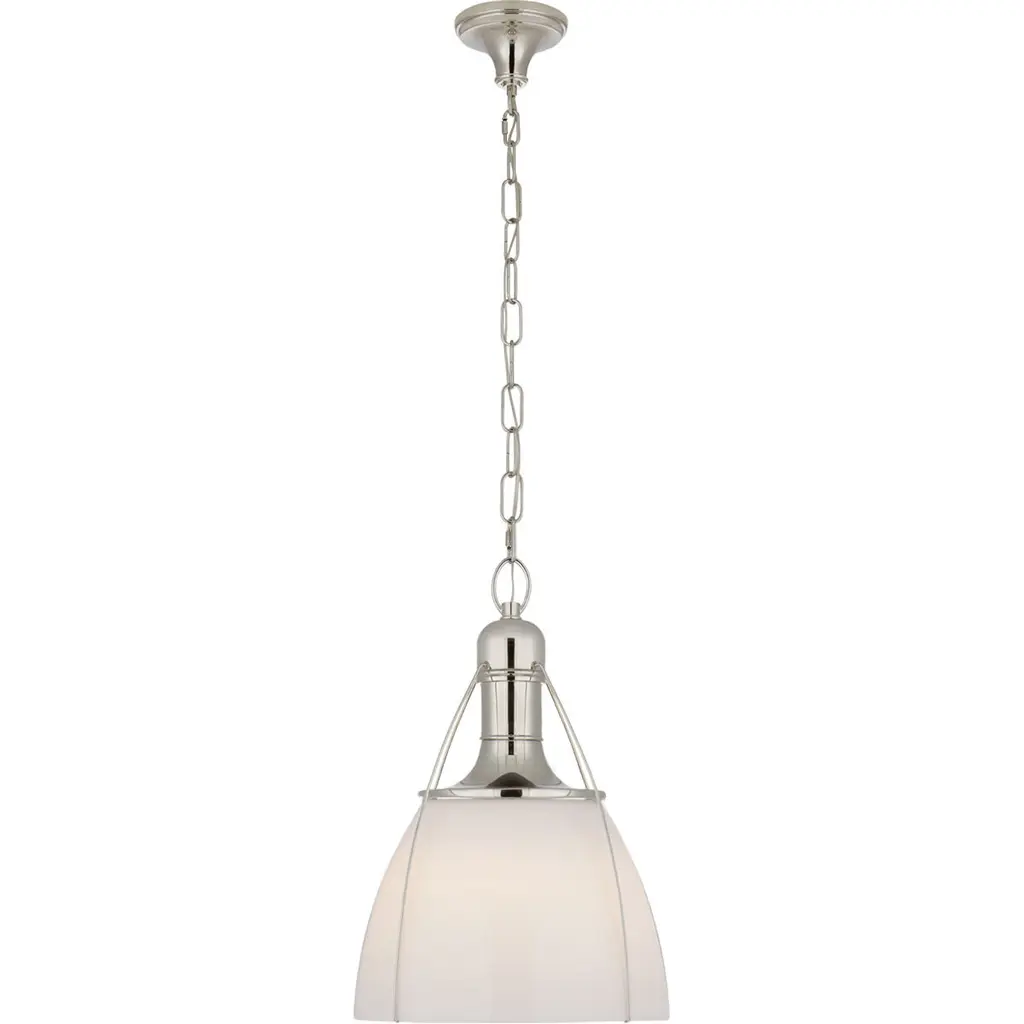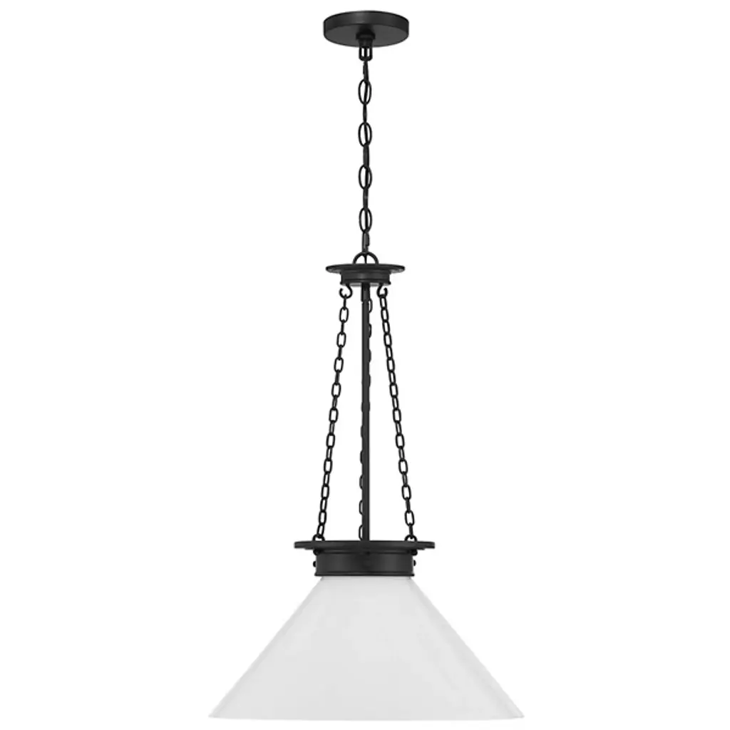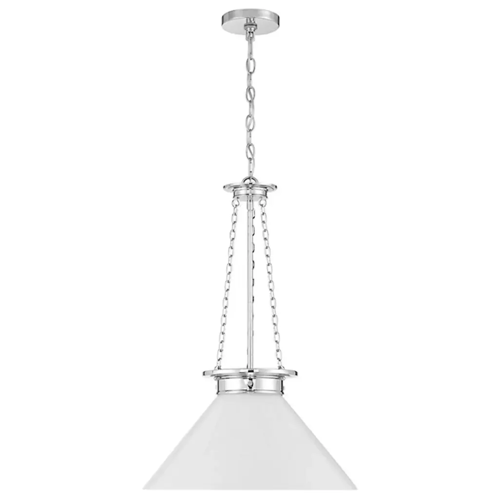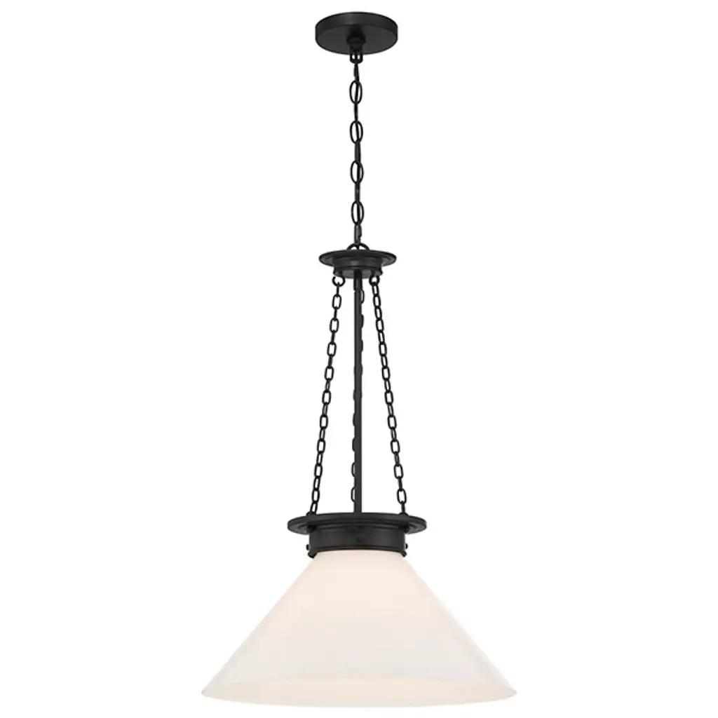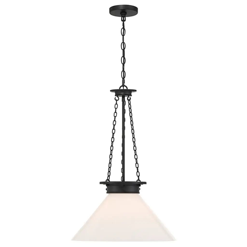 The Myers Pendant from Savoy House offers a bright, vintage-inspired lighting solution suitable for diverse interior settings. Its key feature is a white-cased glass shade, notable for its rich, lustrous appearance that enhances the fixture's versatility. The pendant's design is further elevated by slim decorative chains, which not only add visual interest but also reinforce the vintage aesthetic. This combination of a classic glass shade and delicate chain detailing creates a timeless yet eye-catching fixture that brings both illumination and nostalgic charm to various spaces.