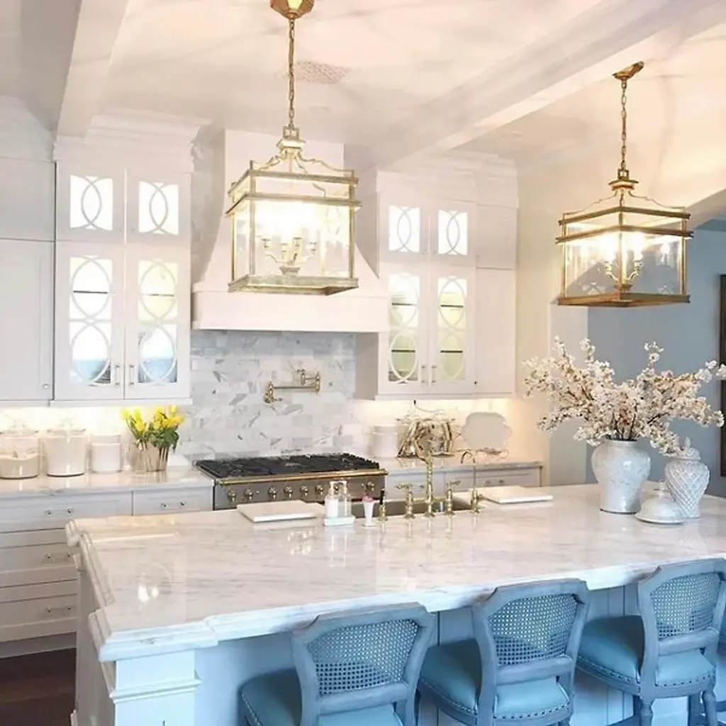 Craft a space with European flair by adding the Mykonos Lantern Pendant by Visual Comfort Signature, formerly known as Visual Comfort, Featuring a square cage-like shape fashioned from metal, clear glass panes and 4 curvy candelabra sockets nestled inside, this piece creates a captivating setting wherever it is placed. It will instantly become a focal point whether hung solo above a reading chair or in clusters around a kitchen island, bar area or dining room table.