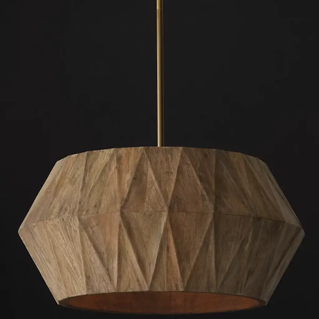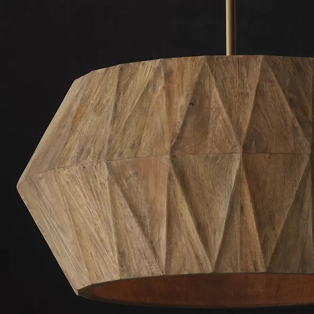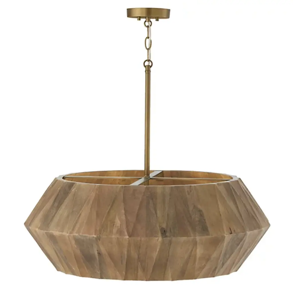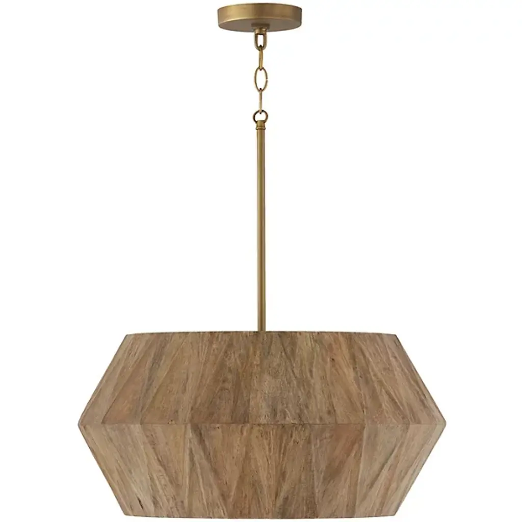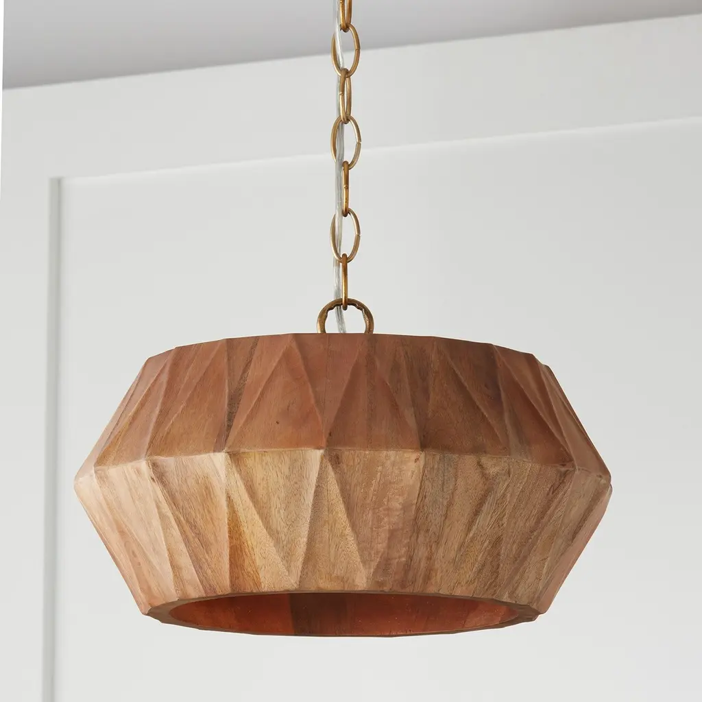 The Nadeau Pendant from Capital Lighting offers artisanal charm meticulously handcrafted from mango wood. This pendant introduces a naturally captivating luminaire, with its angular silhouette and geometric texture adding intriguing dimension from every perspective. The hand-distressed finish enhances the artisanal appeal, creating a pendant that is a source of illumination and a sculptural masterpiece. Illuminate your surroundings with the Nadeau Pendant, where craftsmanship and design converge to elevate your space with timeless allure and organic sophistication.