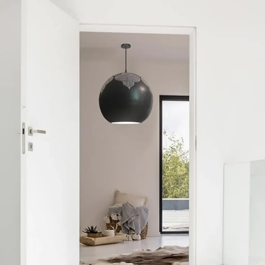 A magical piece showcasing metalworking techniques passed down from generation to generation. Created by artisans in the heart of Marrakesh, Morocco, the Najma Pendant from Dounia Home blankets your rooms with a beautiful cast light defined by an exquisite pattern. The pendant exudes a timeless character as Dounia Home puts emphasis on fusing tradition with modern form. It pleases the eye with a clean suspension and a simple globe form. It then mesmerizes with a sea of perforations that have been individually applied by hand. Master artisans tighten up the holes with a traditional trellis pattern informed by ancient architecture. The pattern comes to life as light filters through and exits as a cast design on the walls nearby. While light comes over the top of the dome, another funnels through it as a versatile down glow fitting over your tables.