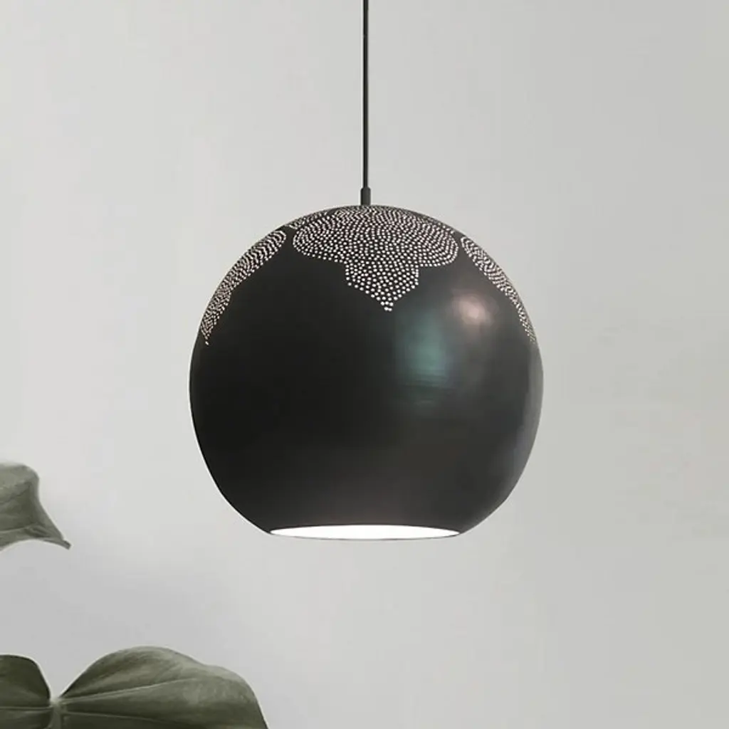 A magical piece showcasing metalworking techniques passed down from generation to generation. Created by artisans in the heart of Marrakesh, Morocco, the Najma Pendant from Dounia Home blankets your rooms with a beautiful cast light defined by an exquisite pattern. The pendant exudes a timeless character as Dounia Home puts emphasis on fusing tradition with modern form. It pleases the eye with a clean suspension and a simple globe form. It then mesmerizes with a sea of perforations that have been individually applied by hand. Master artisans tighten up the holes with a traditional trellis pattern informed by ancient architecture. The pattern comes to life as light filters through and exits as a cast design on the walls nearby. While light comes over the top of the dome, another funnels through it as a versatile down glow fitting over your tables.