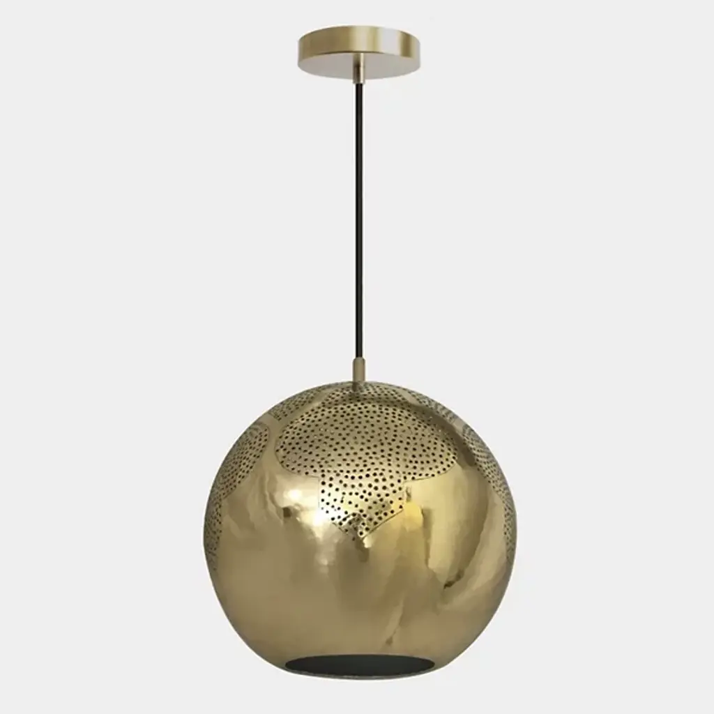 A magical piece showcasing metalworking techniques passed down from generation to generation. Created by artisans in the heart of Marrakesh, Morocco, the Najma Pendant from Dounia Home blankets your rooms with a beautiful cast light defined by an exquisite pattern. The pendant exudes a timeless character as Dounia Home puts emphasis on fusing tradition with modern form. It pleases the eye with a clean suspension and a simple globe form. It then mesmerizes with a sea of perforations that have been individually applied by hand. Master artisans tighten up the holes with a traditional trellis pattern informed by ancient architecture. The pattern comes to life as light filters through and exits as a cast design on the walls nearby. While light comes over the top of the dome, another funnels through it as a versatile down glow fitting over your tables.