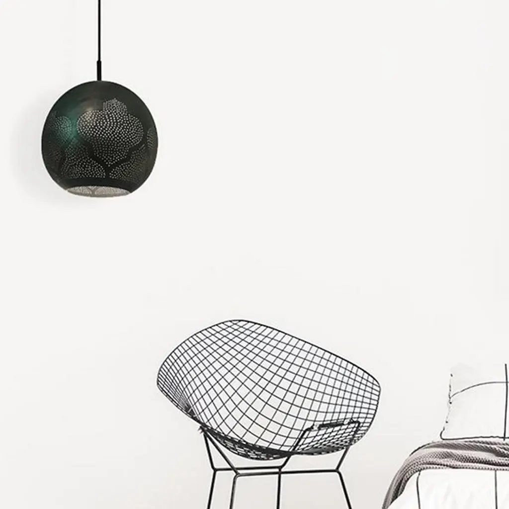 Authentic, exotic, timeless. Handcrafted in the heart of Marrakesh, Morocco, the Najma Reversed Pendant from Dounia Home dazzles from every angle, presenting you a light show that starts at its charming form and ends as a cast display over your walls. Morocco-based Dounia Home celebrates the rich artisanal tradition of its country, one defined by a fusion of cultures and skills. They push the limits of time-honored skills by pairing them with a modern aesthetic. This piece shows this approach as it hangs gracefully in the air in a clean dome form. The recycled metal shade shows the hand of the artisan on its softly textured surface, marked by a sea of individually punctured details. An homage to a traditional pattern, the fine holes move inside beautiful ornamental outlines. With a bulb sitting behind, light filters through the holes and projects a luminous, magical glow on nearby surfaces. The circular opening pushes through a stream of downlighting that's ideal over a table.
