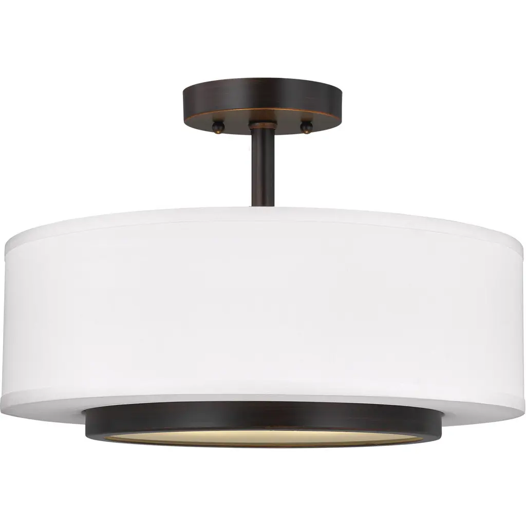 The Nance two light indoor semi-flush convertible in bronze supplies ample lighting for your daily needs, while adding a layer of today's style to your home's d?cor. The mid-century inspired Nance lighting collection by is a versatile transitional design which fits in a wide array of traditional or contemporary settings. The tapered, off-white, faux silk shades add warmth and sophistication. The large pendant and semi-flush faux silk drum shades are complemented nicely with Satin Etched Opal glass diffusers to soften the downlight. In either of the available Brushed Nickel or Heirloom Bronze finishes, all the Nance fixtures are timeless additions to any foyer, kitchen or dining area. The assortment includes three- five- and nine-light chandeliers; a one-light wall sconce; two- and three-light bath vanities and a two-light semi-flush convertible drum pendant. Incandescent and ENERGY STAR-qualified LED lamping are available; all fixtures are California Title 24 compliant.