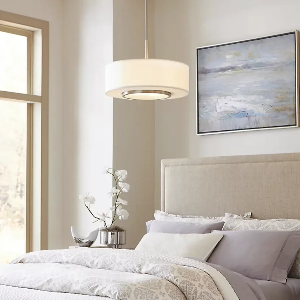 The Generation Lighting, formerly known as Sea Gull Lighting, Nance Drum Pendant features a Faux Silk drum shade and a Satin Etched Glass diffuser. These two work together to distribute light smoothly and evenly to your chosen space. Sloped ceiling mounting hardware included.