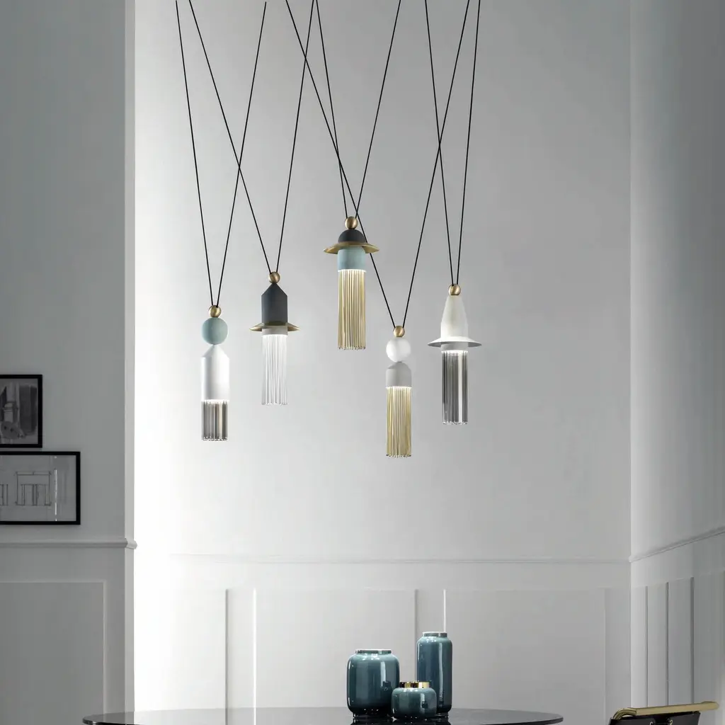 Experience a luxurious blend of classic Italian design and modern functionality with the Nappe LED Multi-Light Pendant Light by Masiero. The sophisticated energy-efficient lamping is held in an exquisite geometric assembly of turned metal, and adorned with pyrex glass or slender metal rods evocative of Venetian tassels. Elevate your interior spaces and delight in the beauty of timeless style. Highlights
