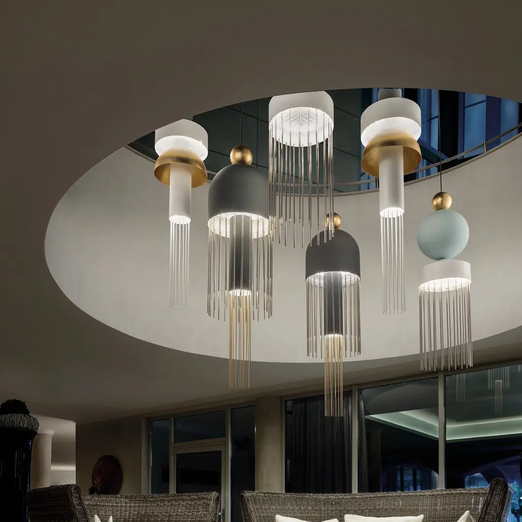 Illuminate your home with the Nappe X2 LED Pendant Light from Masiero. This luxurious and elegant pendant light features a turned metal frame enriched with brushed brass details and adorned with a small brass orb. Combining design elements with geometric shapes and decorative tassels, the Nappe creates a unique and personalized composition for a sophisticated, timeless look. Highlights
