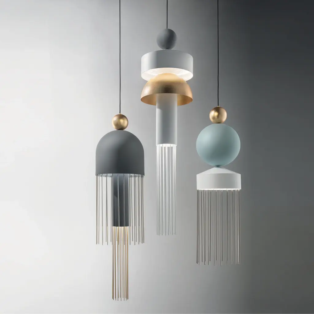 Illuminate your home with the Nappe X2 LED Pendant Light from Masiero. This luxurious and elegant pendant light features a turned metal frame enriched with brushed brass details and adorned with a small brass orb. Combining design elements with geometric shapes and decorative tassels, the Nappe creates a unique and personalized composition for a sophisticated, timeless look. Highlights