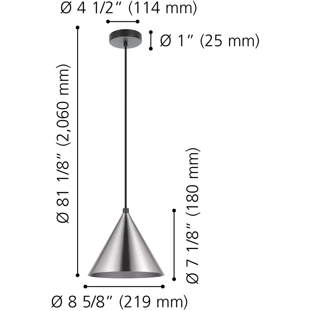 Embrase sytlish simplicity with the Narices One Light Mini Pendant by Elgo. Classic and simple detailing defines this beautiful Pendant. Finished in Structured black and paired with a matte nickel cone shaped metal shade. This Pendant is the perfect way to strike a perfect balnce of the elegant yet minimalist design