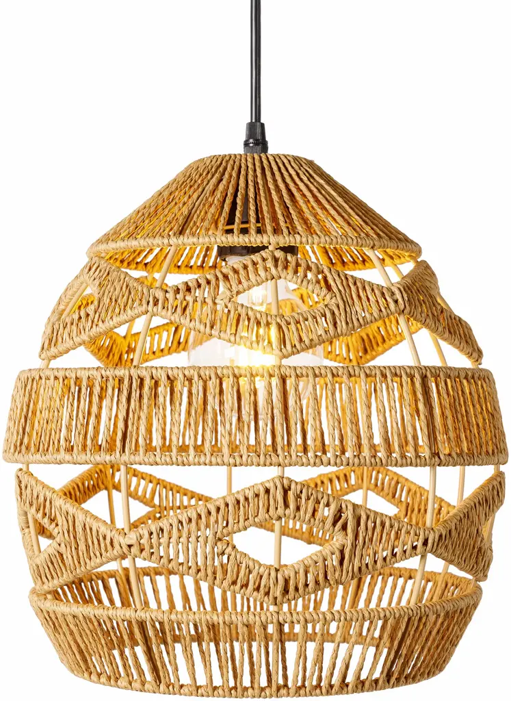 Showcasing decorative patterns with an intricately woven design, this pendant light is sure to wow your guests. The lampshade is made with natural paper and features a dome-shaped silhouette with alternating rows of intricate patterns. Earthy and organic, this accent works best with farmhouses, cottages, and rustic rooms. Made in China, this fixture is UL/CUL certified and includes an 8’ hanging cord. For optimal product care, wipe clean with a dry cloth.