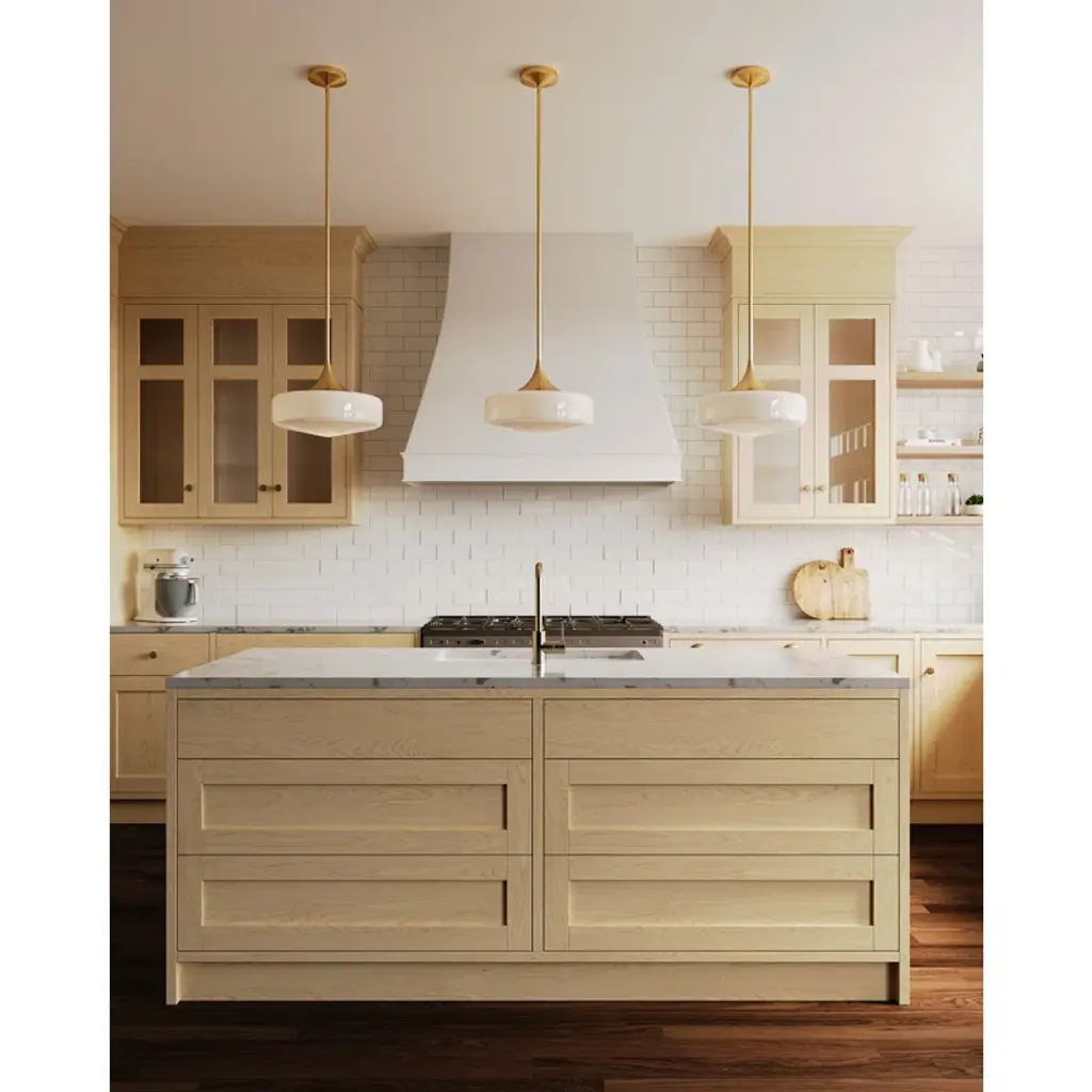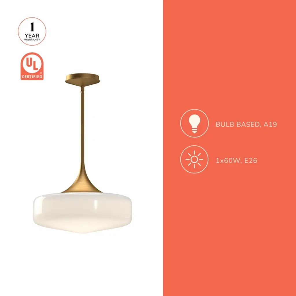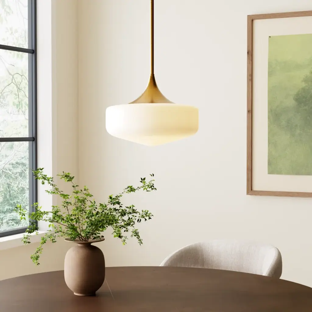 Taking cues from familiar and inviting spaces of old, the collection is sure to captivate. The product's shape is inspired by schoolhouse fixtures made iconic in the 1940s and '50s, plus a touch of modern sensibility. The glossy opal glass shade is ample in size and adorned with organically curved metallic details.