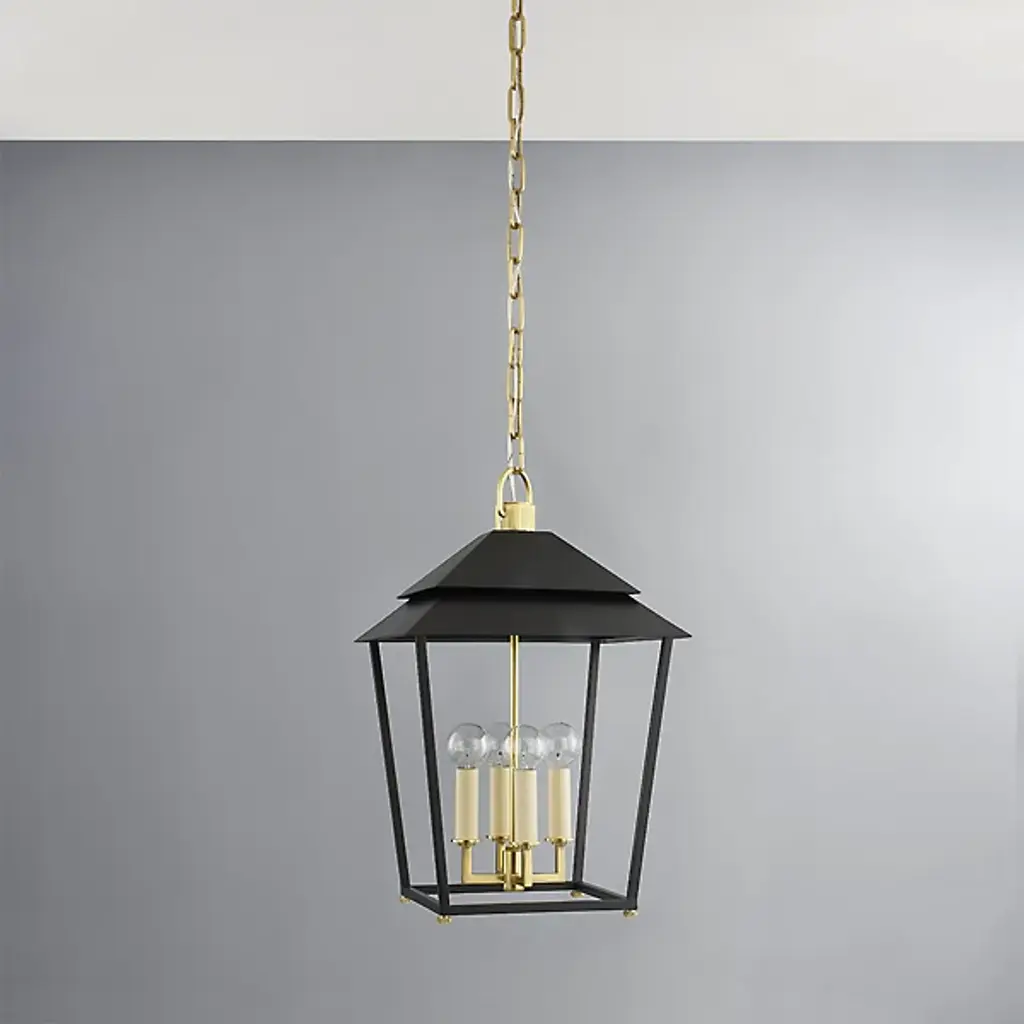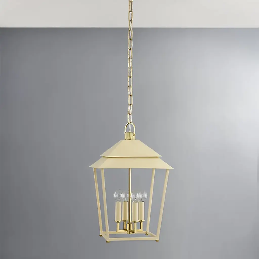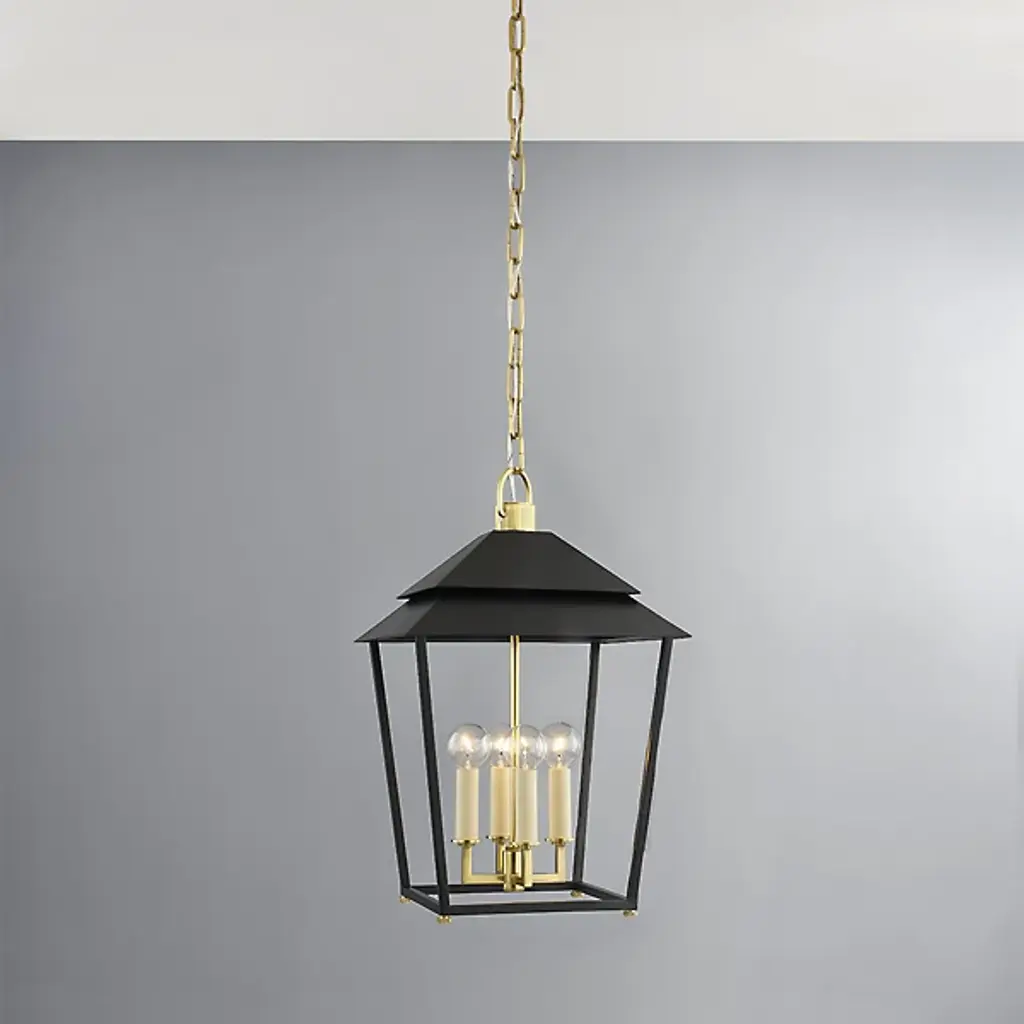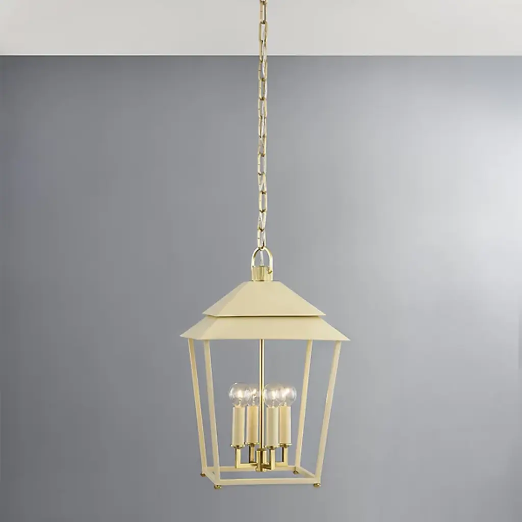 Enjoy candelabra-style illumination with the Natick Pendant by Hudson Valley Lighting. Natick is clean, open, and airy. The double roofline stands out from a traditional lantern, while metal feet and squared arms add to the unique quality of the piece. This pendant is secured by a ceiling canopy attached to a lovely linked chain.
