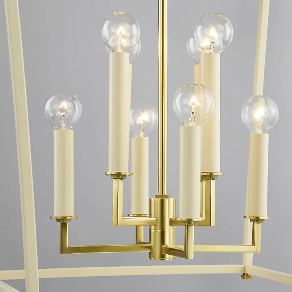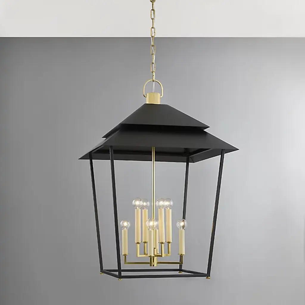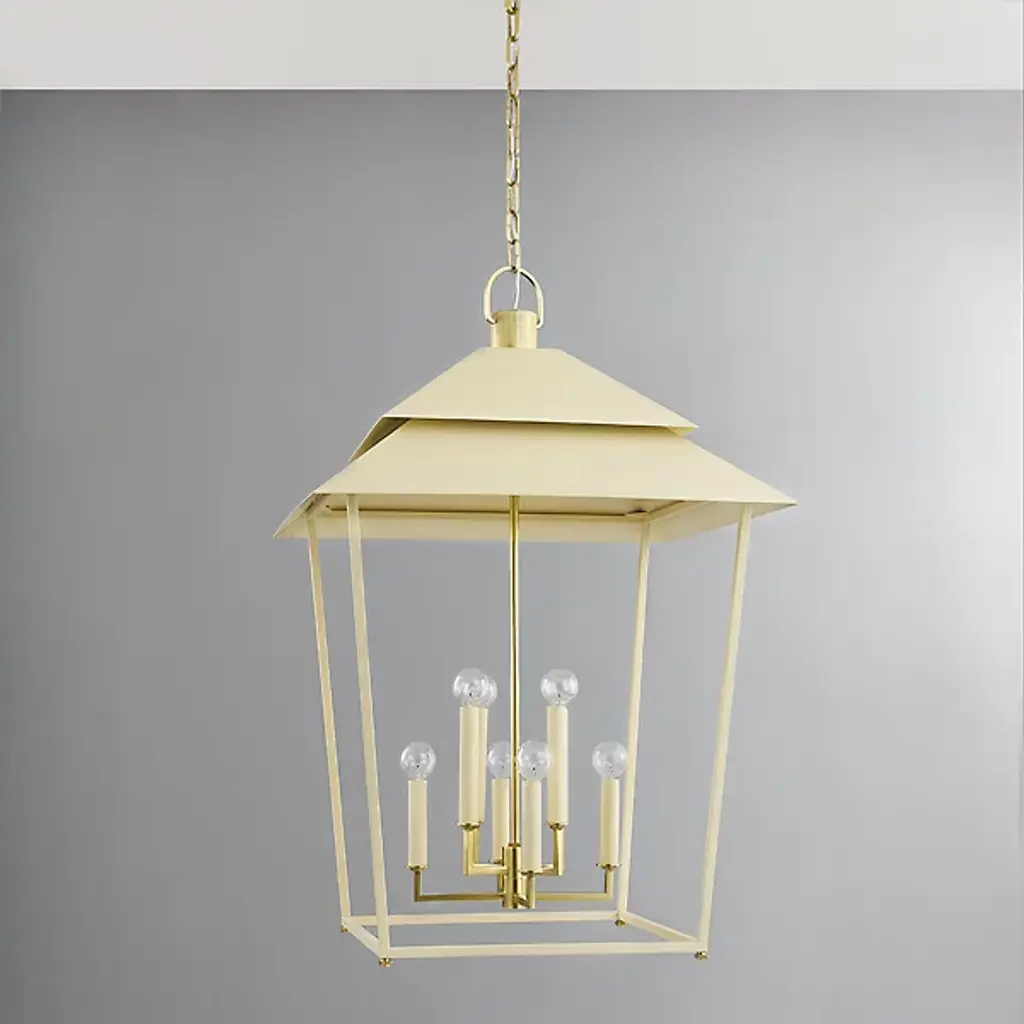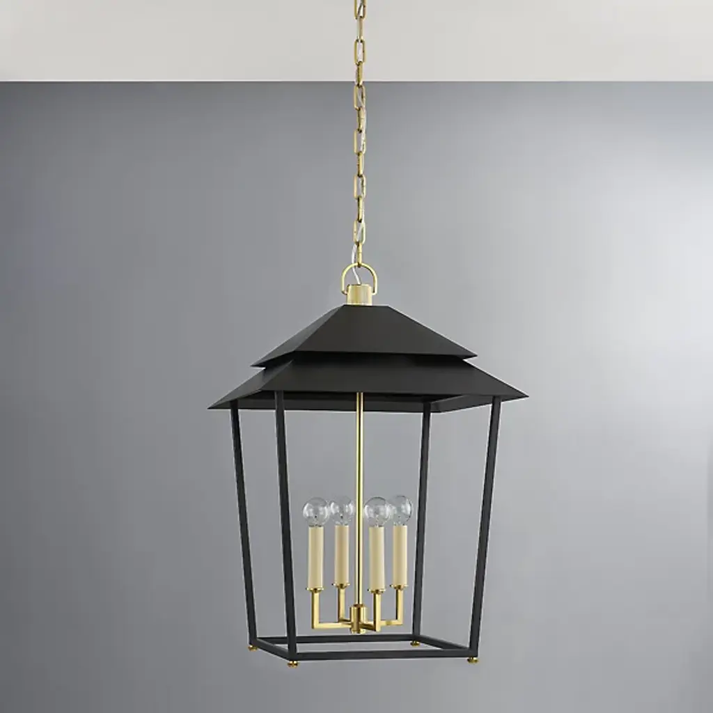 Enjoy candelabra-style illumination with the Natick Pendant by Hudson Valley Lighting. Natick is clean, open, and airy. The double roofline stands out from a traditional lantern, while metal feet and squared arms add to the unique quality of the piece. This pendant is secured by a ceiling canopy attached to a lovely linked chain.