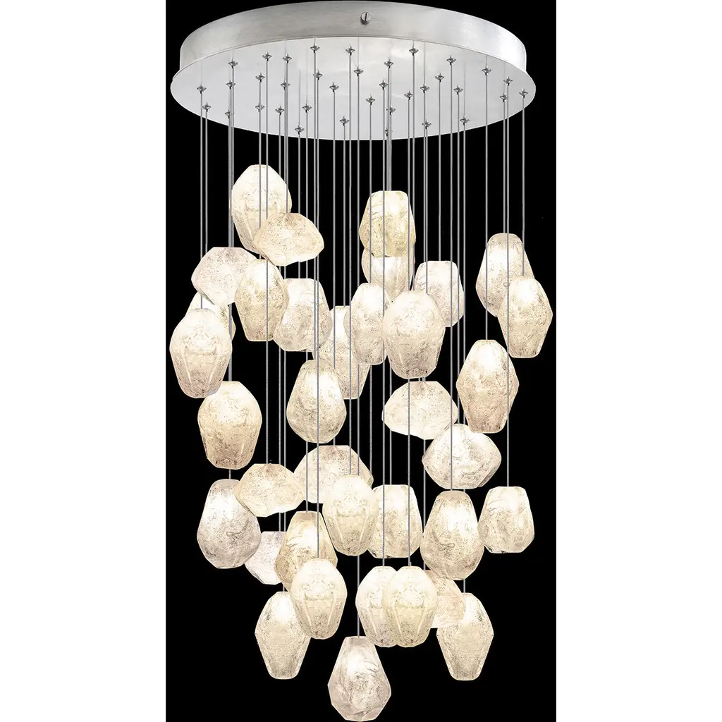 Master glass artisans blend quartz with other minerals to create Natural Quartz glass drop pendant with gold-toned silver leaf canopy. Also available in platinized silver leaf with choice of additional crystal glass options. For 220V, item is configured w