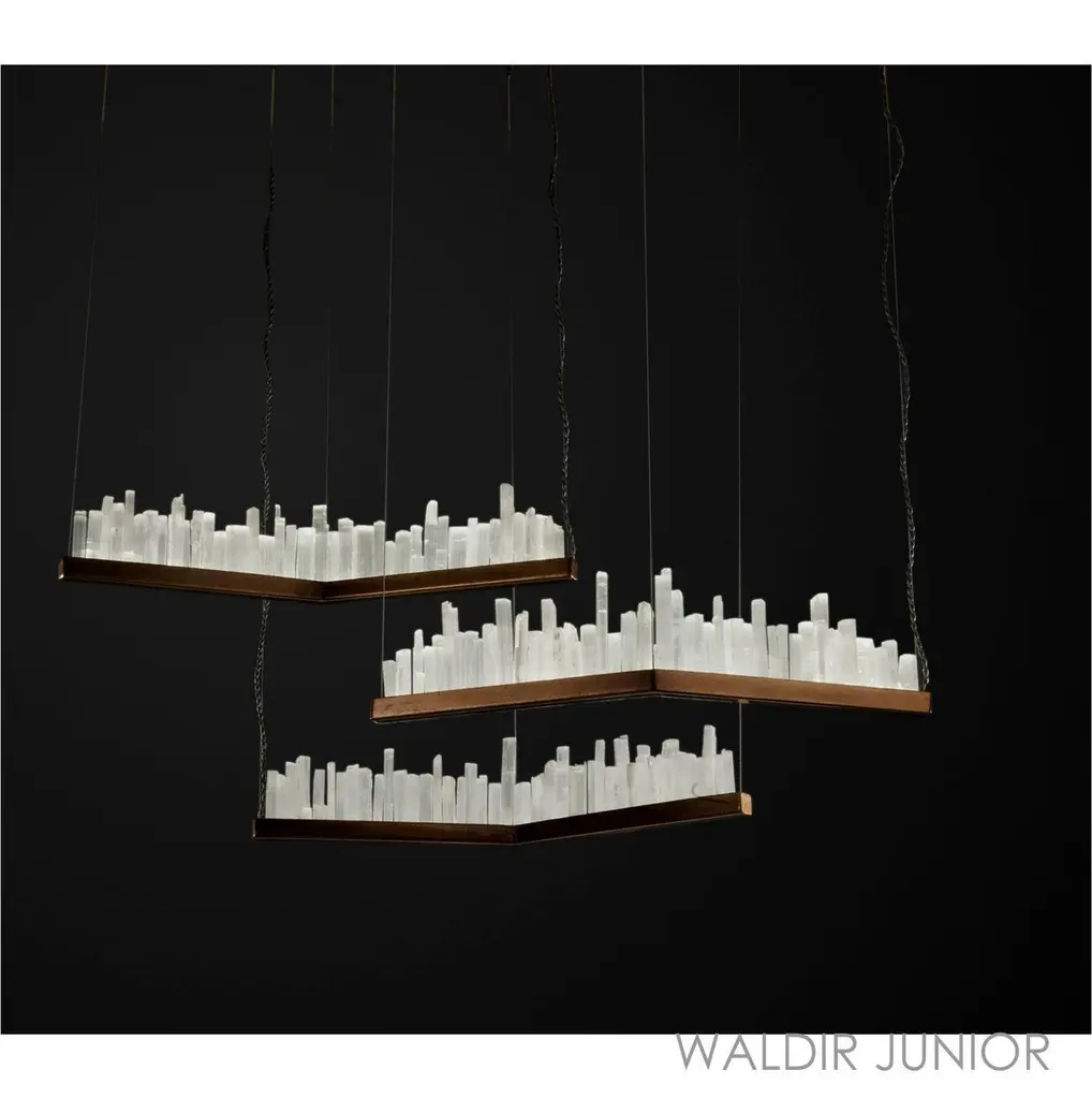 Natural Stone pendant lamp by Aver Dimensions: D 20 x W 75 x H 18 cm Materials: Aluminum, plated. Natural Quartz. Lighting: 01 x 9W LED 600 lumens.Finish: Silver Veneer, Aged Silver Veneer, Gold Veneer, Aged Gold Veneer, Copper Veneer, Aged Copper Veneer, Aged Gold Patina, Antique Patina.All our lamps can be wired according to each country. If sold to the USA it will be wired for the USA for instance.Aver Metais invited Waldir Cury Junior to print his look on lighting and the result couldn't be better, that's how the #Metropropolis Collection was born, inspired by the big cities and the contemporary lifestyle.The history of Aver Metais as a lighting brand begins with Jefferson Aver manufacturing lamps in a completely handcrafted way and with very few resources in the family business. Over the years, the brand has grown and gained recognition. Today, our products are present in several projects by prestigious professionals, in addition to being resold in lighting boutiques in different regions of Brazil. Through its partners, Aver Metais has several participations in important design and architecture exhibitions. In 2015 the company started its internationalization process and today has clients and projects carried out in places like New York, Los Angeles, Chicago, Dallas, Miami, London, Cardiff, Hamburg, Manila, Santa Cruz de la Sierra, and Lima, attesting to the level quality and competitiveness of Aver Metais products.In our factory, each piece is meticulously produced using modern production processes combined with craftsmanship to detail. The result is original pieces that, more than illuminate, are jewels for your home. Over the years, the brand has been dedicated to creating and producing original and high-quality decorative lighting fixtures that can fit into the most varied and demanding interior architecture projects.