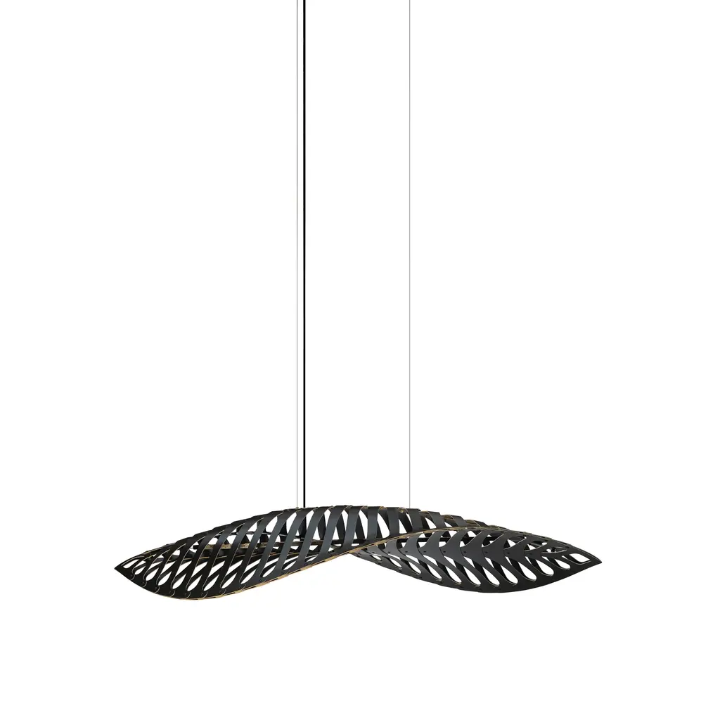For his magnificent feature light Navicula, designer and New Zealand-based outdoorsman David Trubridge went rolling in the deep, at least metaphorically. The layered shape was Inspired by microscopic diatoms, a strain of algae, that float around in the oceans. Thin pieces of bamboo plywood curve and flow, a marvel of computer-assisted woodcutting. Lit from within by a row of LED pinpoint lights, Navicula casts magical patterns in its wake. Flat-packed for eco-friendly shipping and a snap to assemble with furnished nylon clips.