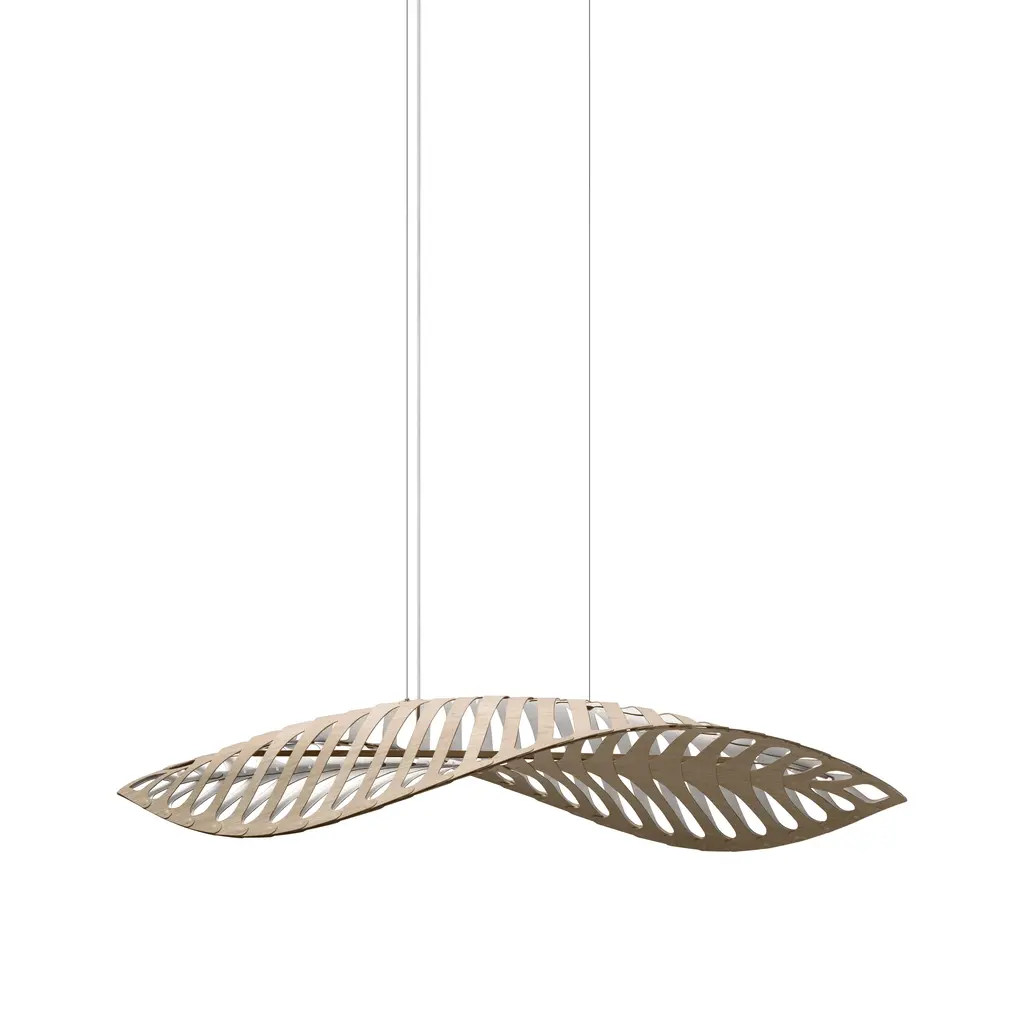For his magnificent feature light Navicula, designer and New Zealand-based outdoorsman David Trubridge went rolling in the deep, at least metaphorically. The layered shape was Inspired by microscopic diatoms, a strain of algae, that float around in the oceans. Thin pieces of bamboo plywood curve and flow, a marvel of computer-assisted woodcutting. Lit from within by a row of LED pinpoint lights, Navicula casts magical patterns in its wake. Flat-packed for eco-friendly shipping and a snap to assemble with furnished nylon clips.