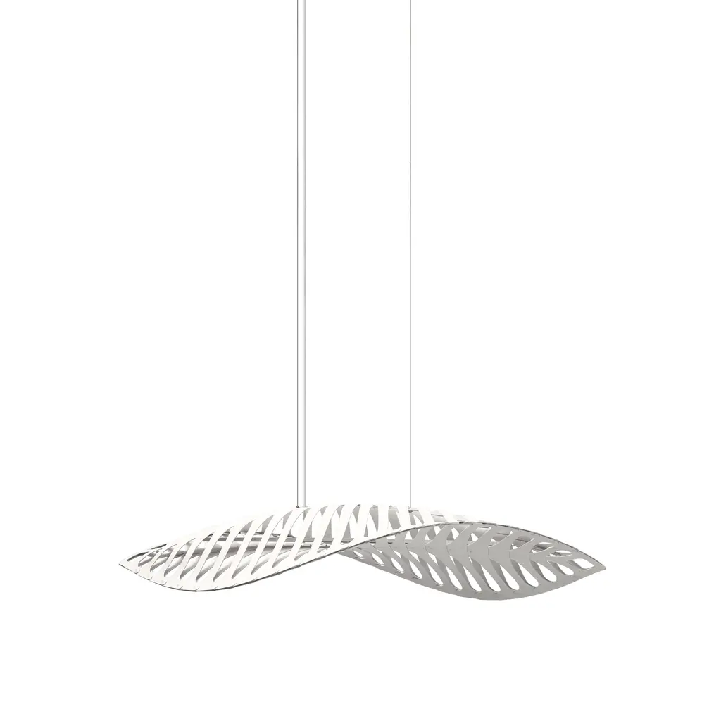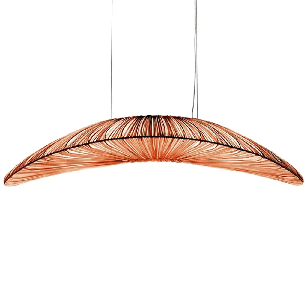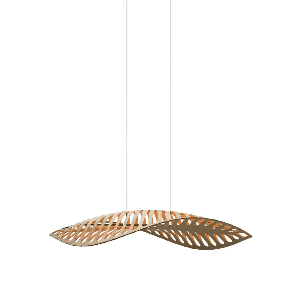 For his magnificent feature light Navicula, designer and New Zealand-based outdoorsman David Trubridge went rolling in the deep, at least metaphorically. The layered shape was Inspired by microscopic diatoms, a strain of algae, that float around in the oceans. Thin pieces of bamboo plywood curve and flow, a marvel of computer-assisted woodcutting. Lit from within by a row of LED pinpoint lights, Navicula casts magical patterns in its wake. Flat-packed for eco-friendly shipping and a snap to assemble with furnished nylon clips.