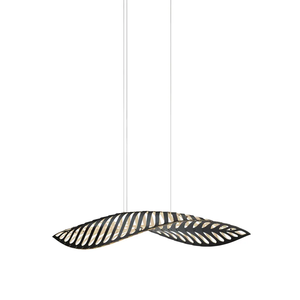For his magnificent feature light Navicula, designer and New Zealand-based outdoorsman David Trubridge went rolling in the deep, at least metaphorically. The layered shape was Inspired by microscopic diatoms, a strain of algae, that float around in the oceans. Thin pieces of bamboo plywood curve and flow, a marvel of computer-assisted woodcutting. Lit from within by a row of LED pinpoint lights, Navicula casts magical patterns in its wake. Flat-packed for eco-friendly shipping and a snap to assemble with furnished nylon clips.