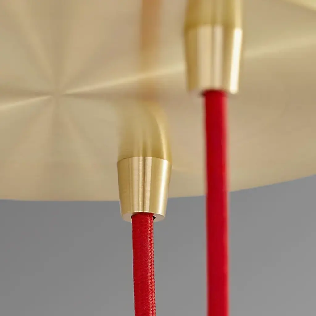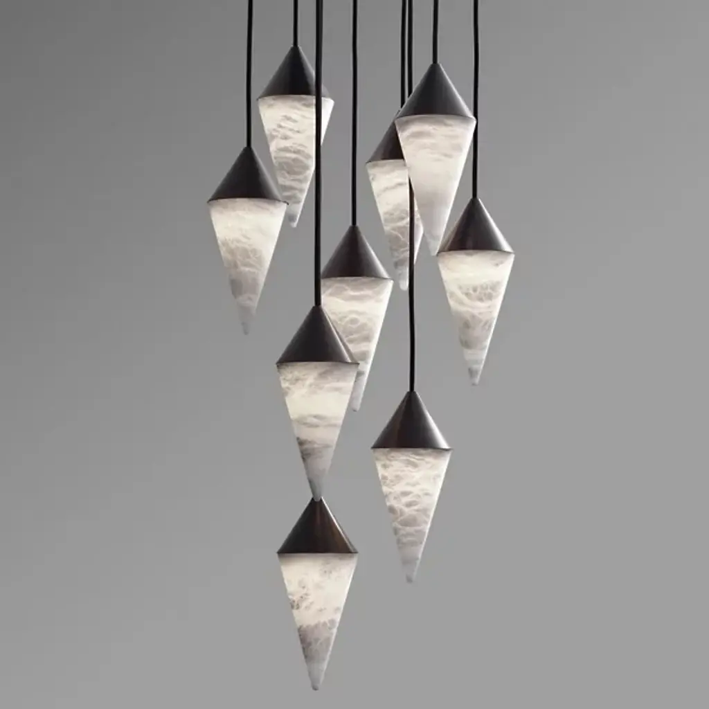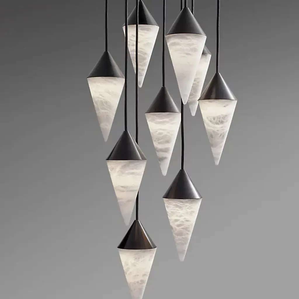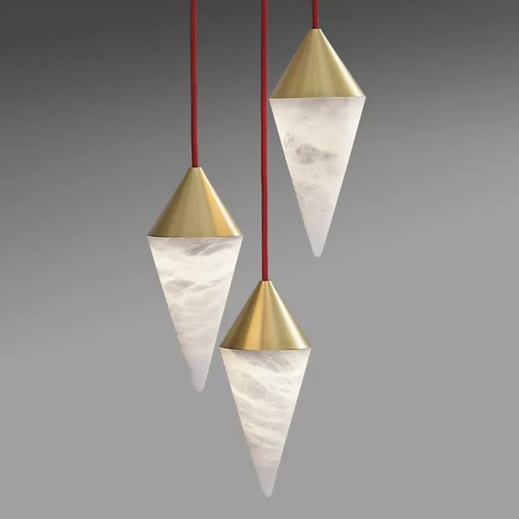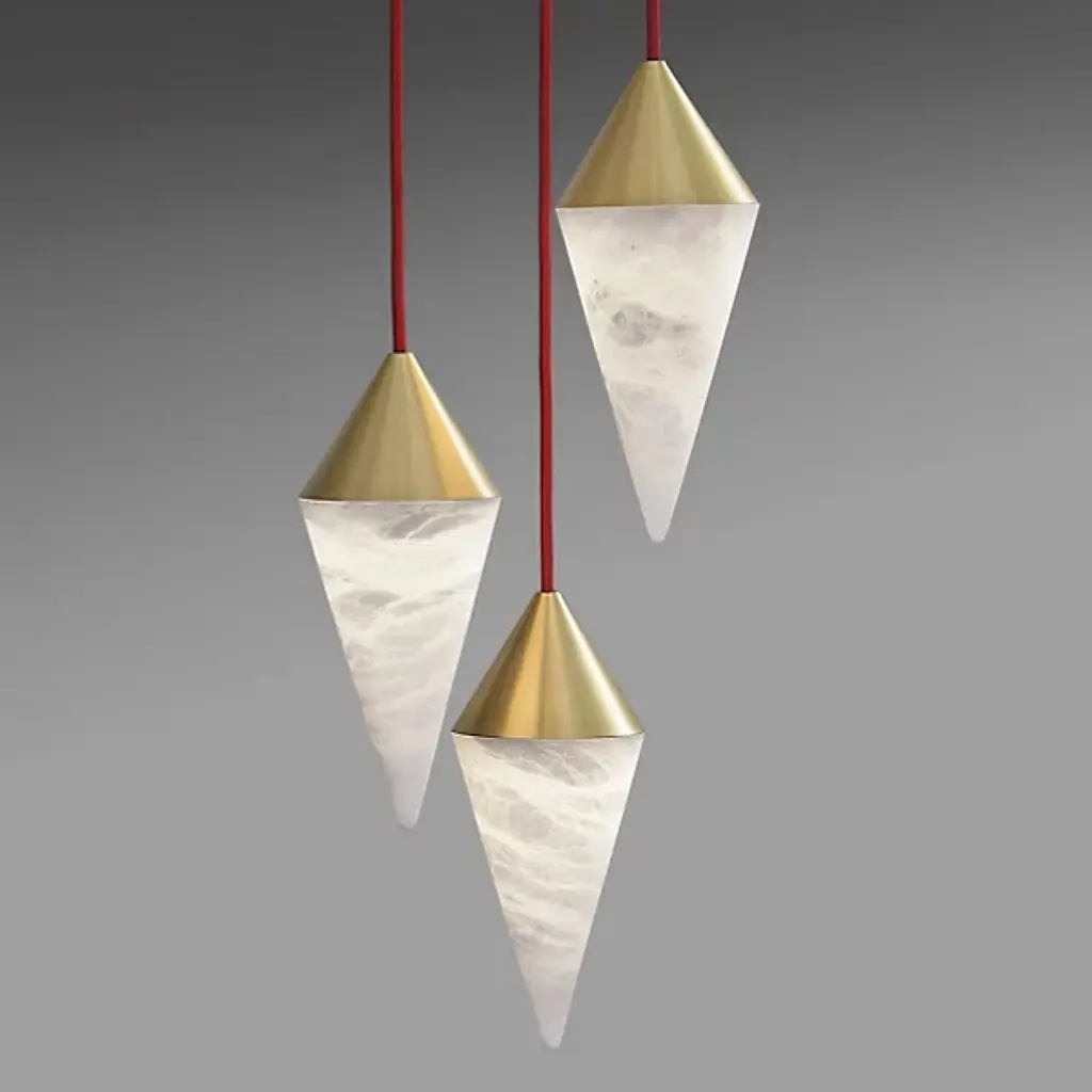 Out of this world. Like bodies of interstellar clouds, the Nebula LED Multi Light Pendant from Boyd Lighting oohs and awes with diffused light and texture-rich imagery. This contemporary piece lets its light and elegant materials speak for themselves with a clean design. From a brass canopy, a group of textile cords drops down with sheer style. Brass cone shades dot the air with a timeless sleekness. Fitted below, alabaster cone shades bring a surge of texture through their natural veining. Artisans enhance the one-of-one quality of each alabaster piece by carving them by hand in a handsome cone form. When turned on, the alabaster transforms into a mesmerizing, flowing image radiating with soft ambient light.