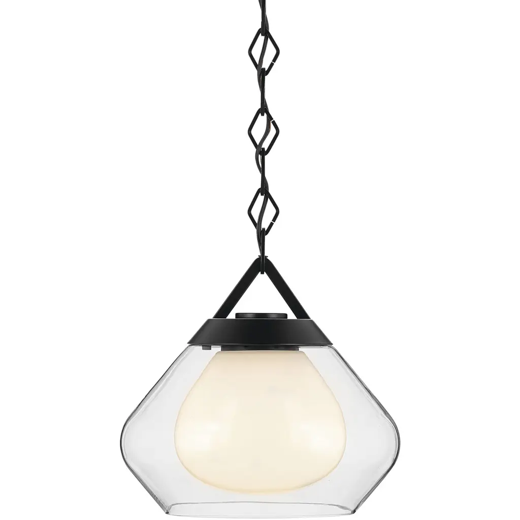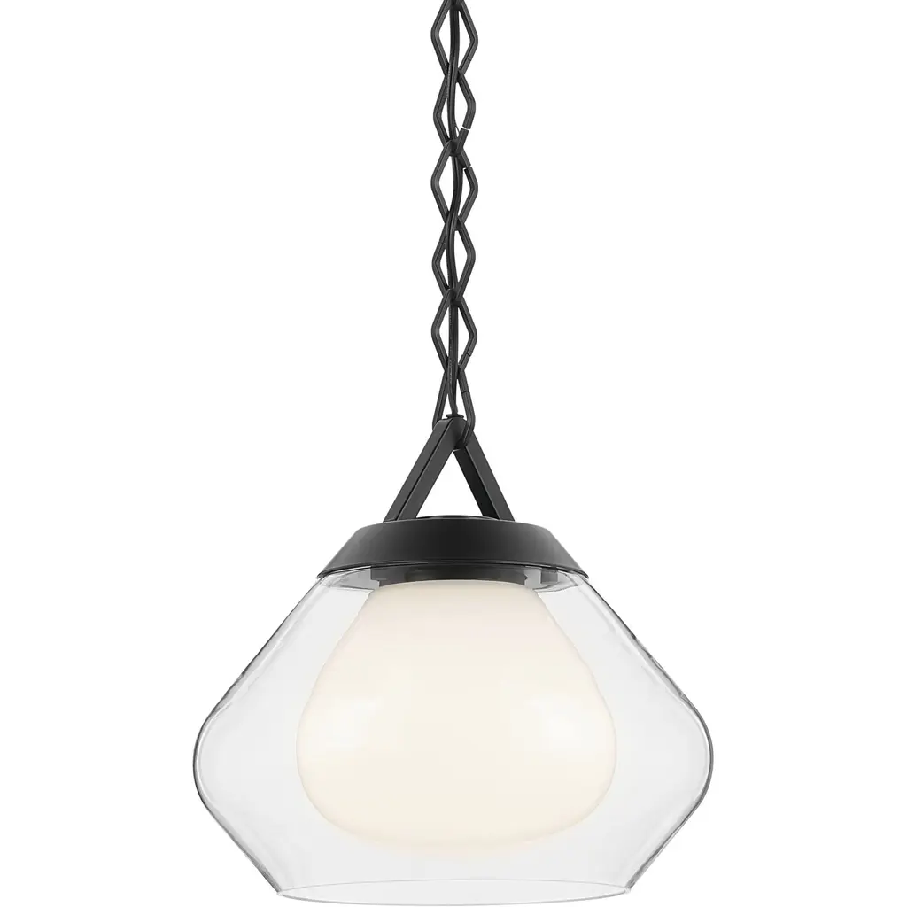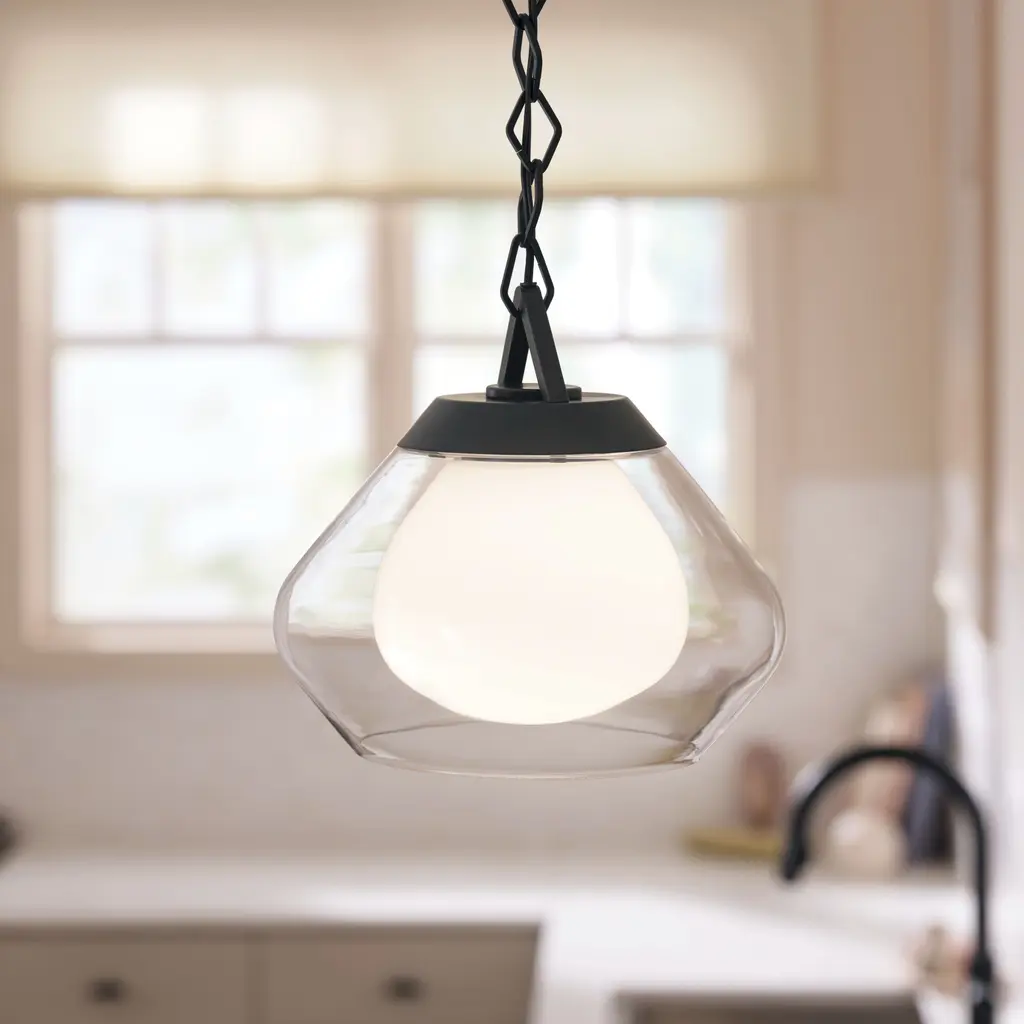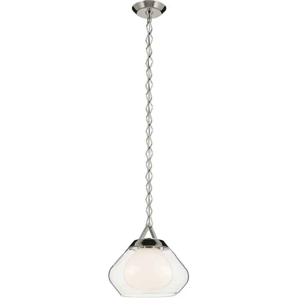 The Nella pendant captivates through its geometric shapes. The chain features diamond-shaped links, gracefully cascading down from the ceiling to reveal light encased in layered glass. This evolution of the popular globe shape has two glass layers. The outer later is clear glass, and the inner layer is cased opal glass. It comes together for a pendant unlike any other.