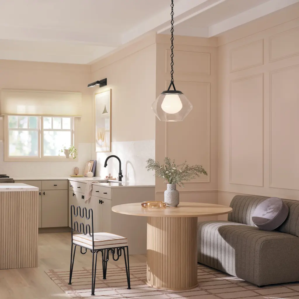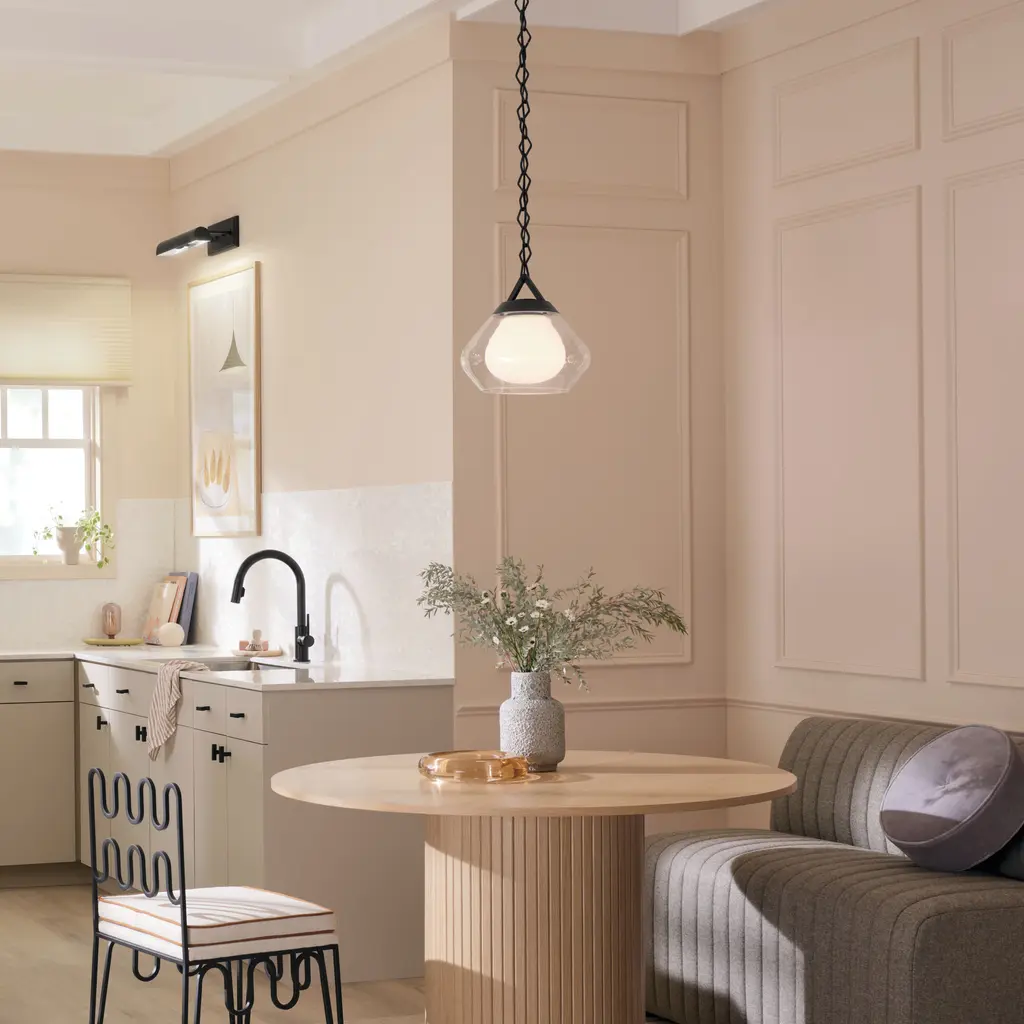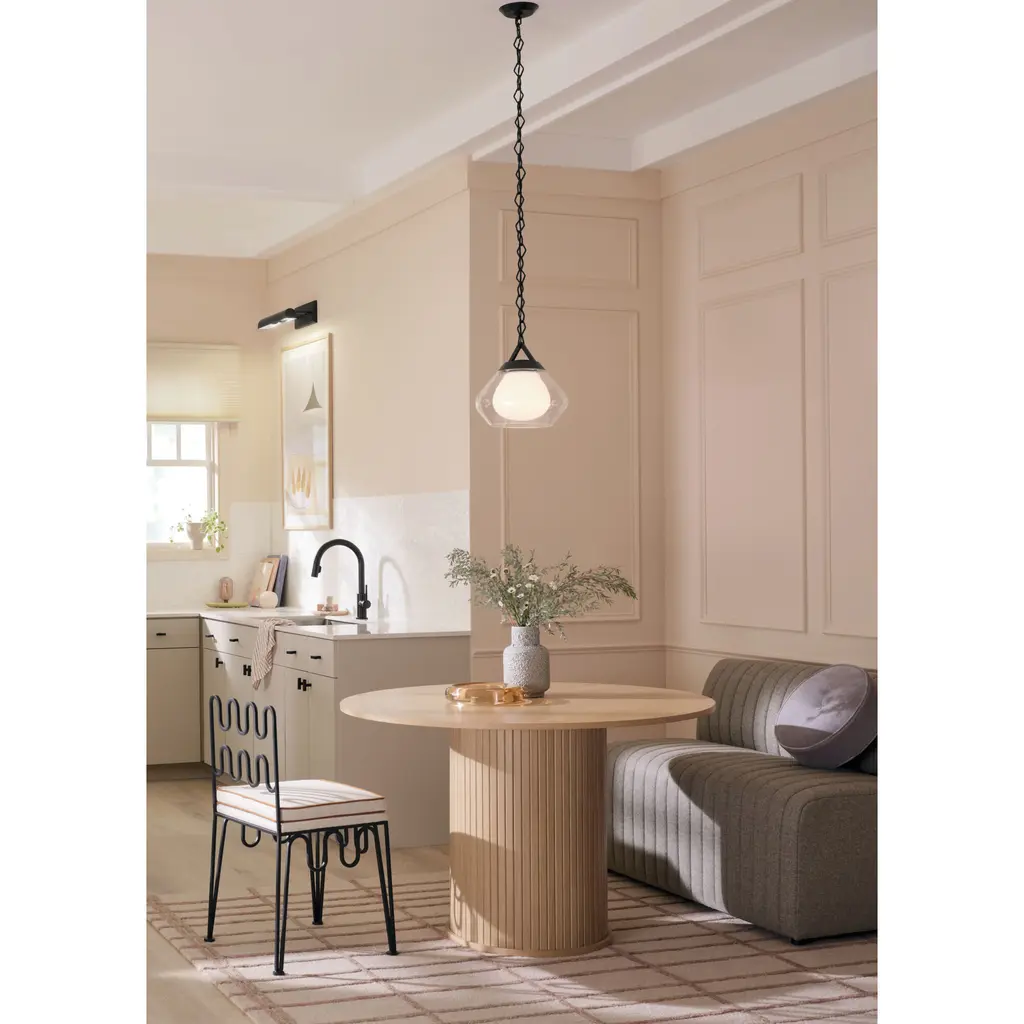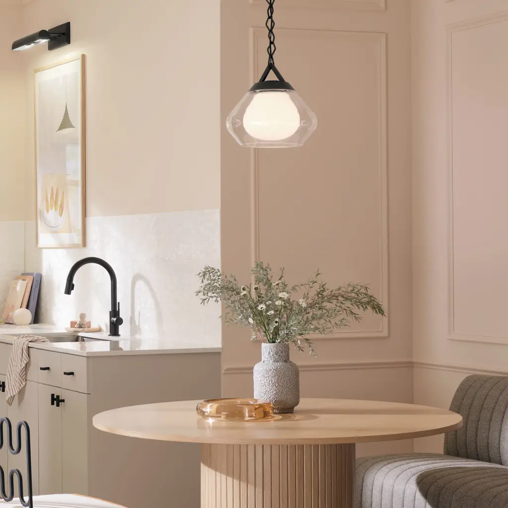 The Nella pendant captivates through its geometric shapes. The chain features diamond-shaped links, gracefully cascading down from the ceiling to reveal light encased in layered glass. This evolution of the popular globe shape has two glass layers. The outer later is clear glass, and the inner layer is cased opal glass. It comes together for a pendant unlike any other.