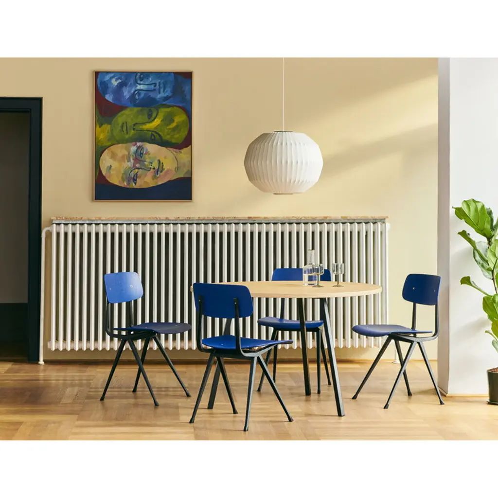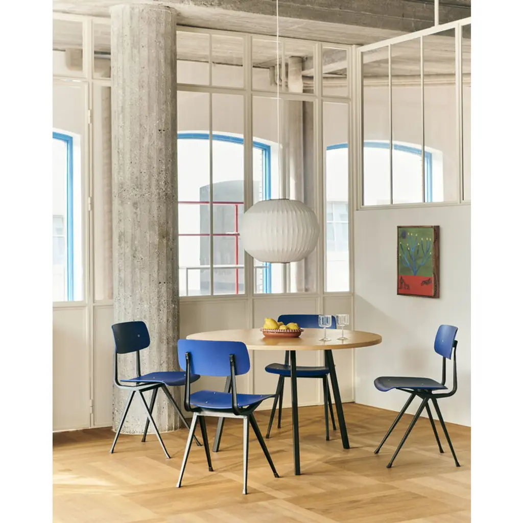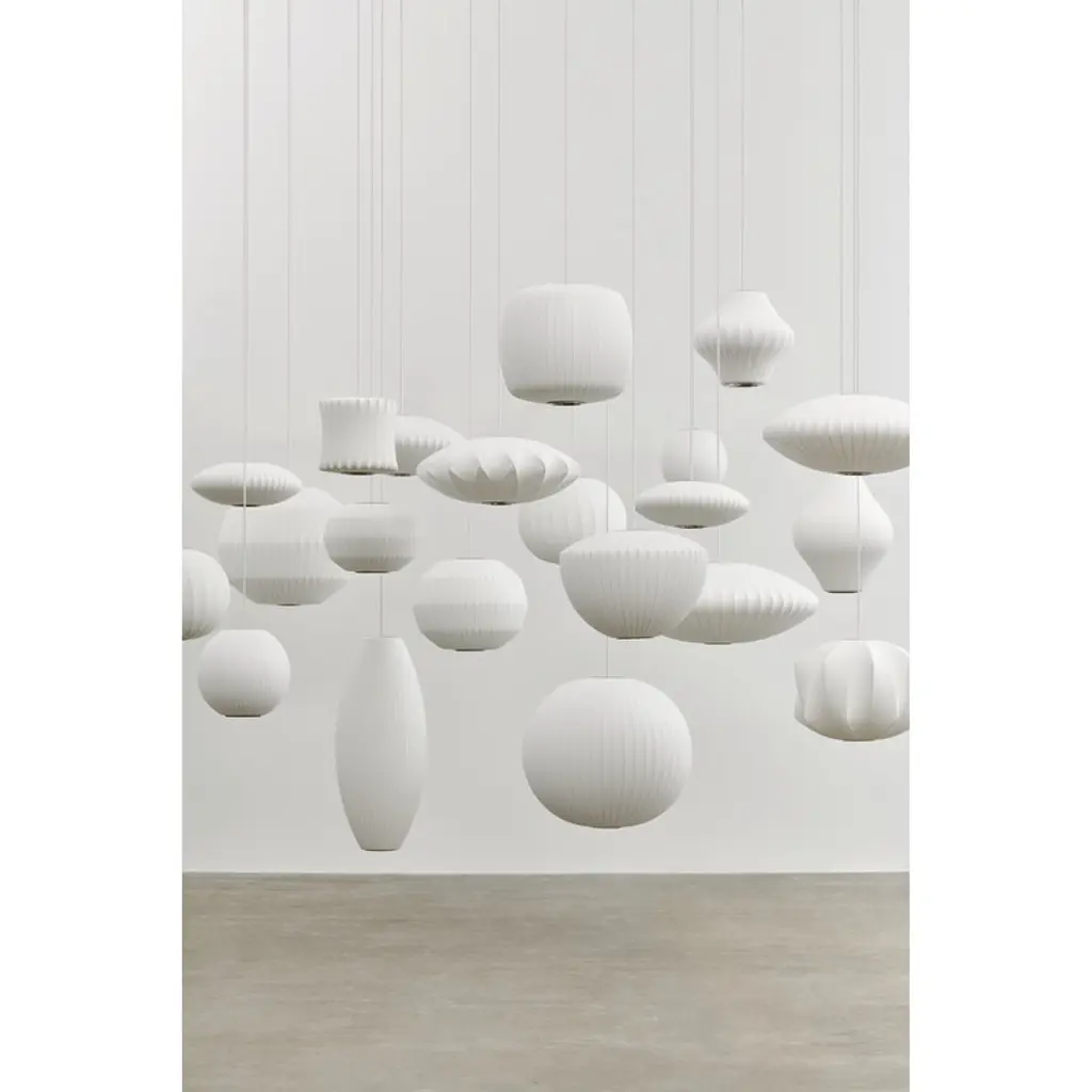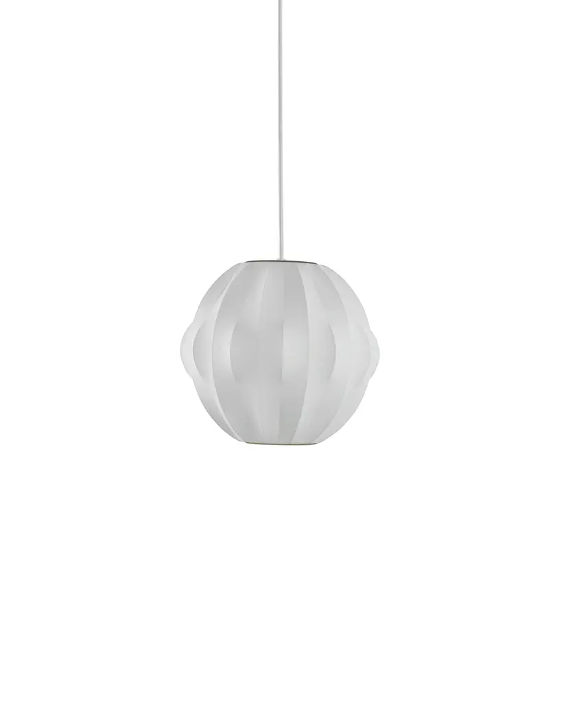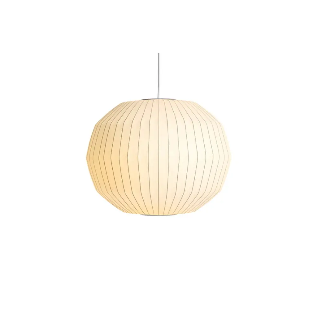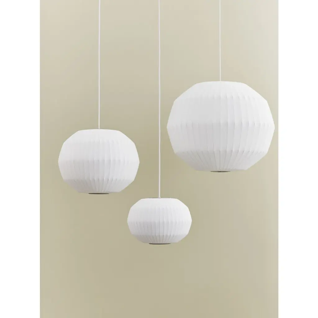 HAY's Nelson Angled Sphere Bubble pendant has an angular rounded silhouette that is created by spraying a translucent plastic polymer over a steel-wire frame. This allows the pendant to emit a soft, diffused light that creates an inviting atmosphere in any room. The Nelson Angled Sphere Bubble luminaire is a stylish illuminator suited for various spaces in homes, cafés, hotels as well as offices. The medium-sized Nelson Angled Sphere Bubble is part of a lighting series designed by George Nelson and produced by Herman Miller in the 1950s. Nelson wanted to purchase a similar Swedish lamp made of silk, but instead, opted for designing his own version of the pendant to save time and money. The lamps in the collection are still manufactured at the same factory that originally started manufacturing them in 1952.