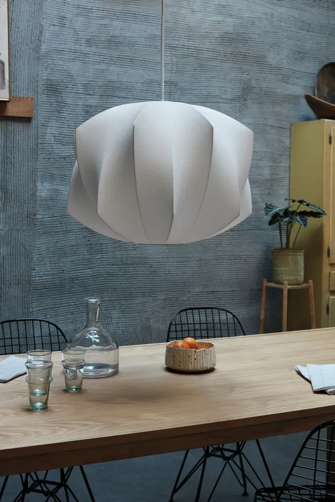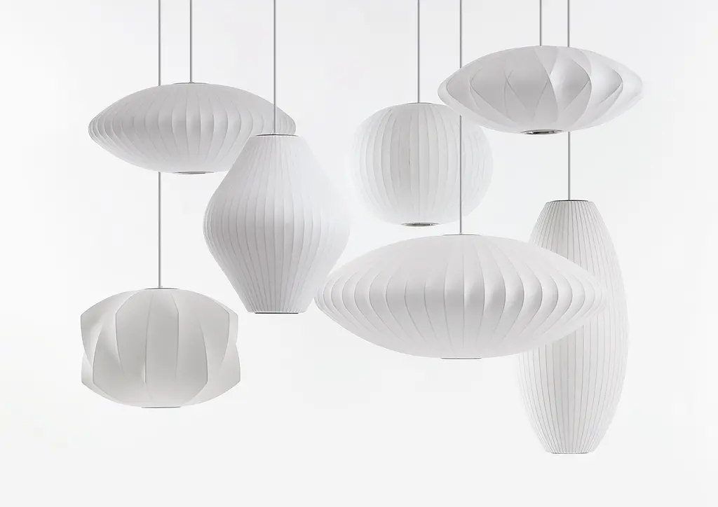 The Nelson Propeller Bubble Pendant (1952) has an angular, twisting pattern across its shade, adding dimension to its spherical form. Designed to float delicately overhead, this handcrafted hanging Bubble Light comes with nickel-plated mounting hardware and in two cord lengths. The Nelson Propeller Hanging Light is produced in collaboration with the George Nelson Foundation. Bulb (not included): LED, CFL, or incandescent; E26 base; 150W. UL Listed.