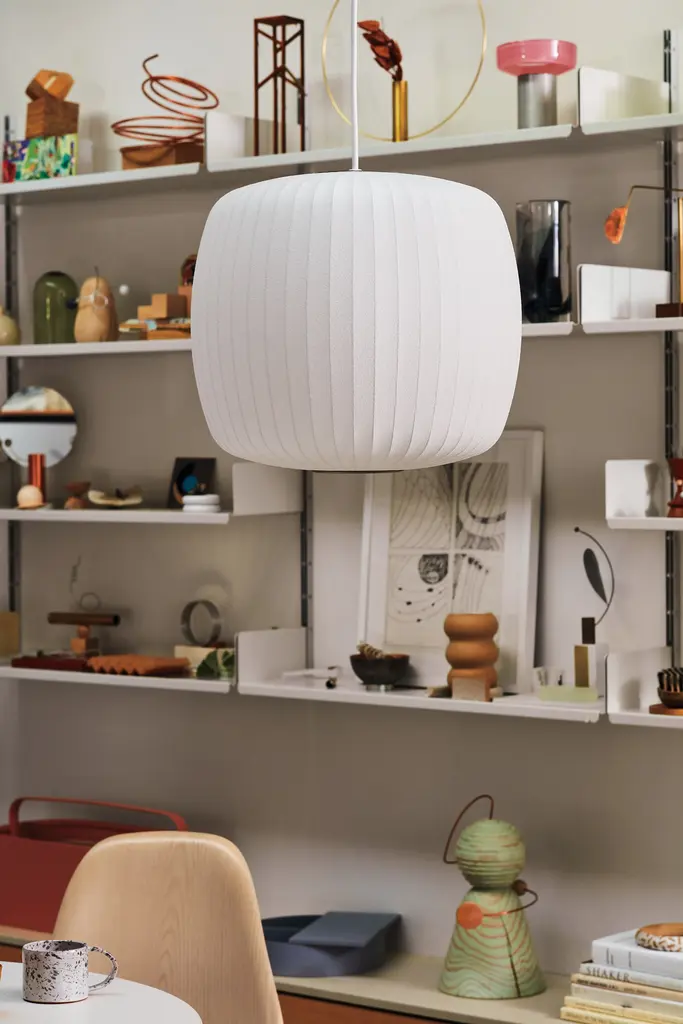 With its squarish form and rounded edges, the Nelson Roll Bubble Pendant (1952) plays with shape and geometry. The fixture comes with nickel-plated mounting hardware and in a choice of two cord lengths. The Nelson Pendant Lamp is produced in collaboration with the George Nelson Foundation. Bulb (not included): LED, CFL, or incandescent; E26 base; 150W. UL Listed.