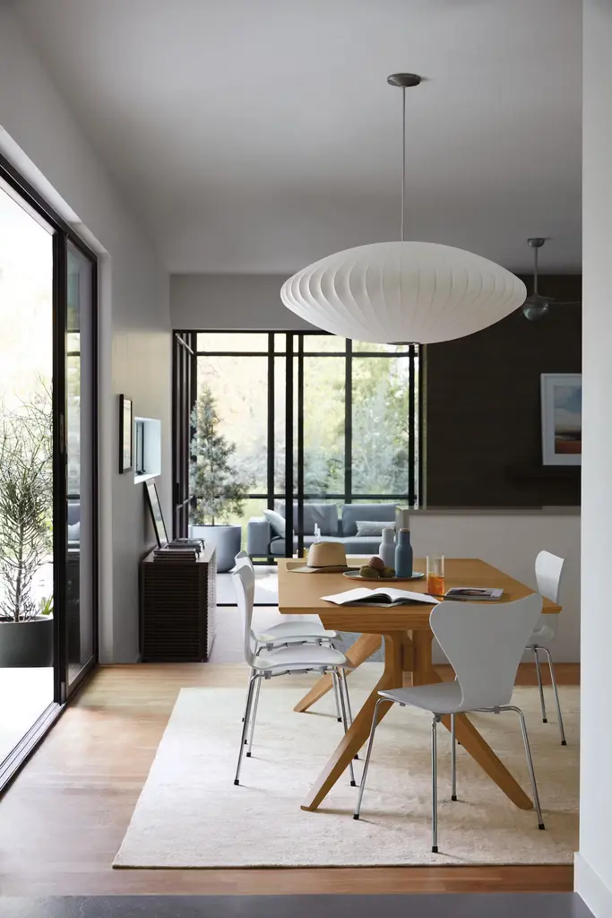 While outfitting his office, architect and Herman Miller design director George Nelson discovered a silk-covered Swedish hanging lamp that he coveted but found too expensive. He then recalled seeing a photo in the paper of Liberty ships being mothballed “by having the decks covered with netting and then being sprayed with a self-webbing plastic," which got him thinking. “And then, Whammo!" Inspiration struck, and by the next night, Nelson had designed his first Bubble Lamp (1952) by spinning a skeleton of steel wires on a turntable and shooting it with translucent plastic until it was covered in a smooth, washable film. “When you put a light in it, it glowed," he said. This is the authentic Bubble Lamp, produced in partnership with the George Nelson Foundation. Bulb (not included): LED, CFL or incandescent; E26 base; 60W max for small, 150W max for others. UL Listed.