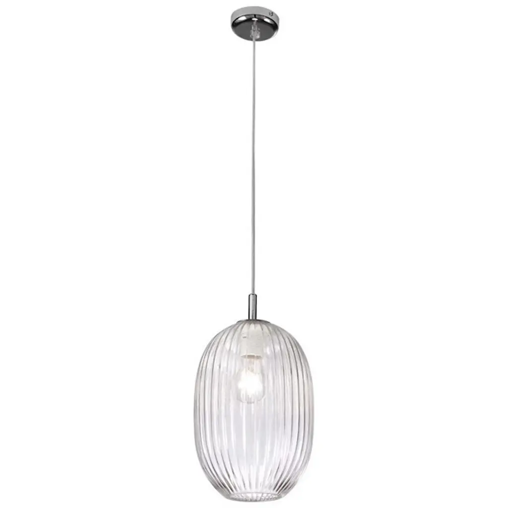 An elegant, artistic fixture that is well-suited to modern spaces. The Italian-made Nest 501 Mini Pendant from Metal Lux descends from a metal disc canopy via a slender cable that terminates in a downward-facing single-socket lamp. The light is set inside an oval shade of translucent glass with vertical, linear accents and a small circular bay at its base. This shade structure artfully restricts direct light from the lamping, exchanging glare for a soft, even wash of ambient light accentuated by a small splash of direct downlight.